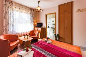 Nichtraucherzimmer; Raucherzimmer nach Absprache durch Zimmerwechsel möglich. TV- und Telefonanschluß, Sitzgruppe mit Tisch und teilweise eine zusätzliche Couch, Doppelbett mit Bandscheibenmatratzen, DU/WC gefliest, ruhige u. sonnige Lage, inklusive Bettwäsche und Handtücher. Behindertenfreundlich und Rollstuhlgerecht dazu bitte anfragen.