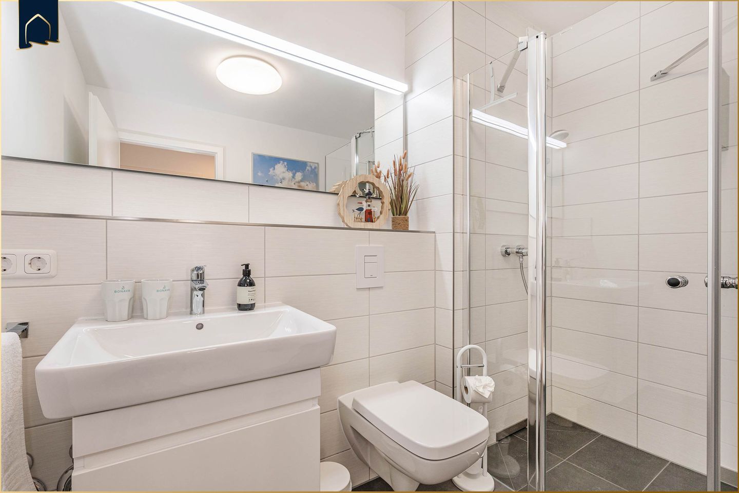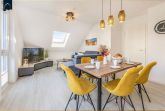 Die offene Wohnküche ist mit allem ausgestattet, was das Herz begehrt: Ceranherd, Backofen, Mikrowelle, Spülmaschine, Kühlschrank mit Gefrierfach, Kaffeemaschine, Espressomaschine, Toaster und Wasserkocher. Für Unterhaltung sorgen zwei große Flachbild-TVs mit Kabelanschluss und WLAN in der gesamten Wohnung. Die moderne Einrichtung mit gemütlicher Sofaecke, Garderobe und Essbereich schafft eine wohnliche Atmosphäre – auch bei längerem Aufenthalt.