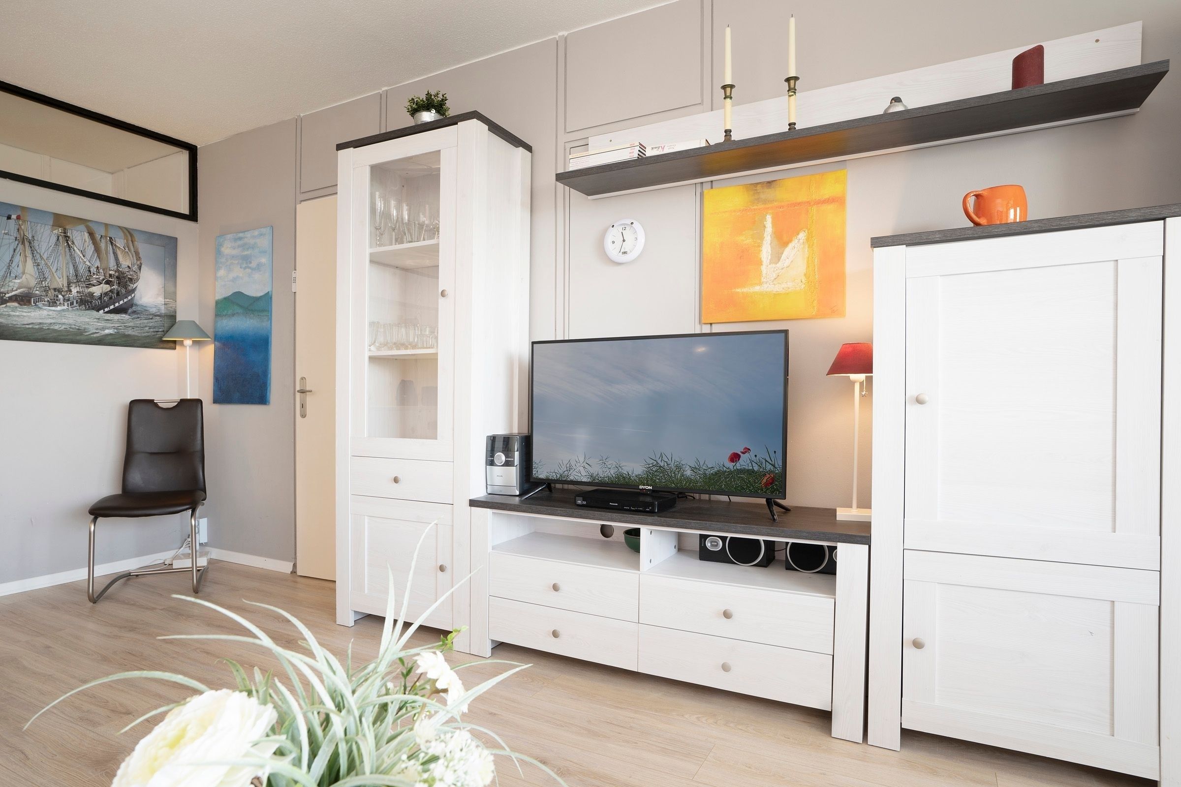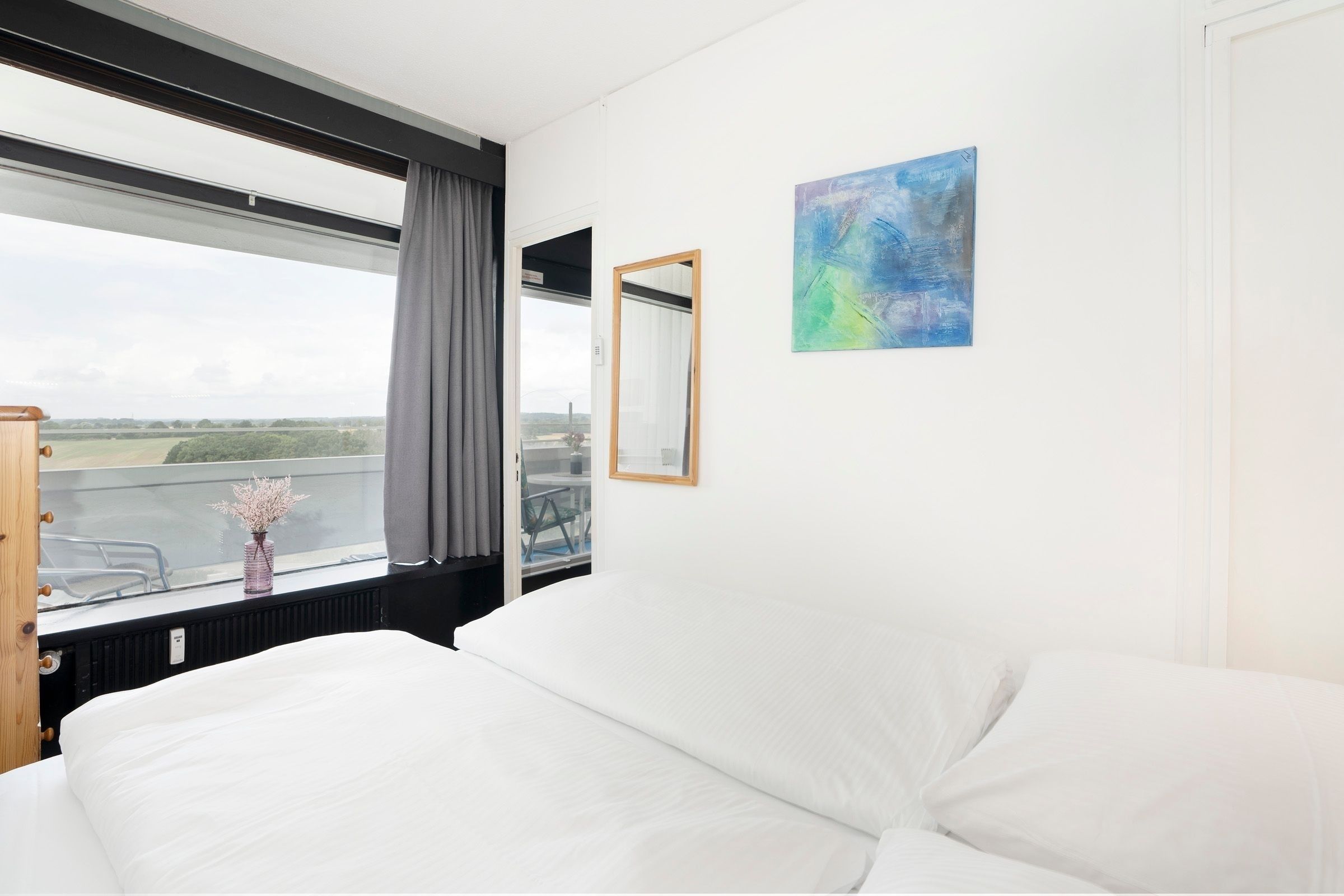 Ein kleiner Flur heißt Sie willkommen und führt direkt in den gemütlichen Wohnbereich. Hier laden ein großes Ecksofa und die harmonisch integrierte Essecke mit großem Esstisch zu entspannten Stunden ein – sei es bei einem Filmabend oder einer geselligen Spielrunde. Von hier aus gelangen Sie auf den überdachten Balkon, der mit einem traumhaften seitlichen Blick auf die Ostsee bis hin zur Lübecker Bucht sowie über die Felder der Holsteinischen Schweiz begeistert. In der separaten, voll ausgestatteten Küche können Sie kochen wie zu Hause. Das Hauptschlafzimmer verfügt über ein komfortables Doppelbett (2x 80x200 cm) und eine Kommode, das zweite Schlafzimmer ist mit einem Etagenbett (je 80x200 cm) und einem Kleiderschrank eingerichtet. Das helle Duschbad ergänzt die Wohnung perfekt.