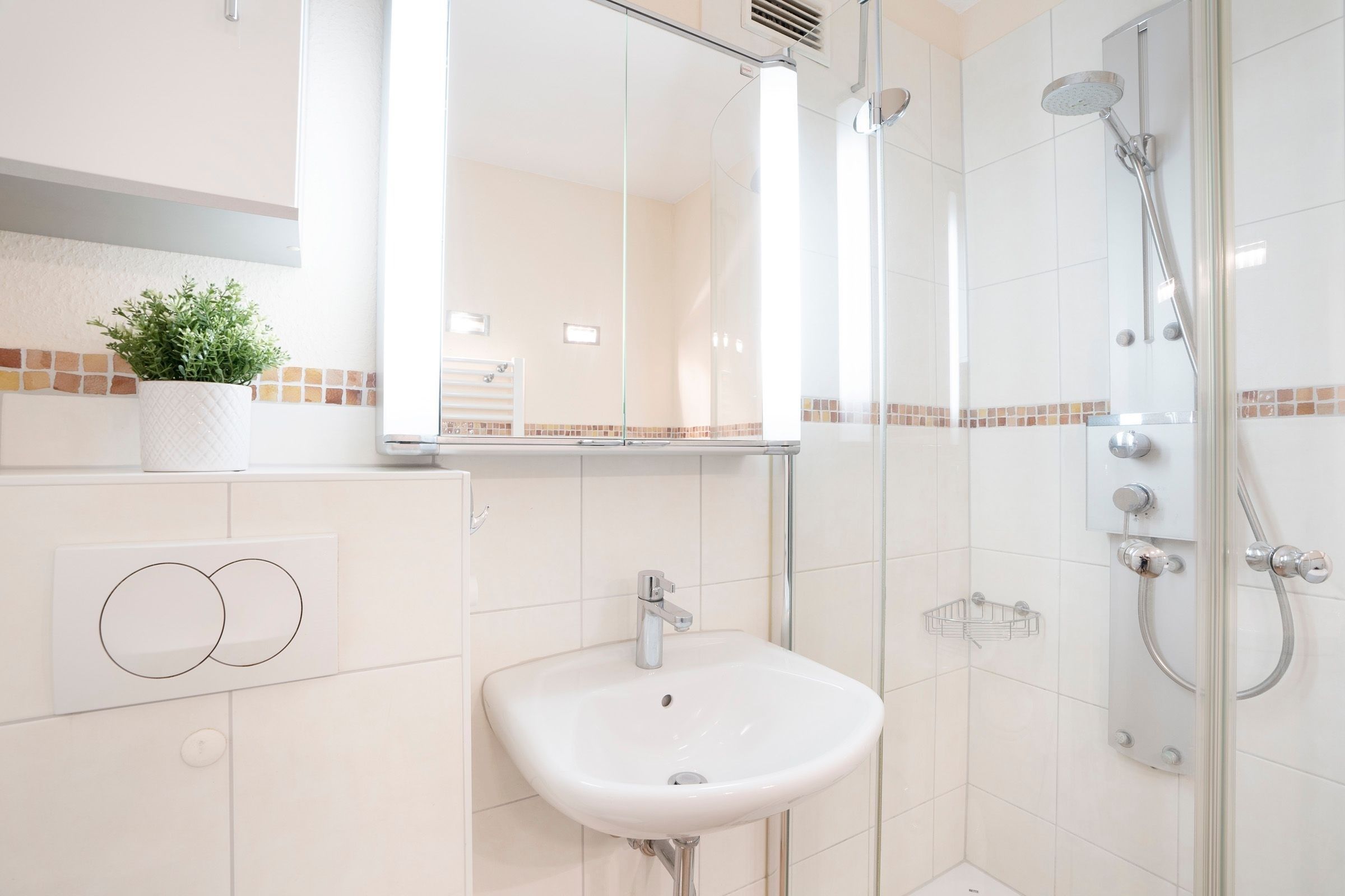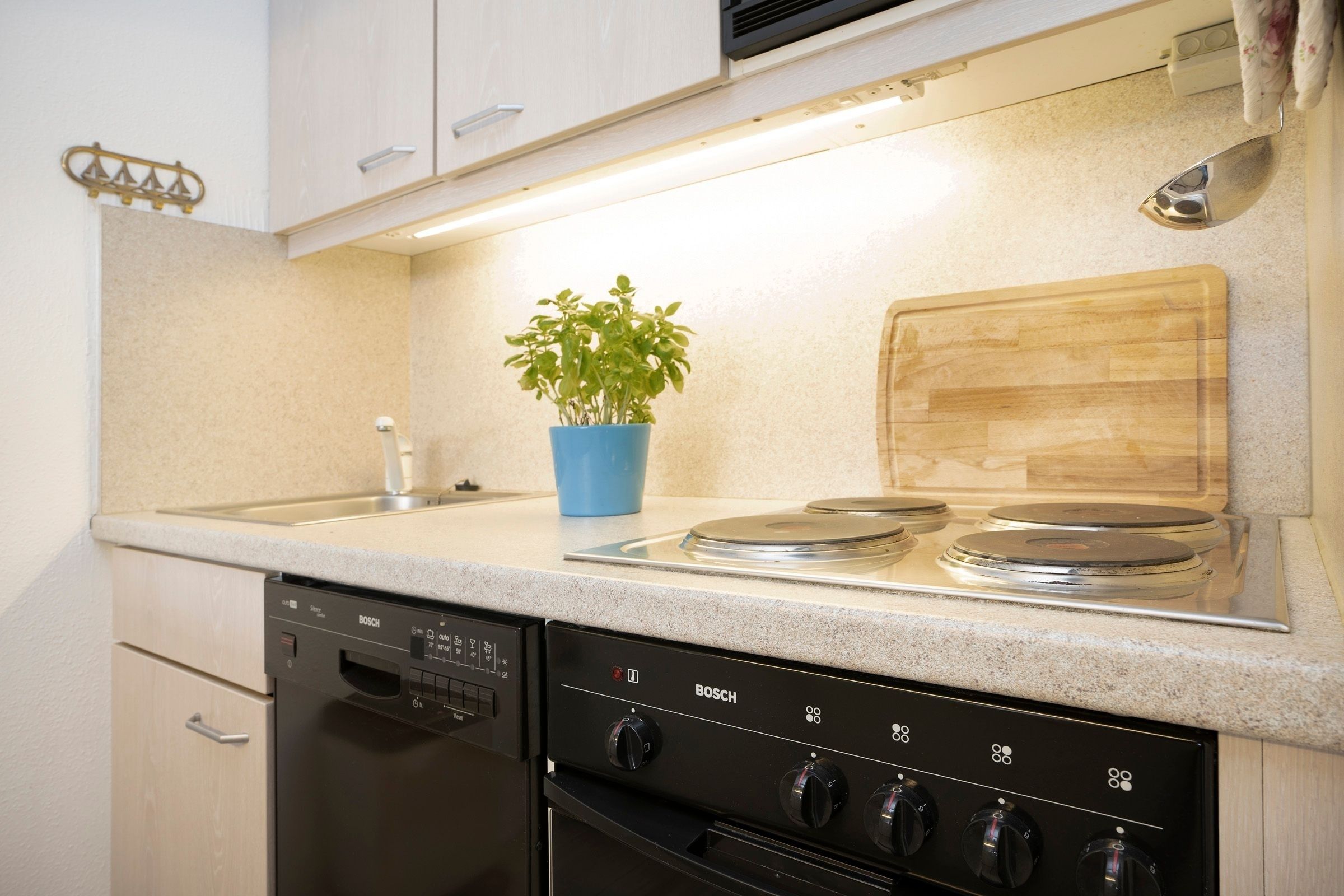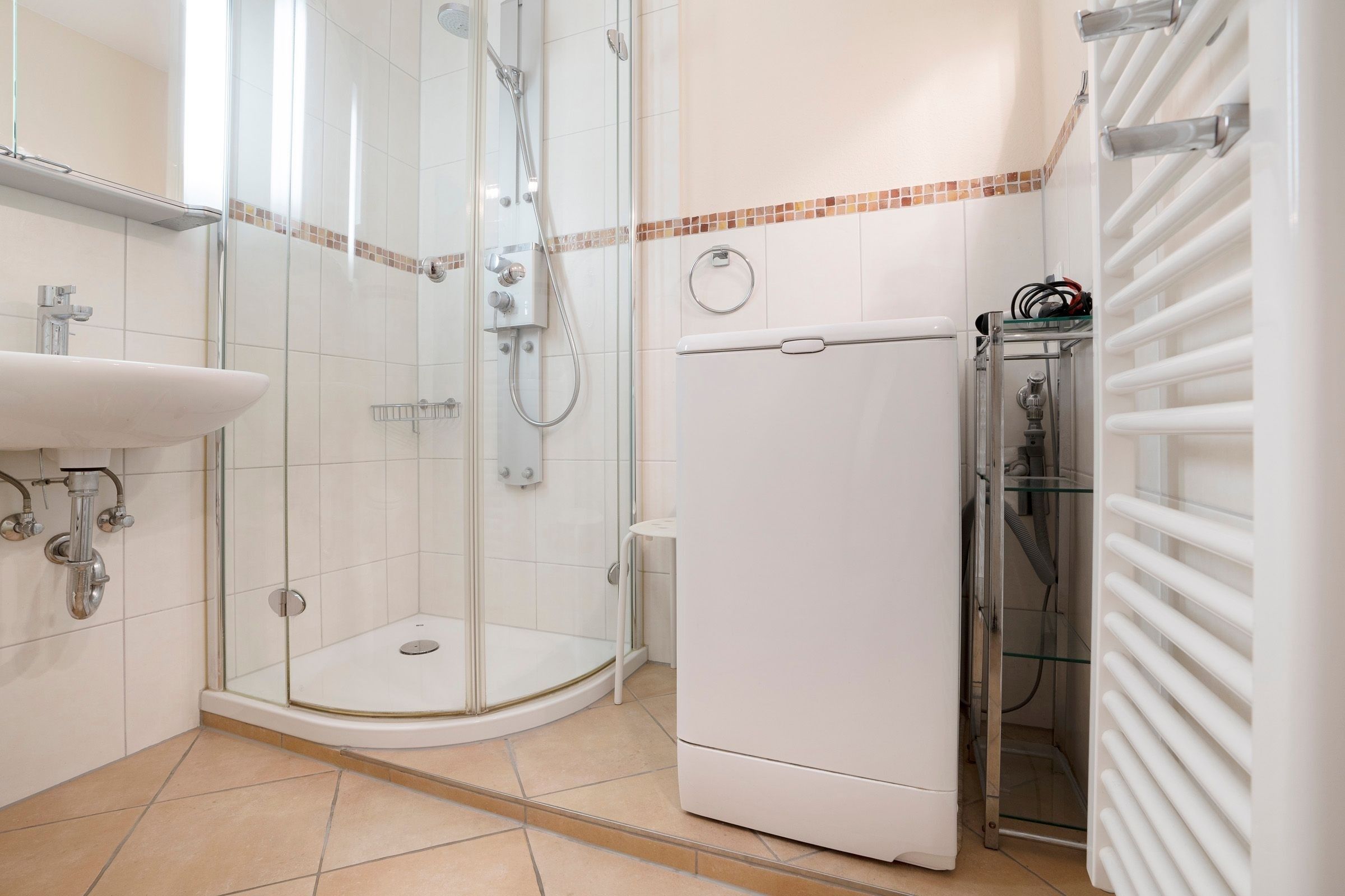 Für Familien steht ein Hochstuhl bereit, und auch eine Waschmaschine mit integriertem Trockner sorgt für zusätzlichen Komfort.