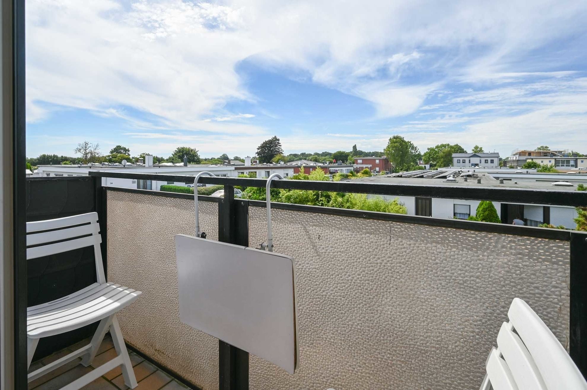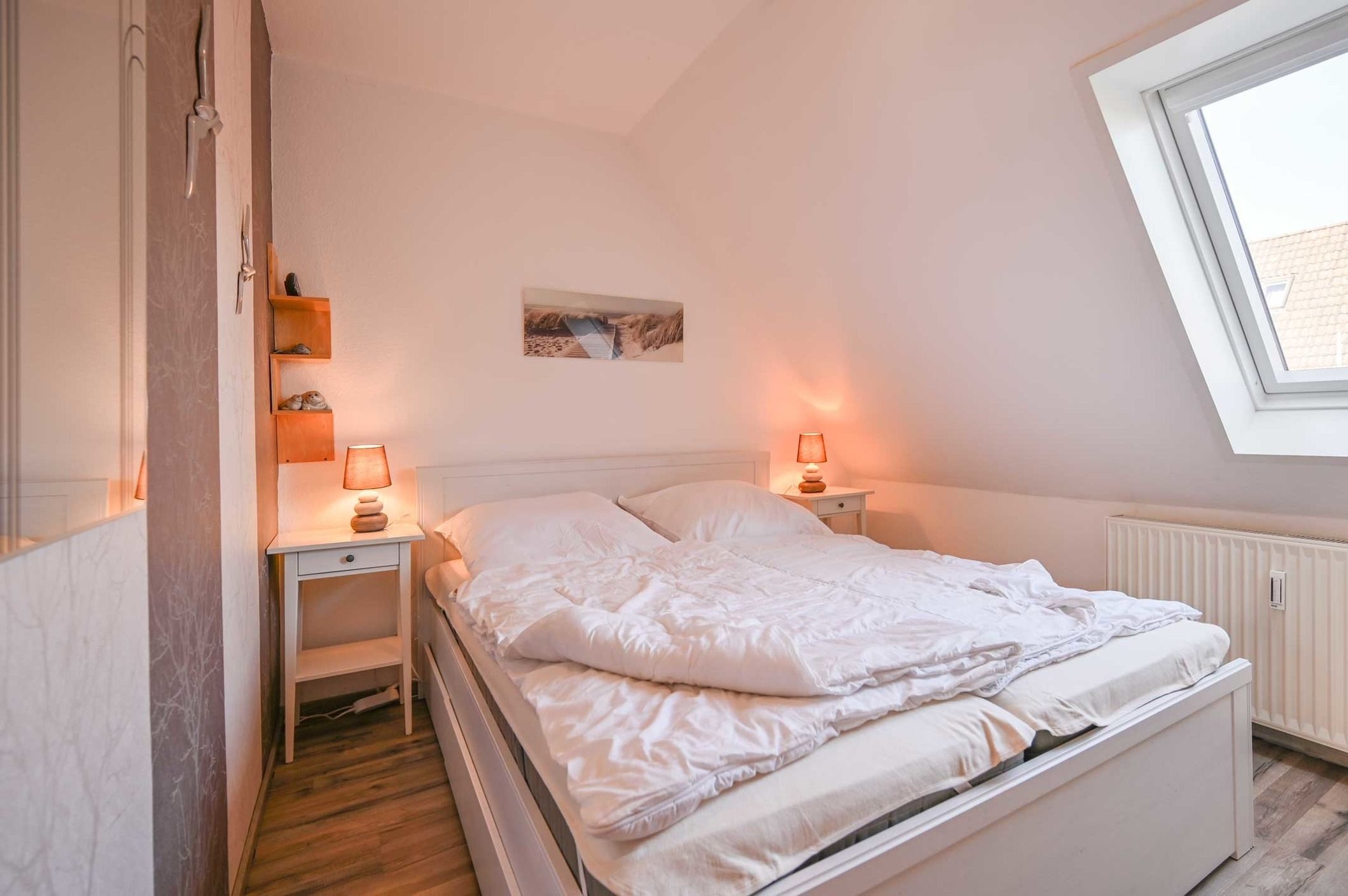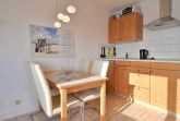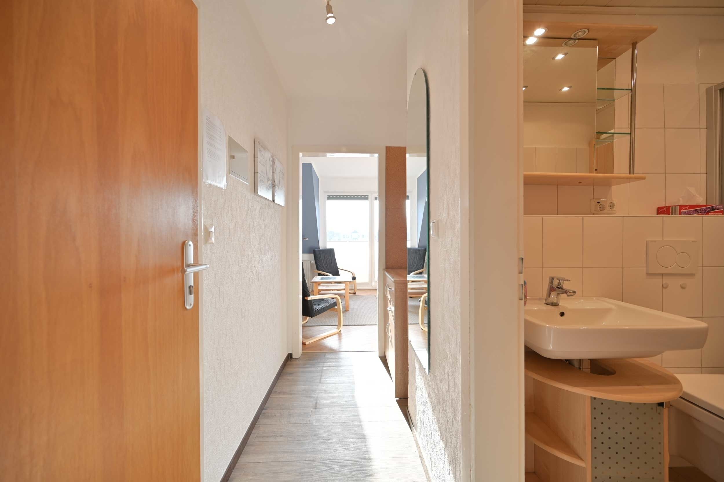 Die freundliche Ferienwohnung liegt in der ersten Etage und verfügt über einen hübschen Wohnraum mit integrierter Küchenzeile, einem Schlafsofa und frz. Balkon. Darüber hinaus finden Gäste in dieser Wohnung ein separates Schlafzimmer mit einem neuen in weiß gehaltenen Doppelbett im Breite 1,60m mit neuen Lattenrosten und Matratzen, Nachttischen und ein Bad mit Dusche/WC.