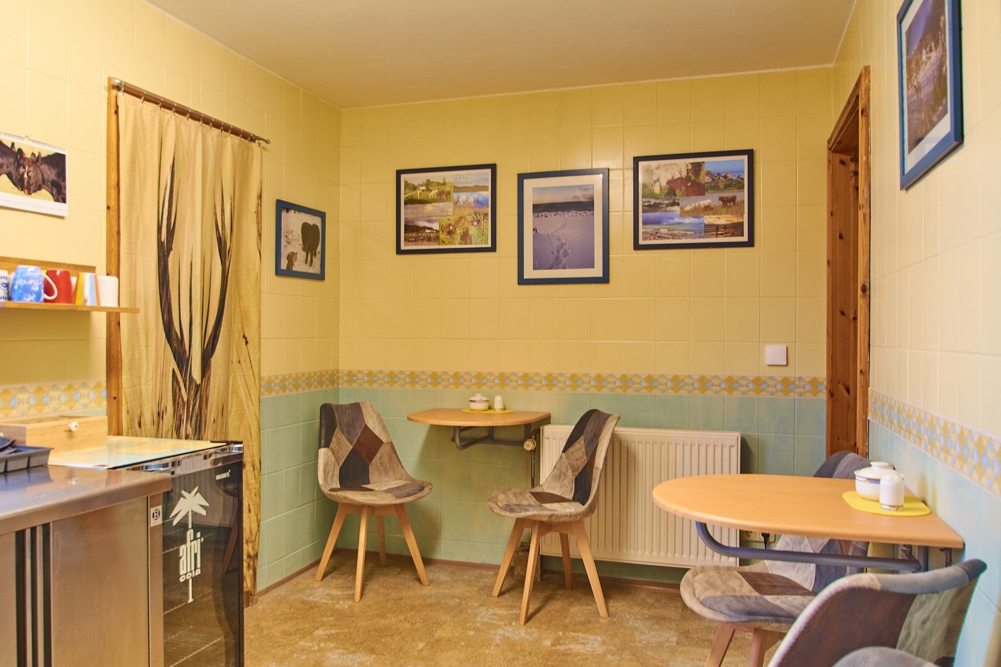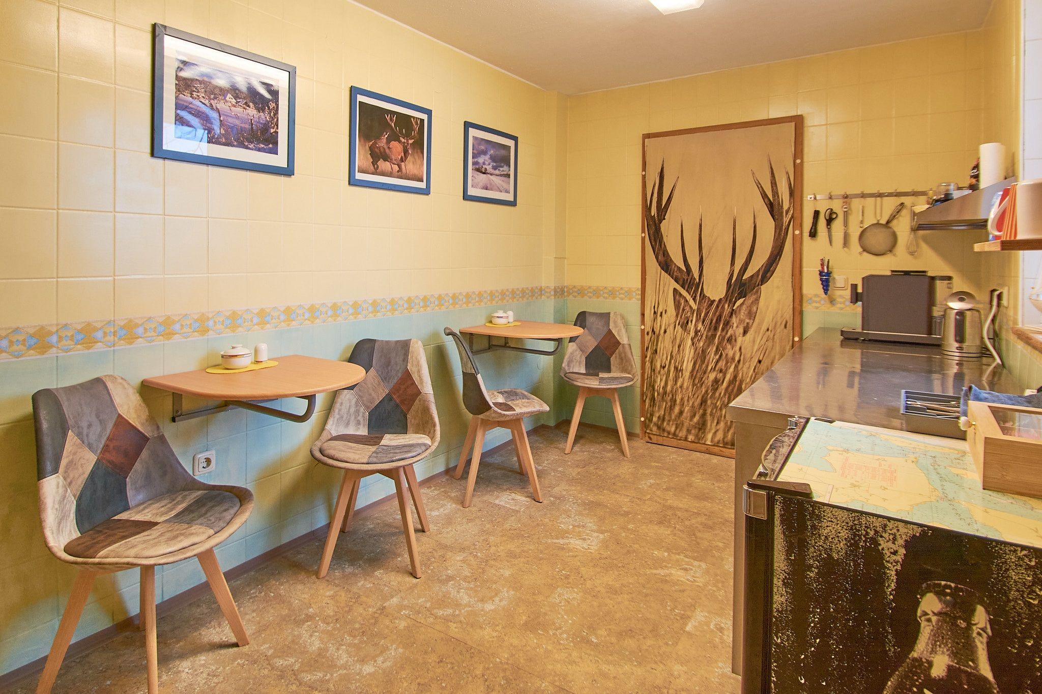 In der Teeküche (6 Sitzgelegenheiten), ausgestattet mit Kühlschrank, Wasserkocher, Kaffeemaschine, Geschirr,Besteck etc. können sie sich Ihr Frühstück zubereiten. Kaffee und Tee werden kostenfrei zur Verfügung gestellt. Der Raum ist ganztägig geöffnet ( Reinigung zwischen 12.30 und 14.00 Uhr).