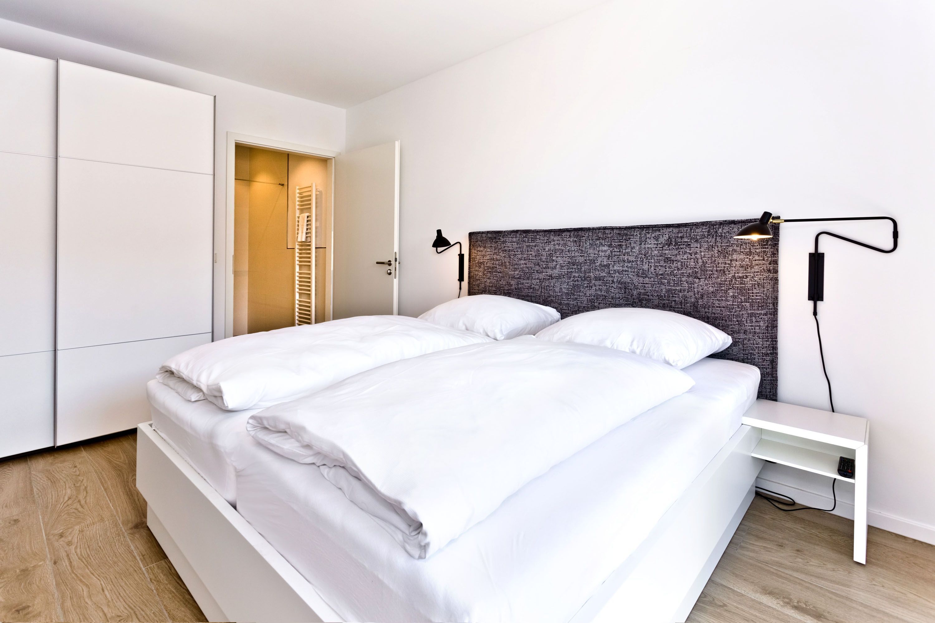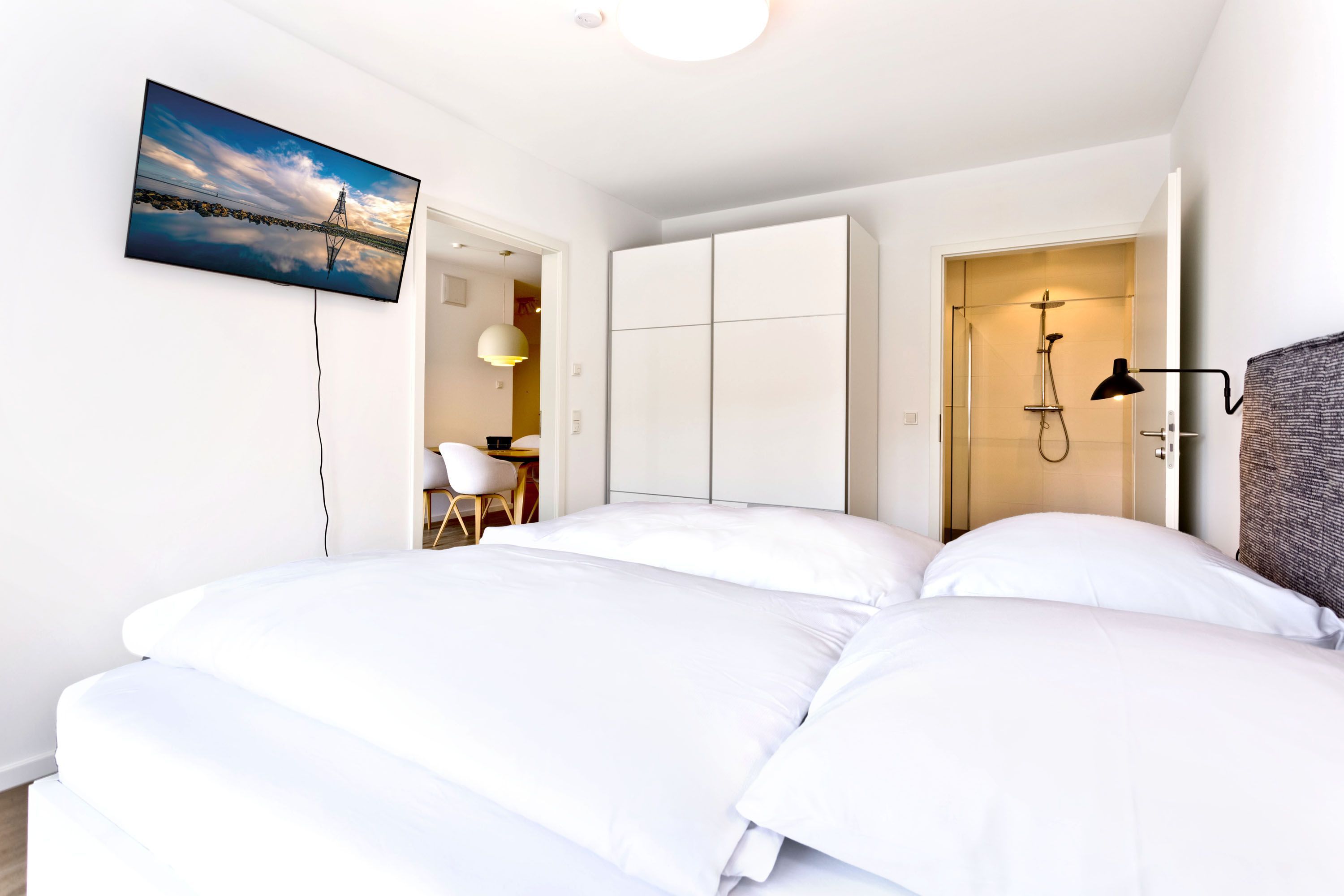 Sehr schöne, großzügige 2-Raum-Ferienwohnung auf ca. 55m² für bis zu 4 Personen (max. 2 Erw. 2 Kinder bis 16J.) geeignet. Sonniges Wohn- / Schlafzimmer mit hochwertiger Schlafcouch, TV, Radio, kostenloses W-LAN-Internet, Essplatz, Außenjalousien u. Plissees, Zugang zum sonnigen Südbalkon.