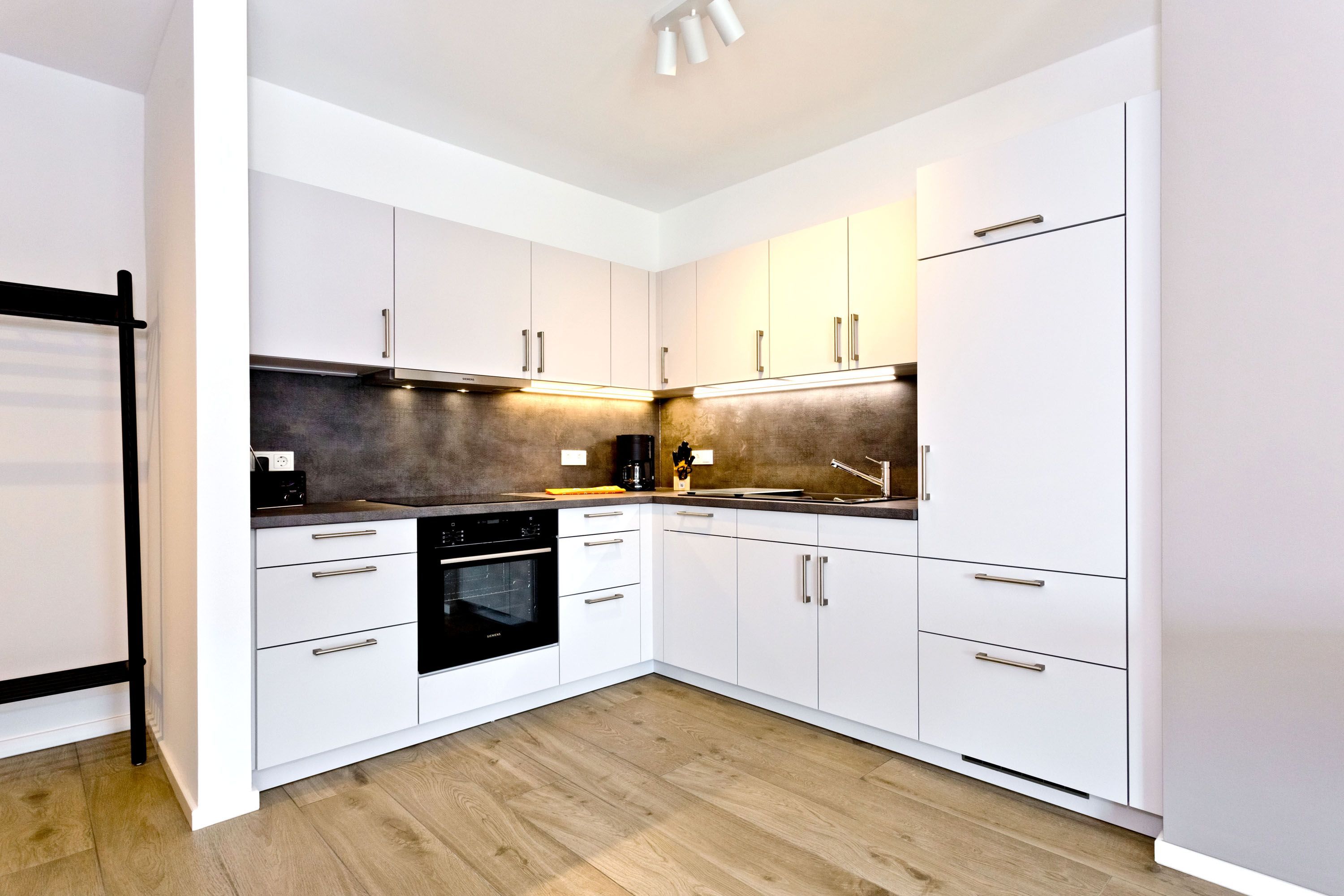 Vollausgestattete Küche (Geschirrspüler, Backofen, Ceranherd, Dunstabzug) Kühlschrank mit Gefrierfach.