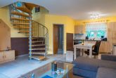 Das zweigeschossige Ferienhaus ist für bis zu vier Personen konzipiert und eignet sich sowohl für Familien als auch für Paare und Erholungssuchende. Im Erdgeschoss befindet sich das offene und helle Wohnzimmer, das durch komfortable Sitzgelegenheiten, einen Kaminofen für wohlige Wärme an kühleren Tagen sowie einen Flachbild-TV zum Verweilen einlädt.