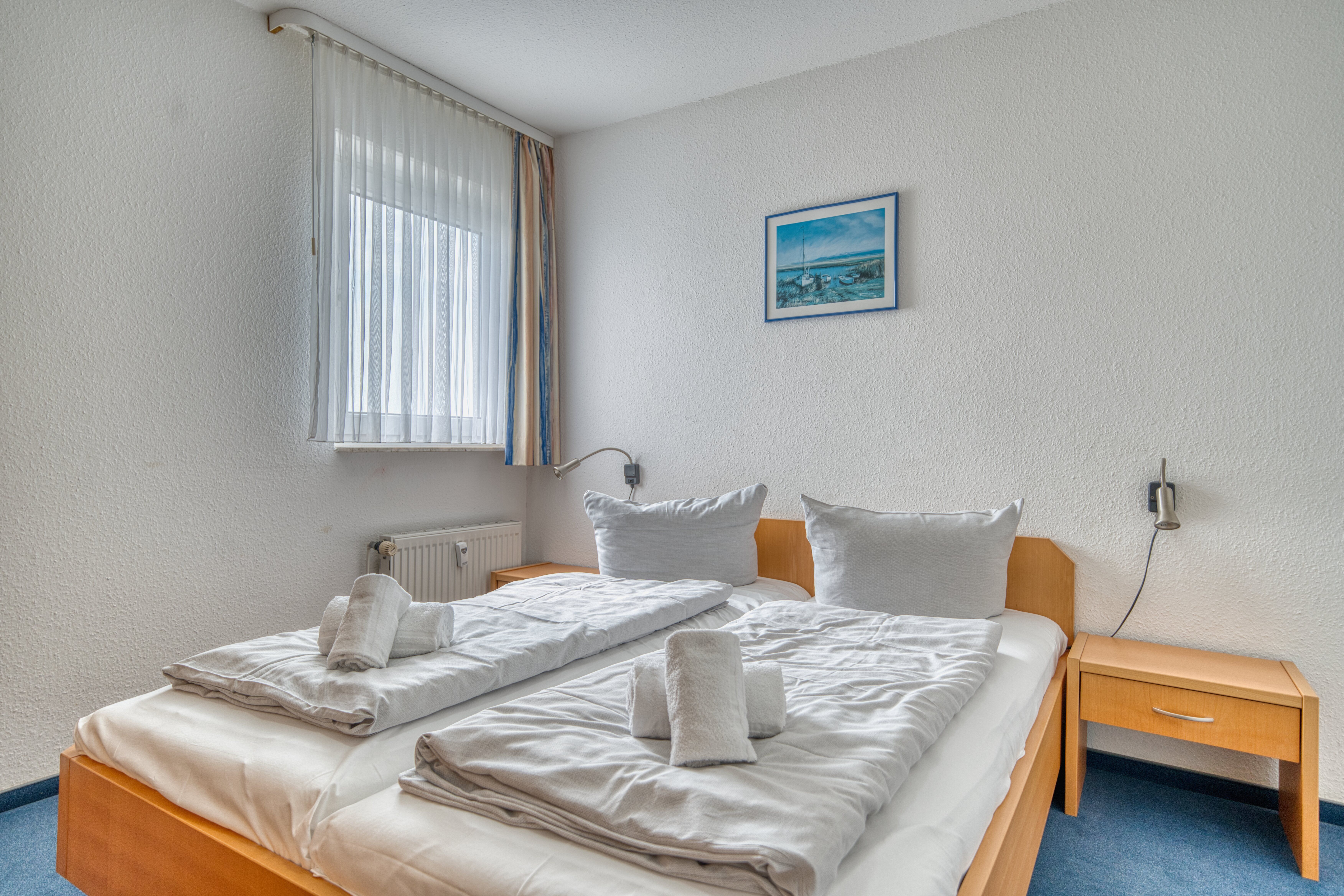 Separates Schlafzimmer mit Fernseher, Doppelbett und Fenster für erholsame Nächte