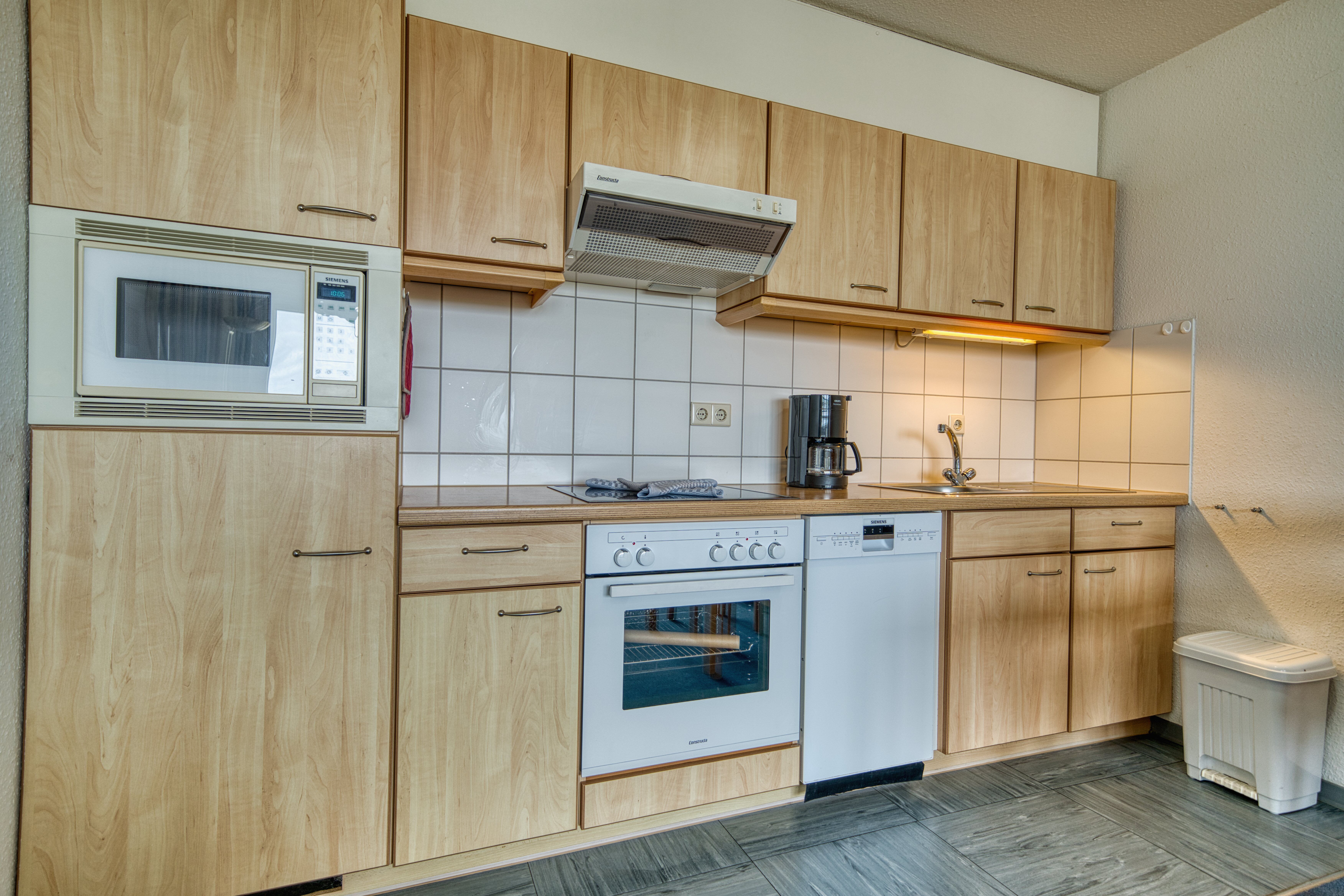 Küche mit Backofen, Kühlschrank mit Gefrierfach, Filterkaffeemaschine, Mikrowelle, Geschirrspüler und Ceranherd alles, was Sie für Ihre Mahlzeiten benötigen