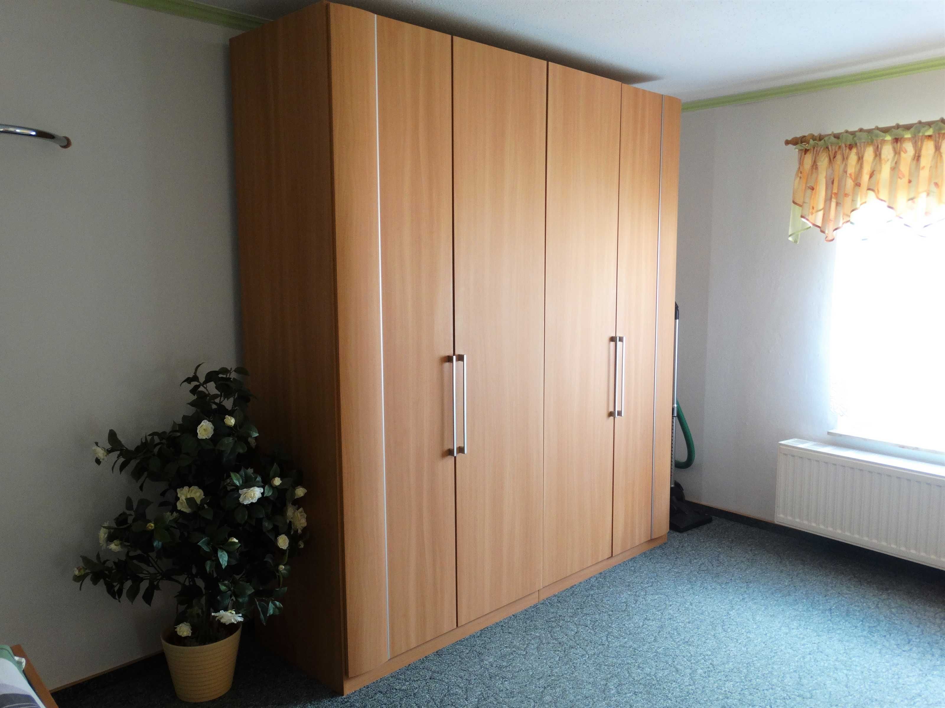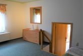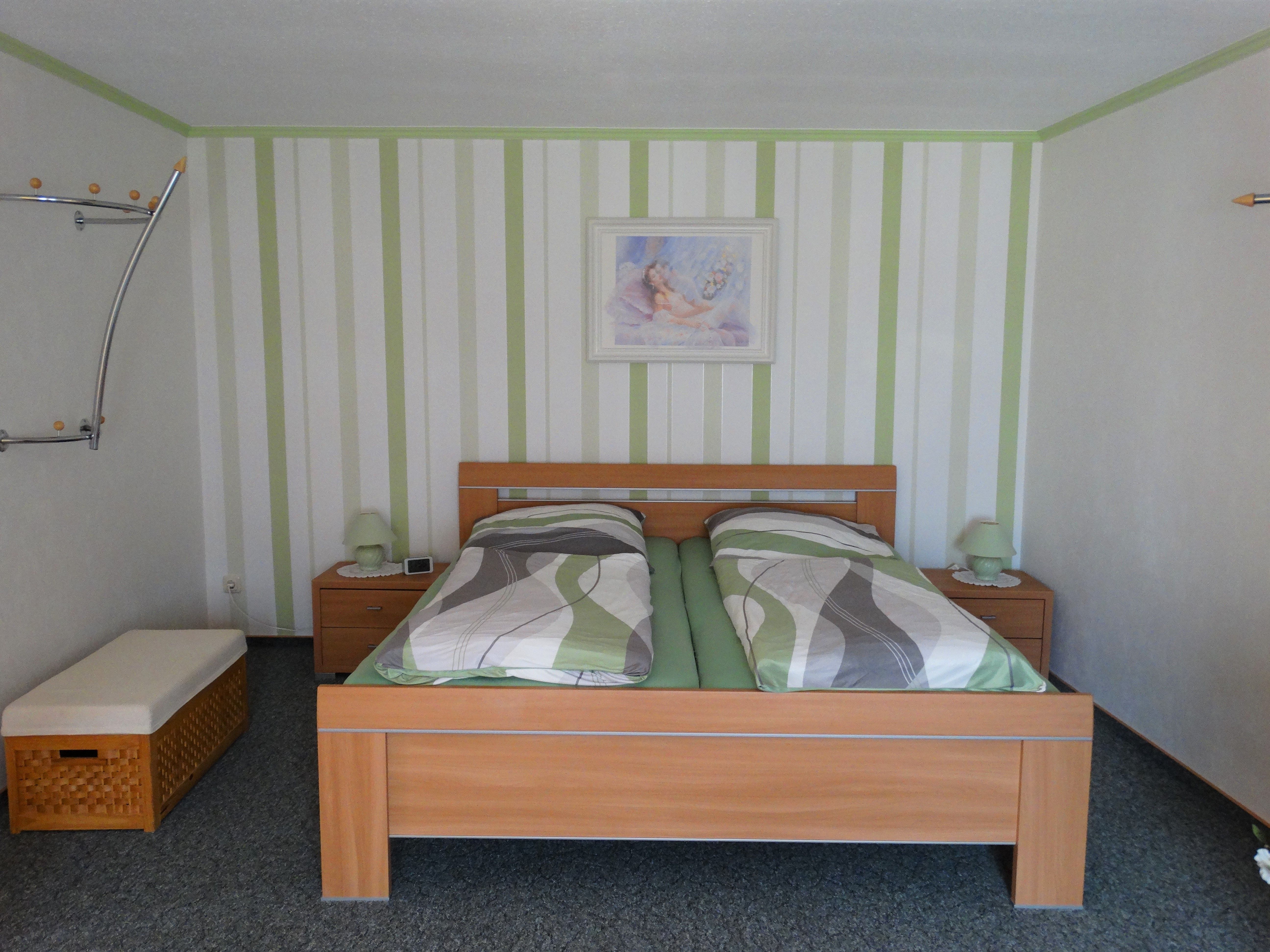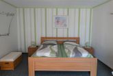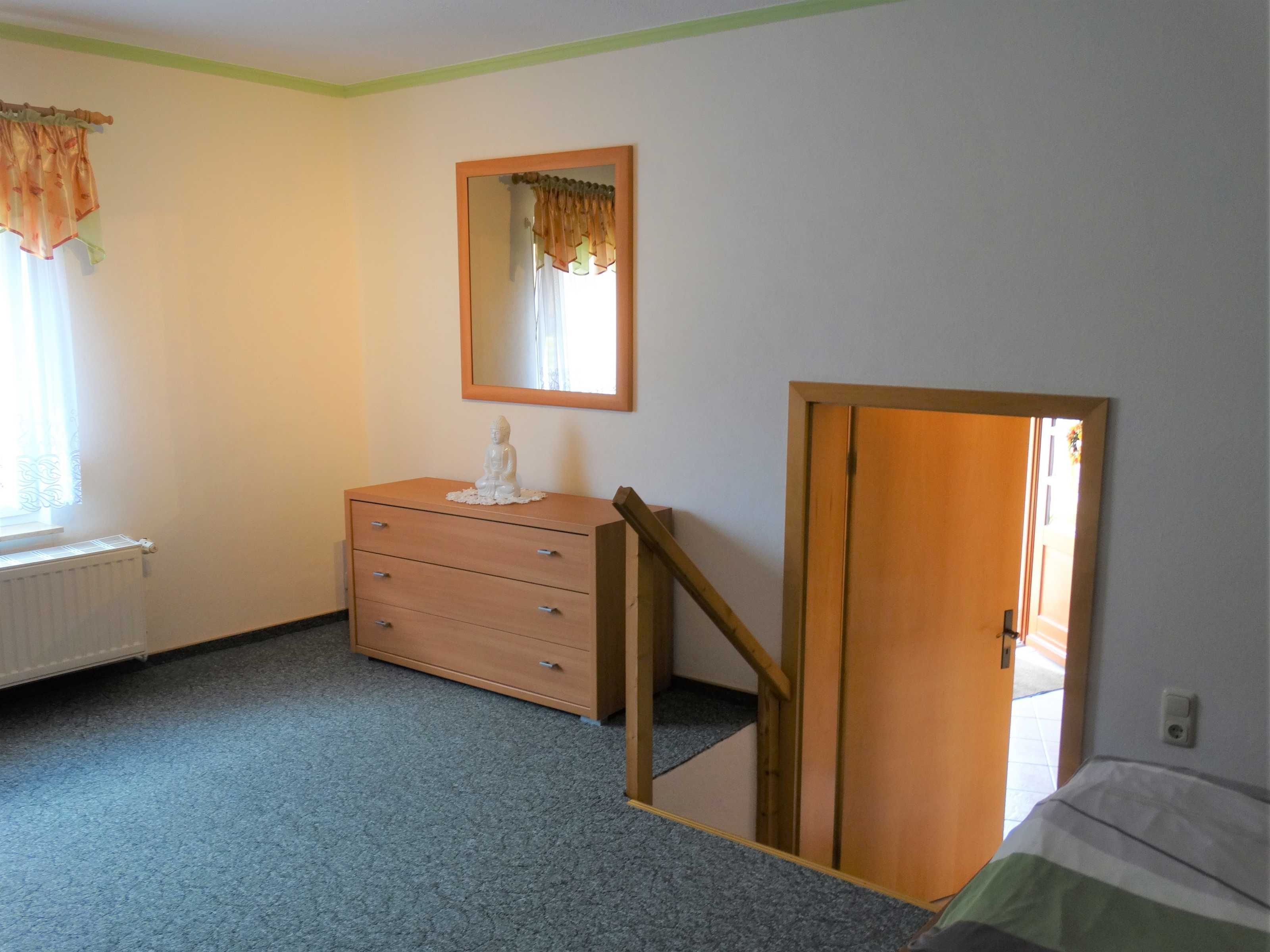Durch 4 Treppenstufen, die rechts durch ein Geländer gesichert sind, gelangen Sie in das schöne Schlafzimmer. Es ist ebenfalls sehr geräumig, besteht aus einem Doppelbett, Kommode und einem Doppelschrank.