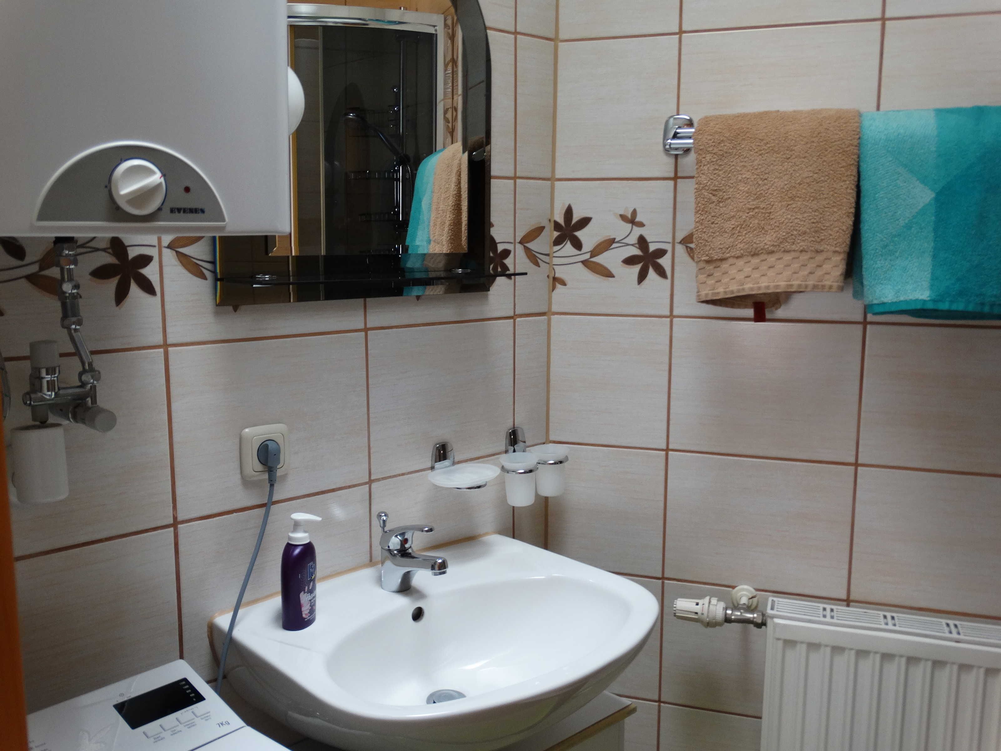 Im Bad befindet sich eine Waschmaschine, die gegen Gebühr in Höhe von 5,-€ pro Waschgang genutzt werden kann.