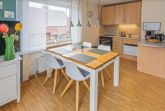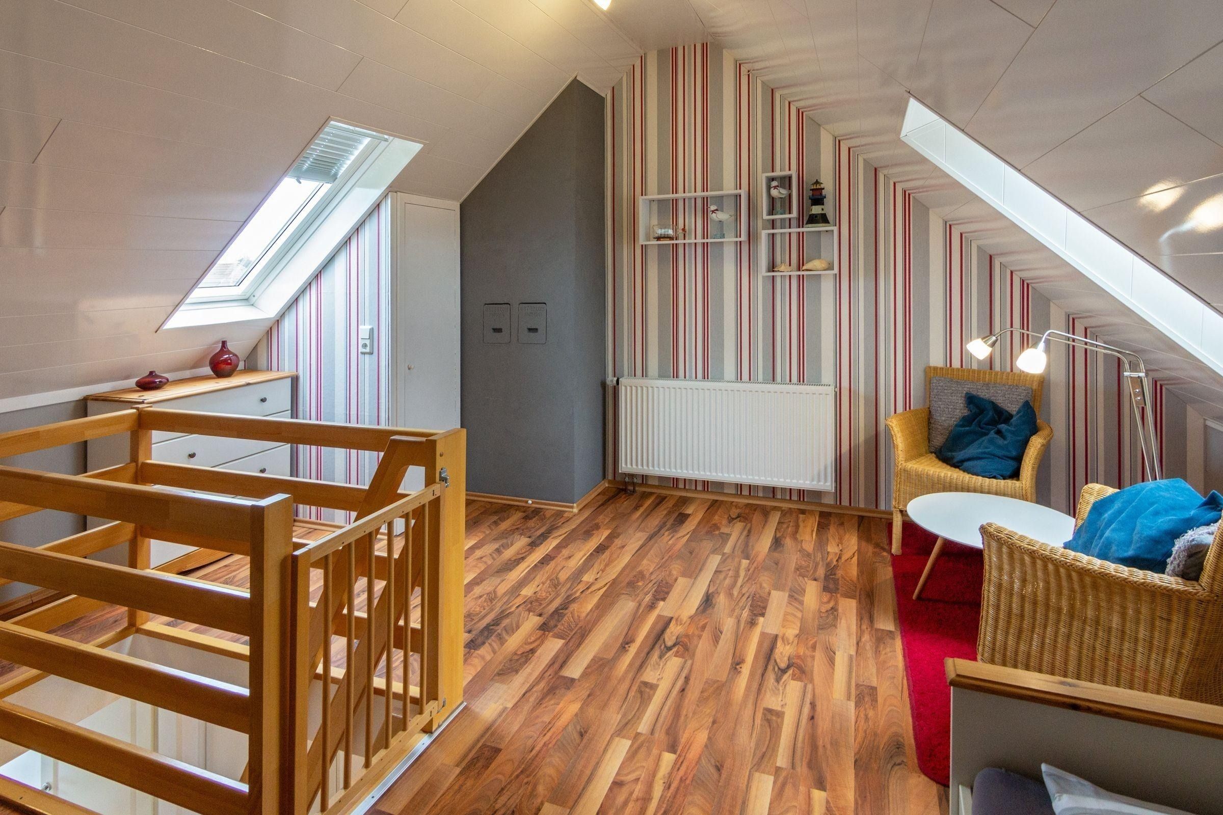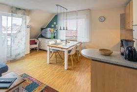 Die strandnahe Ferienwohnung in Norddeich bietet auf 64 m² Platz für bis zu 4 Personen. Im ersten Obergeschoss befindet sich ein helles Wohn-Esszimmer mit integrierter Küchenzeile, ausgestattet mit Kühlschrank, Gefrierfach, Cerankochfeld, Dunstabzugshaube, Geschirrspüler und einem kleinen Backofen. Weitere Küchengeräte wie Toaster, Wasserkocher und Kaffeemaschine sind ebenfalls vorhanden. Ein Schlafzimmer mit Doppelbett und ein Duschbad runden das Angebot ab. Über eine Raumspartreppe gelangt man ins zweite Obergeschoss, wo ein weiteres Schlafzimmer mit 2 Einzelbetten wartet. WLAN und ein kostenloser Einstellplatz am Haus stehen zur Verfügung. Bettwäsche und Handtücher sind nicht enthalten, können aber kostenpflichtig hinzugebucht werden. Hunde sind willkommen, Katzen sind nicht gestattet.