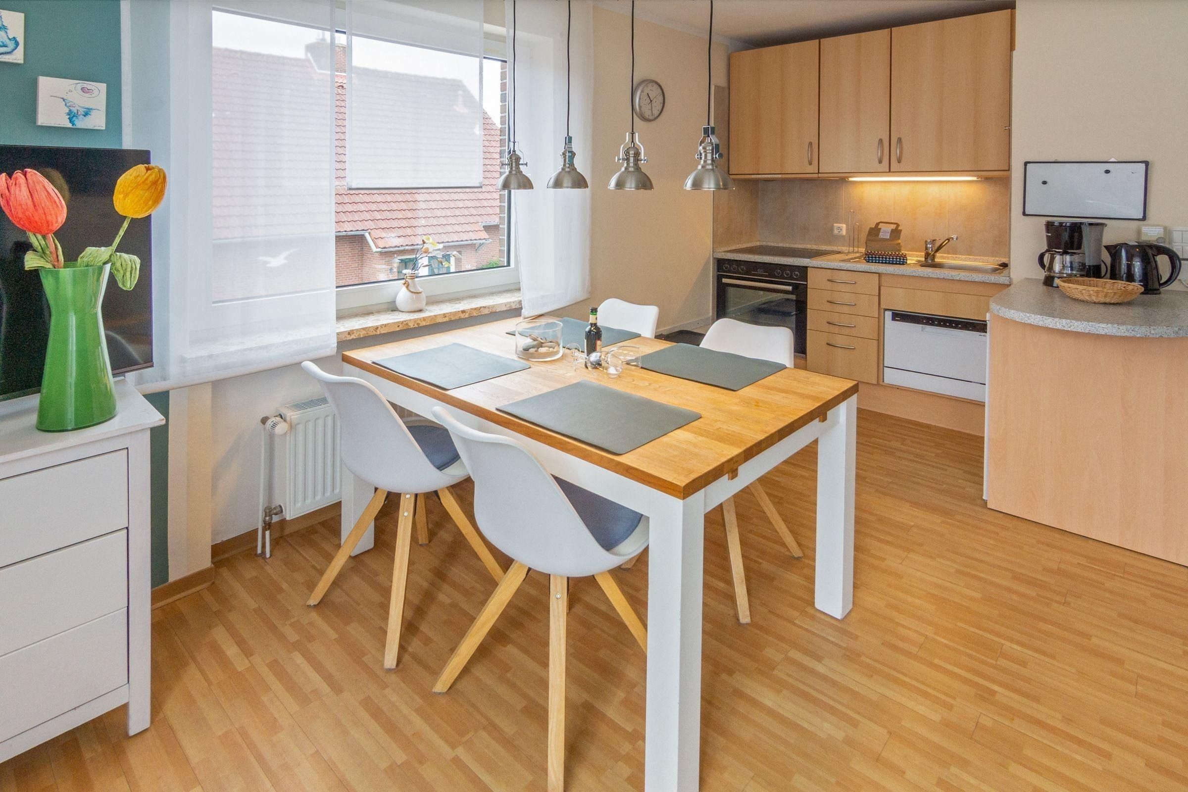 Die Ferienwohnung bietet Platz für bis zu 4 Personen und verfügt über WLAN, eine Küchenzeile und einen Balkon. Die Schlüsselübergabe erfolgt im Büro in Norden. Bettwäsche und Handtücher sind optional erhältlich. Haustiere: Hunde erlaubt, Katzen nicht.