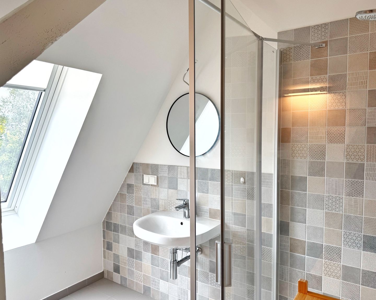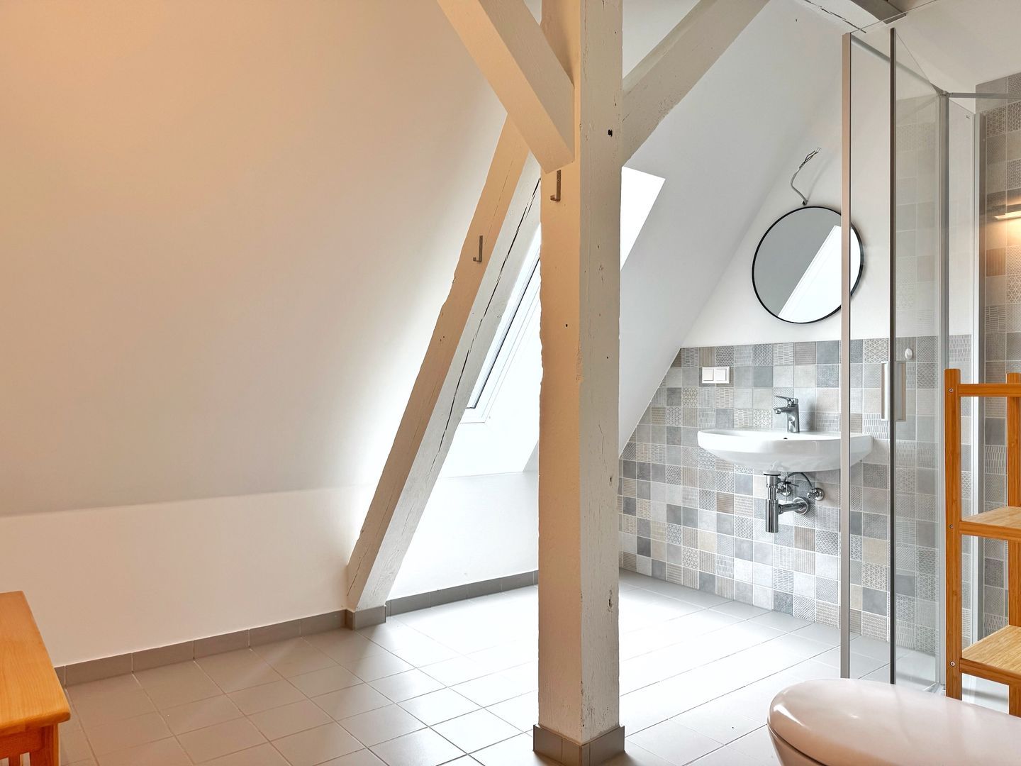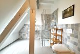 Das großzügige Badezimmer bietet eine bodentiefe Glasdusche, Waschbecken und WC. Außerdem gibt es im Haus noch eine Gäste-Toilette.