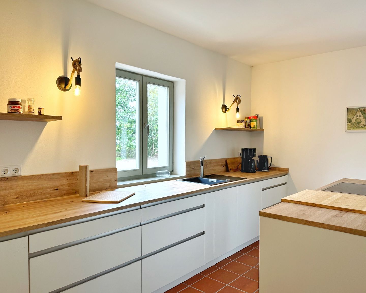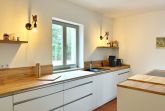 Die moderne Küche ist durch eine breite Schiebetür vom Wohnbereich getrennt. Sie ist komfortabel ausgestattet mit modernen Geräten und besticht durch ihre schlichte Eleganz mit weißen Fronten und viel Holz.