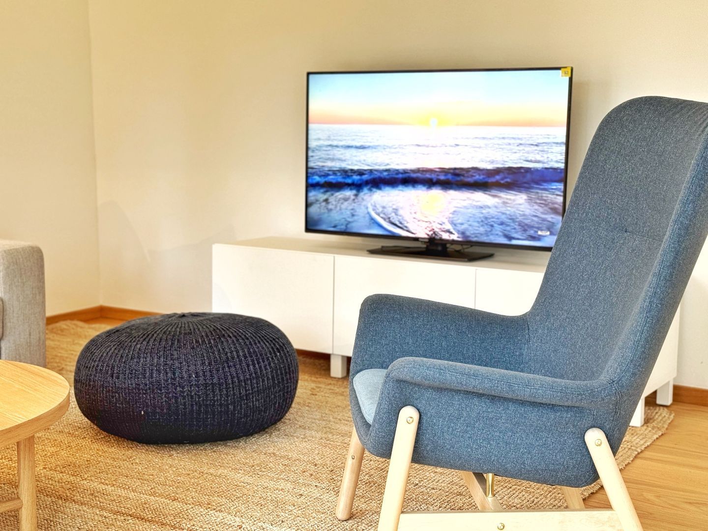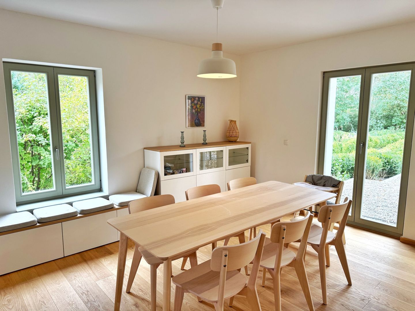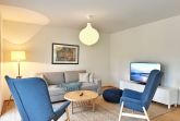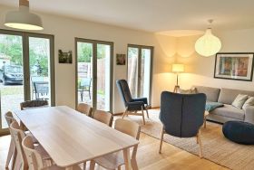 Das Wohn-Esszimmer ist großzügig gestaltet mit bodentiefen Fenstern und vorgelagerter Terrasse. Es gibt eine gemütliche Sofaecke und Sessel vor dem Flat-TV sowie einen großen Esstisch.
