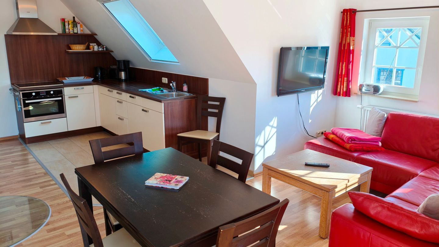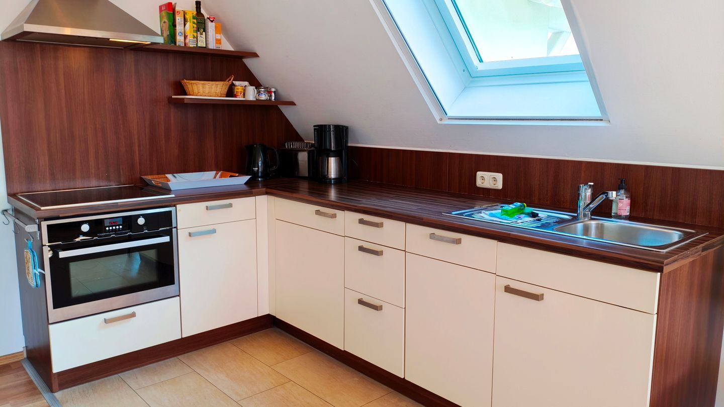 Ein besonderer Pluspunkt ist der offene Küchenbereich, der nahtlos in das Wohnzimmer übergeht und sowohl mit einem Ceranfeld, einer Spülmaschine, einem Kühlschrank mit Gefrierfach, Mikrowelle, Kaffeemaschine als auch mit Wasserkocher und Toaster voll ausgestattet ist.