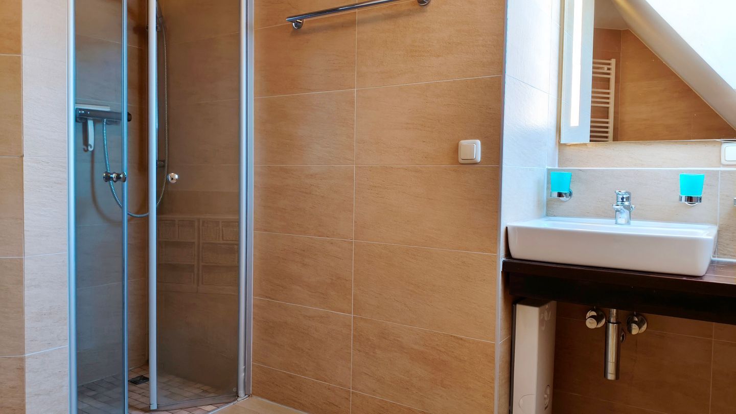 Das moderne Badezimmer bietet eine bodengleiche Dusche, Haartrockner, Waschbecken, Spiegel und Warmwasser. Fliegengitter an den Fenstern sorgen für einen entspannten Schlaf.
