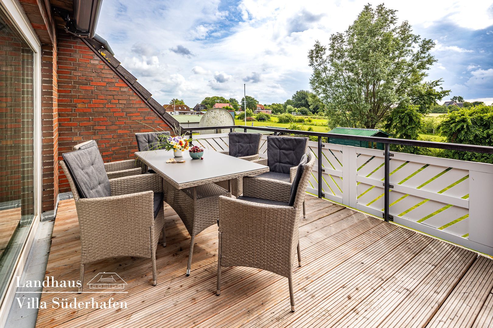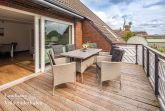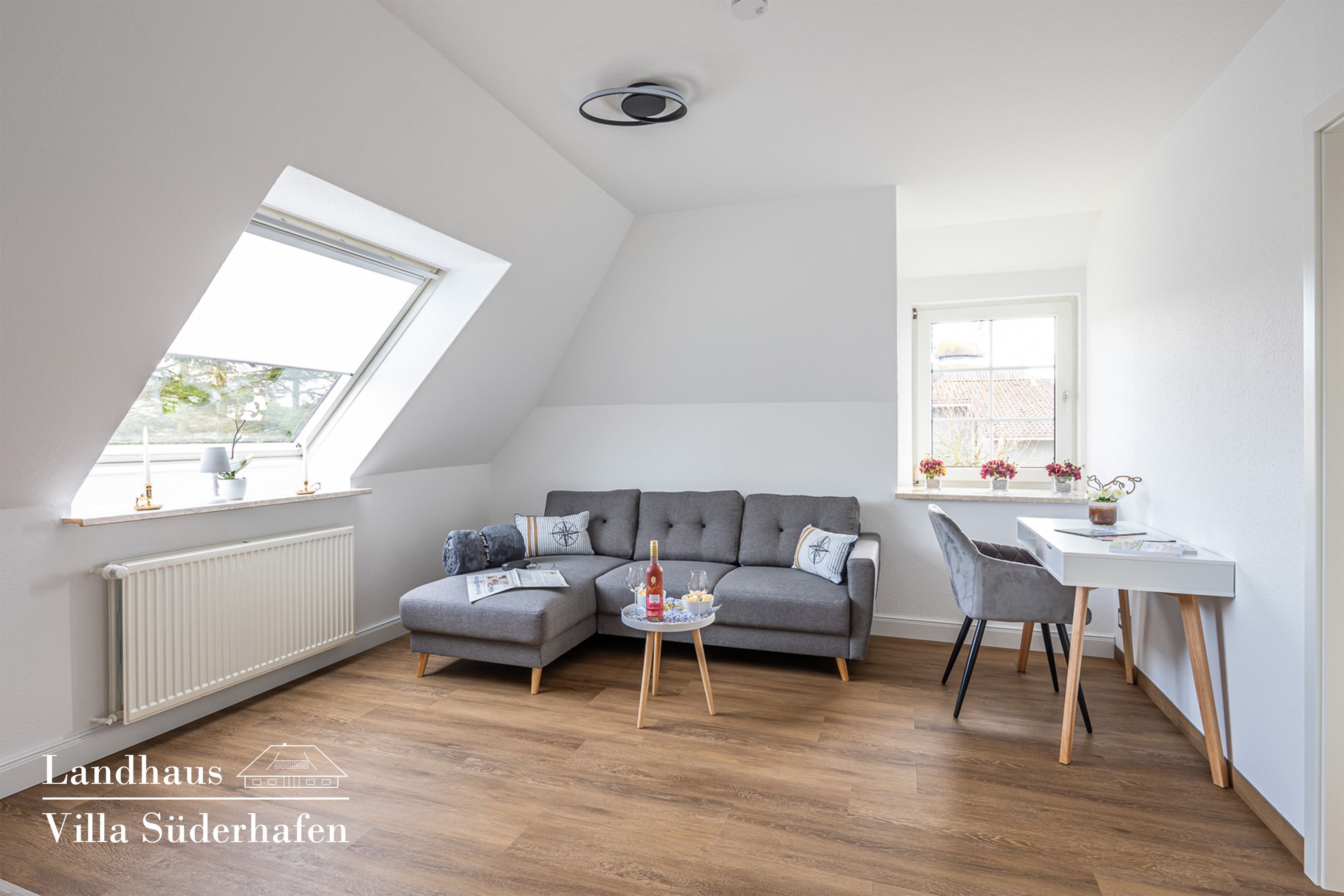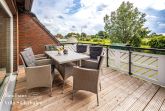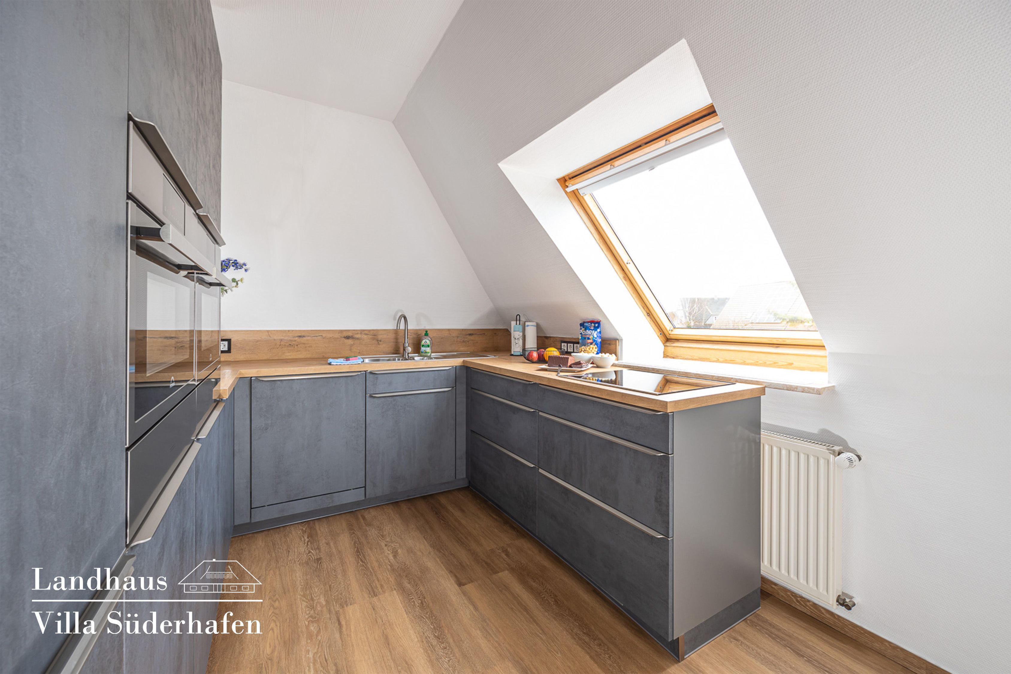 Gemeinsam mit ihrer Familie oder ihren Freunden nutzen Sie den Wohn- und Essbereich, die Dachterrasse mit Blick über die Wiesen bis zum Deich und die komplett ausgestattete Küche.