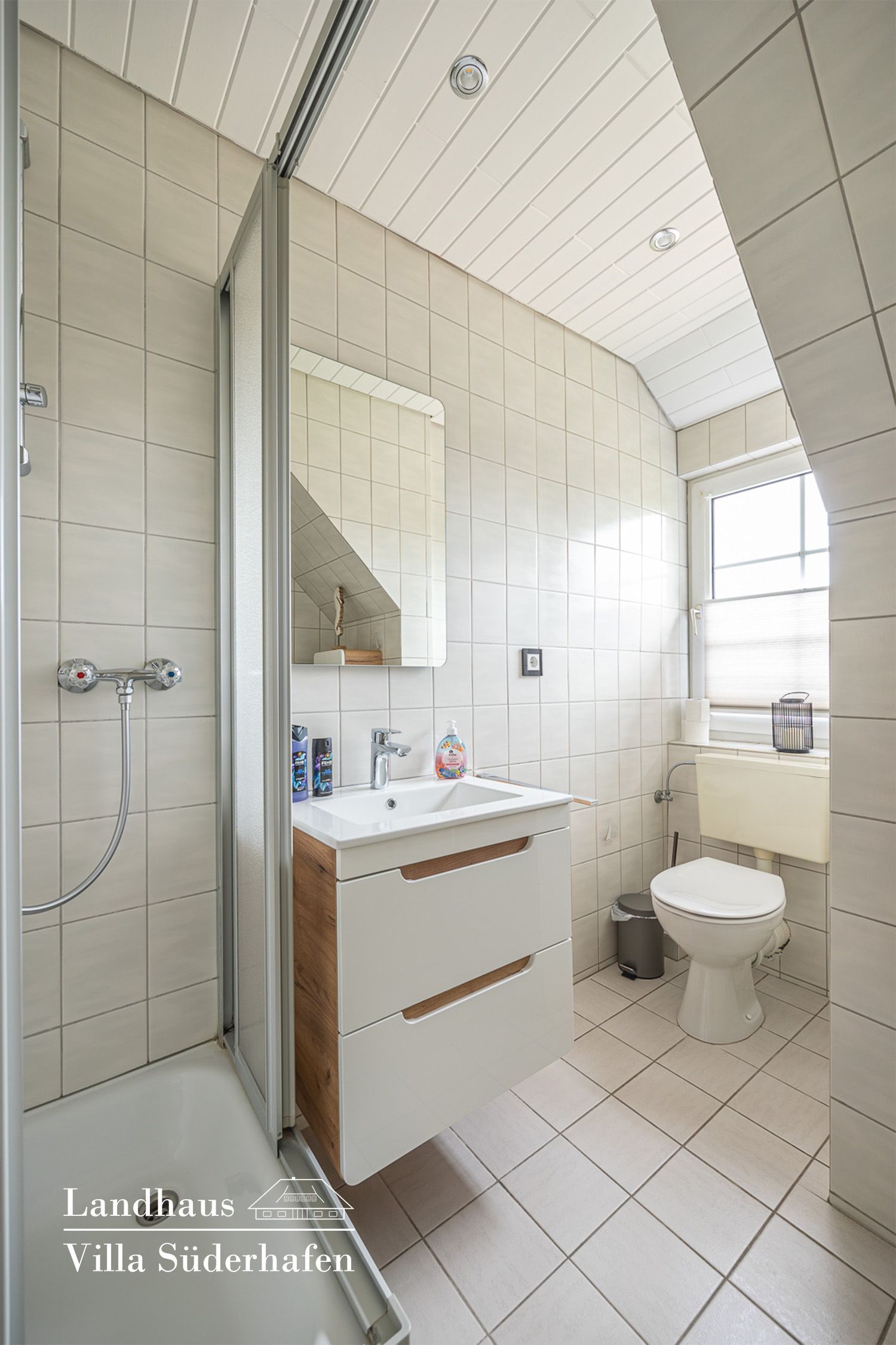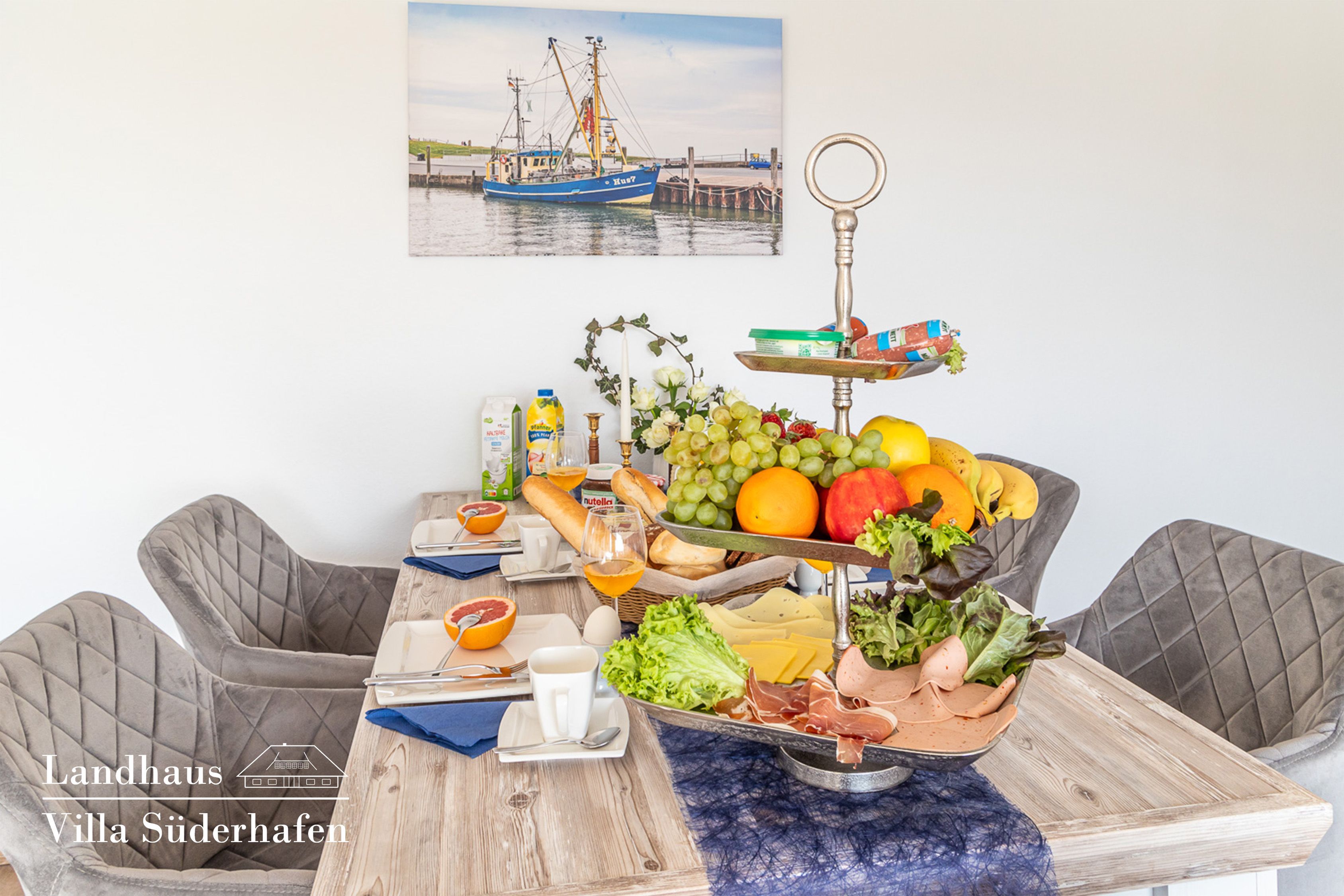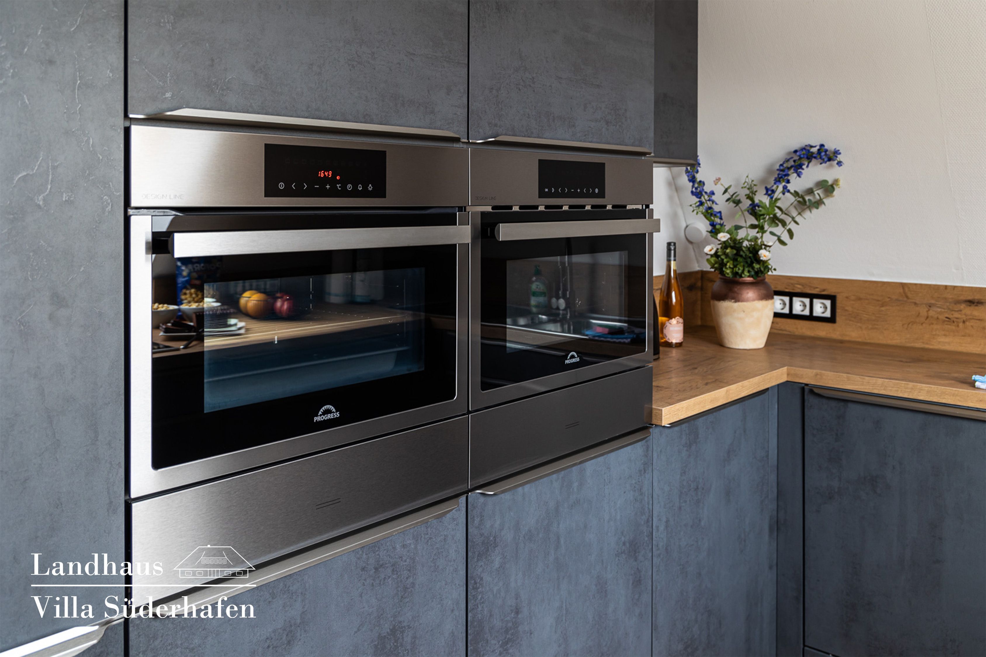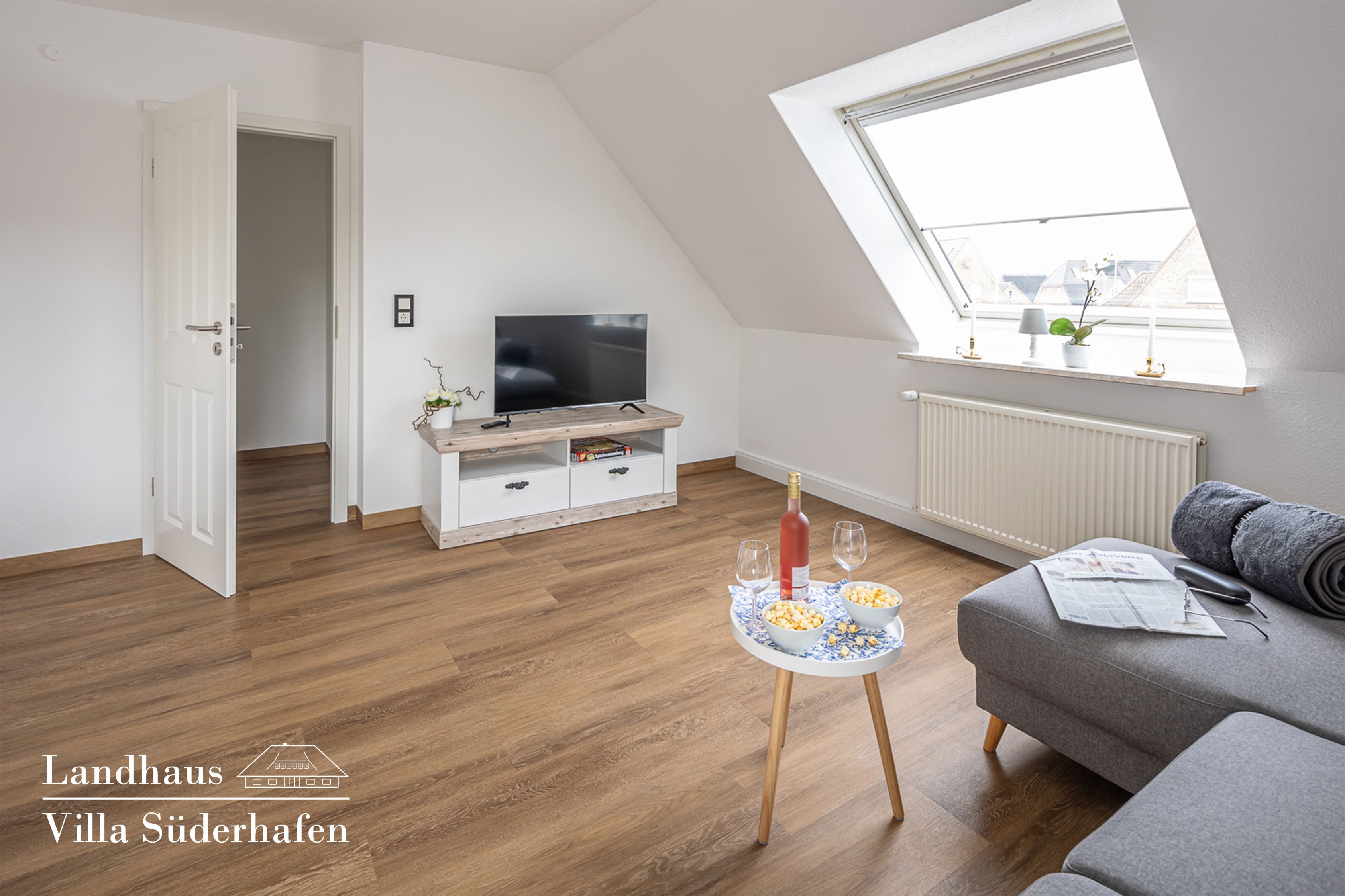 Gemeinsam mit ihrer Familie oder ihren Freunden nutzen Sie den Wohn- und Essbereich, die Dachterrasse mit Blick über die Wiesen bis zum Deich und die komplett ausgestattete Küche.