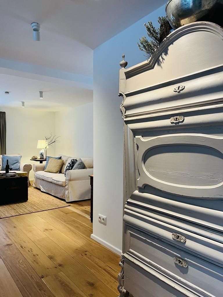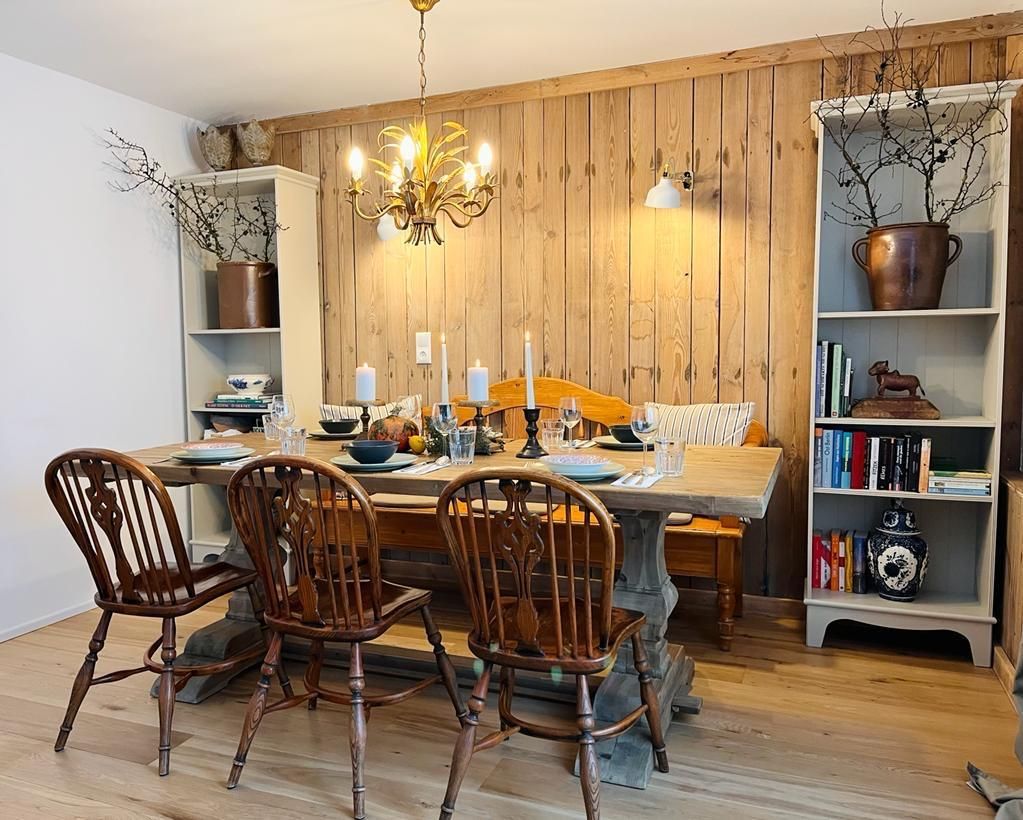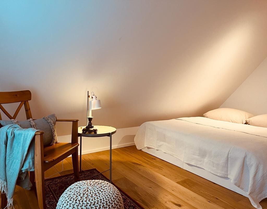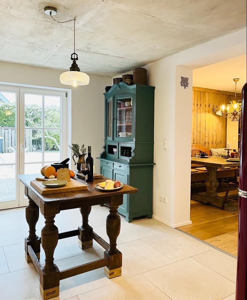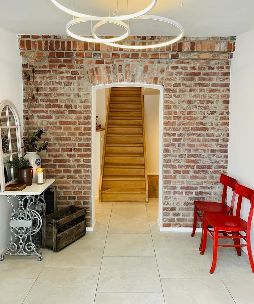 Uns ist es ein Bedürfnis dieses familiäre Kleinod und Stückchen Heimat zu erhalten und in der Familie zu belassen. Wir haben das Haus von 1952 komplett auf den Kopf gestellt, neu strukturiert und modernisiert. Auch wenn die räumliche Aufteilung nun eine andere ist als früher und nahezu nur noch die Außen- und tragenden Wände das ehemalige Gerüst darstellen, haben wir versucht den Charme der Vergangenheit zu erhalten. So haben wir teilweise Decken und Wände belassen, den ehemaligen Klassenzimmerboden als Wandvertäfelung verbaut und alte Holzdielen als Fensterbänke und Ablageflächen zweckentfremdet.