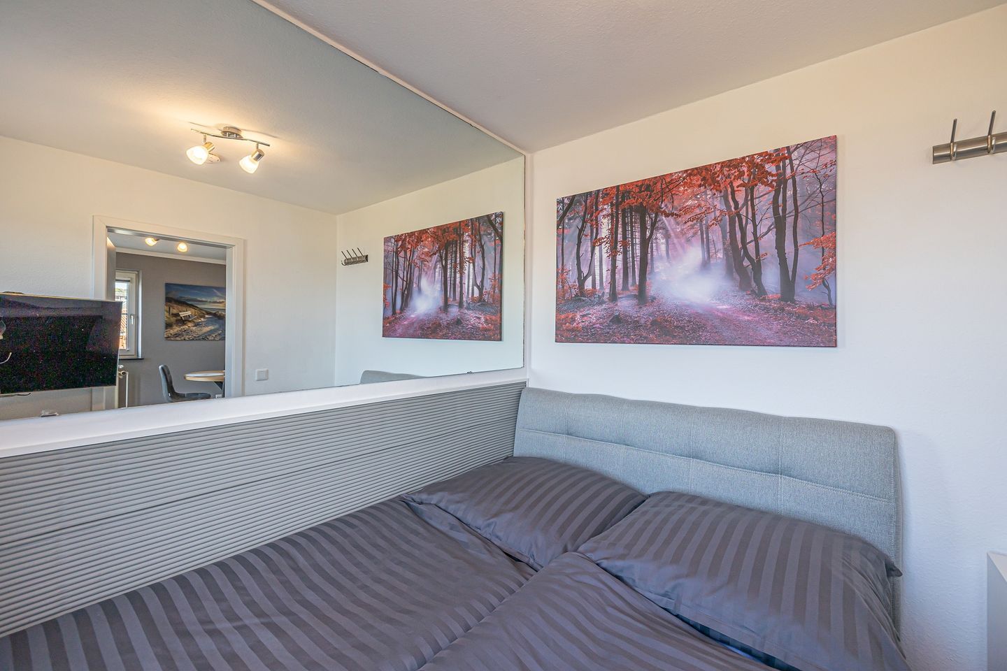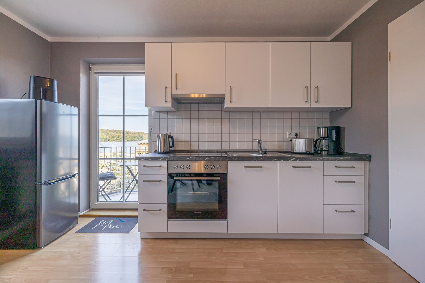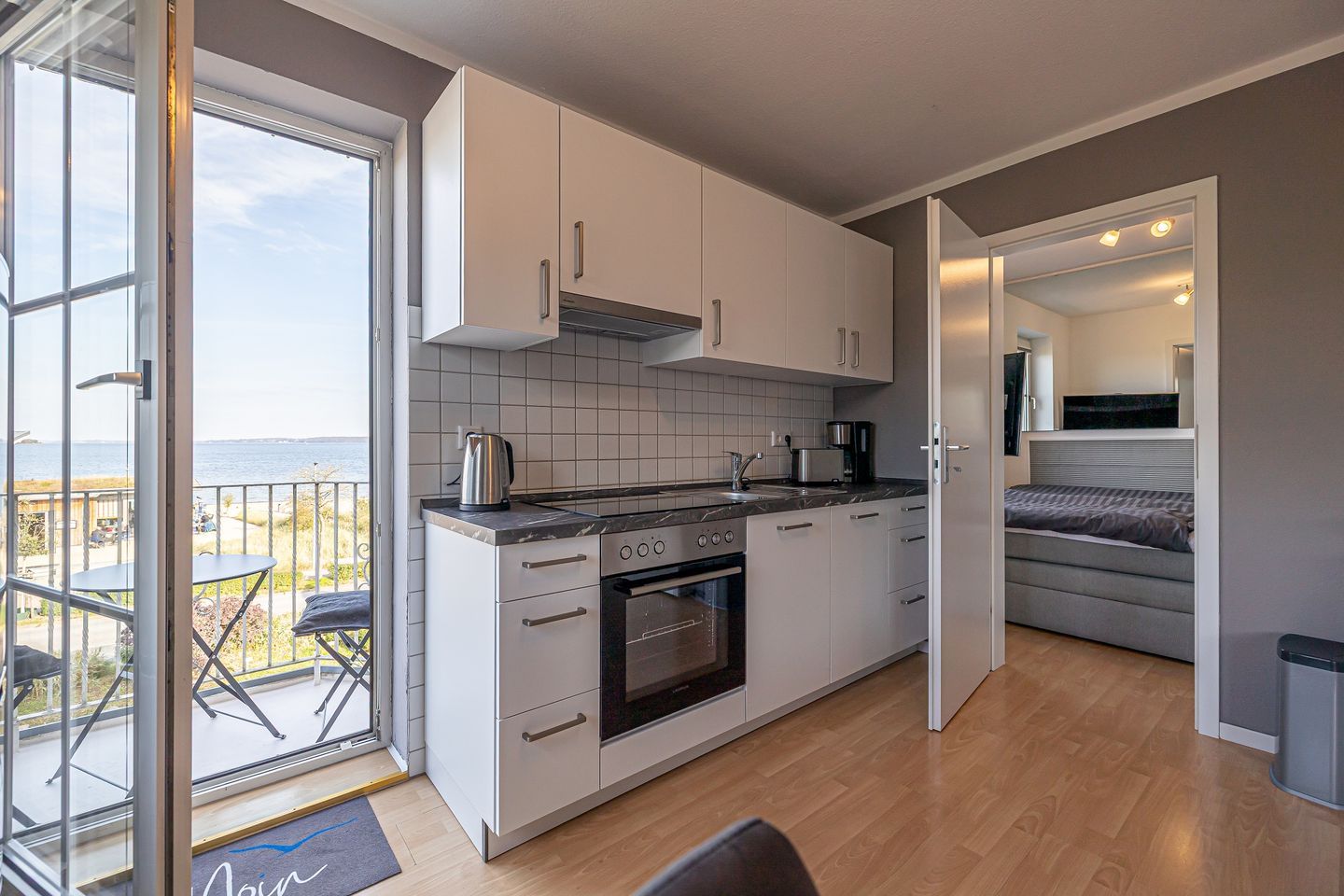 Das lichtdurchflutete Studio verfügt über ein gemütliches Doppelbett. Die voll ausgestattete Einbauküche bietet alles, was Sie für eine bequeme Selbstversorgung benötigen. Das moderne Duschbad rundet das komfortable Angebot ab. Ein besonderes Highlight ist das zweiflügelige Dachfenster, das sich zu einem Dachaustritt öffnen lässt und Ihnen einen einzigartigen Blick auf die Förde und den Strand bietet.