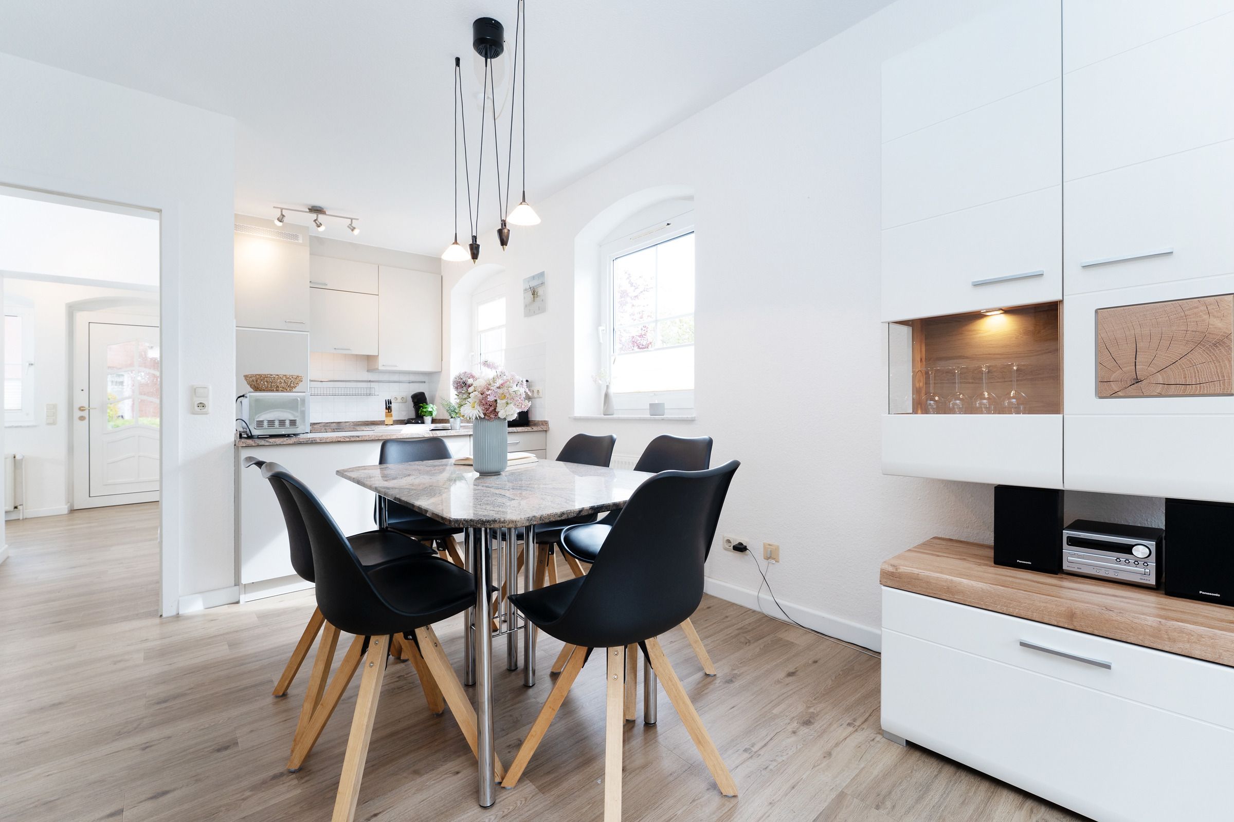 Die gut ausgestattete Küche mit Backofen, Geschirrspülmaschine, Kühlschrank mit Gefrierfach, Wasserkocher, Kaffeemaschine und Toaster lässt keine Wünsche offen. Der angrenzende Essbereich lädt zu geselligen Mahlzeiten ein.
