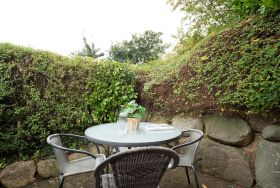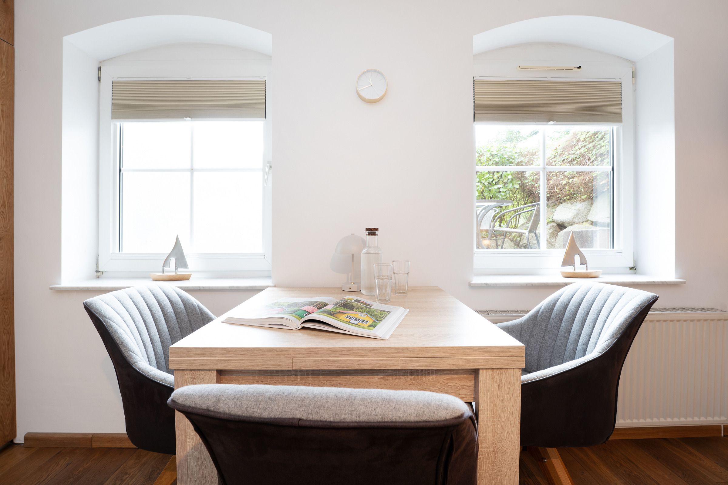 Der Wohnbereich dieser liebevoll eingerichteten Wohnung empfängt Sie mit einer gemütlichen Sitzgruppe sowie einem Fernseher. Von hier aus gelangen Sie direkt auf die Terrasse, die mit Gartenmöbeln ausgestattet ist und zum Verweilen an der frischen Ostseeluft einlädt. Die Küche bietet Ihnen alles, was Sie für eine bequeme Selbstversorgung benötigen: Backofen, Kühlschrank, Kaffeemaschine, Wasserkocher, Toaster sowie eine Mikrowelle. Ein Essbereich ist in die Küche integriert und bietet eine entspannte Atmosphäre für gemeinsame Mahlzeiten. Im Schlafbereich erwartet Sie ein bequemes Doppelbett, das erholsame Nächte garantiert. Das moderne Badezimmer verfügt über Dusche, WC, beheizbaren Handtuchhalter und sorgt mit praktischen Details für Komfort.