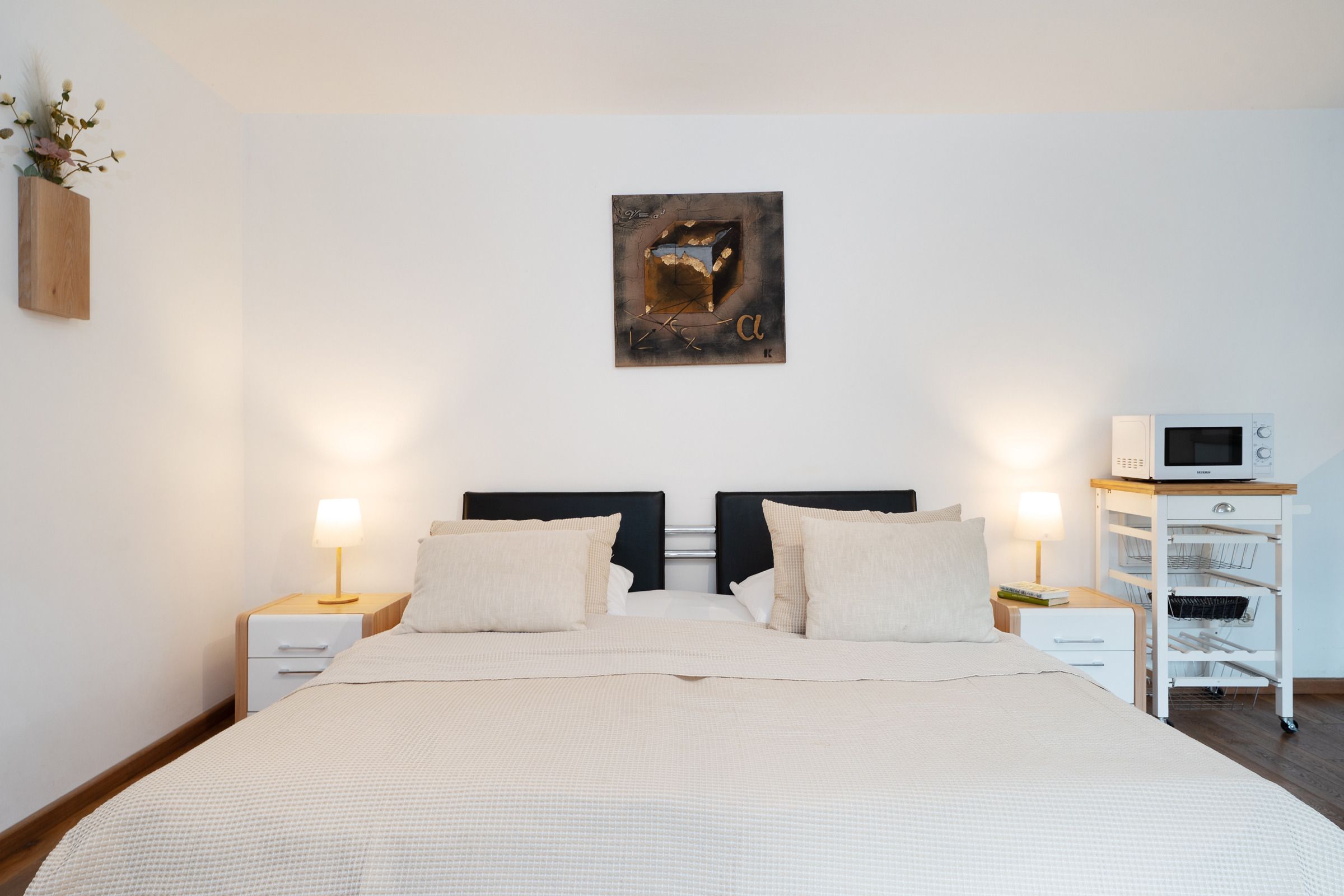 Schlafzimmer: 1 Doppelbett (2x 90x200 cm), Kleiderschrank, TV, Verdunkelung: Verdunkelungsplissees, Platz für ein Babybett vorhanden