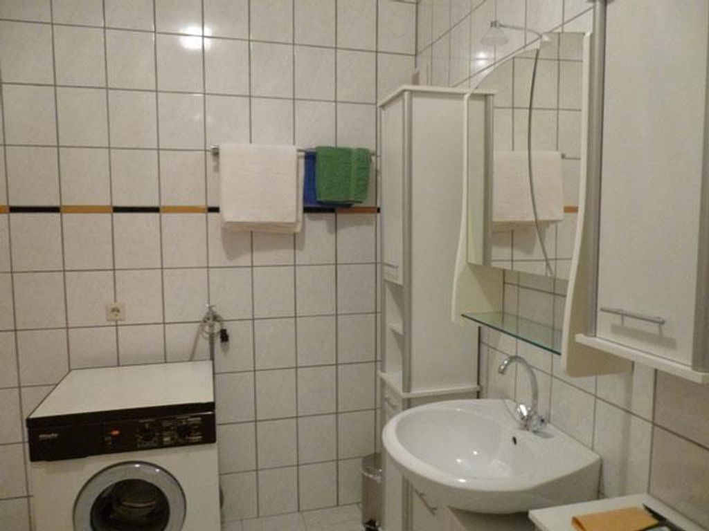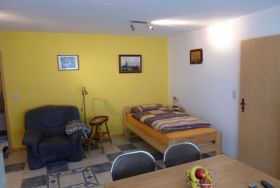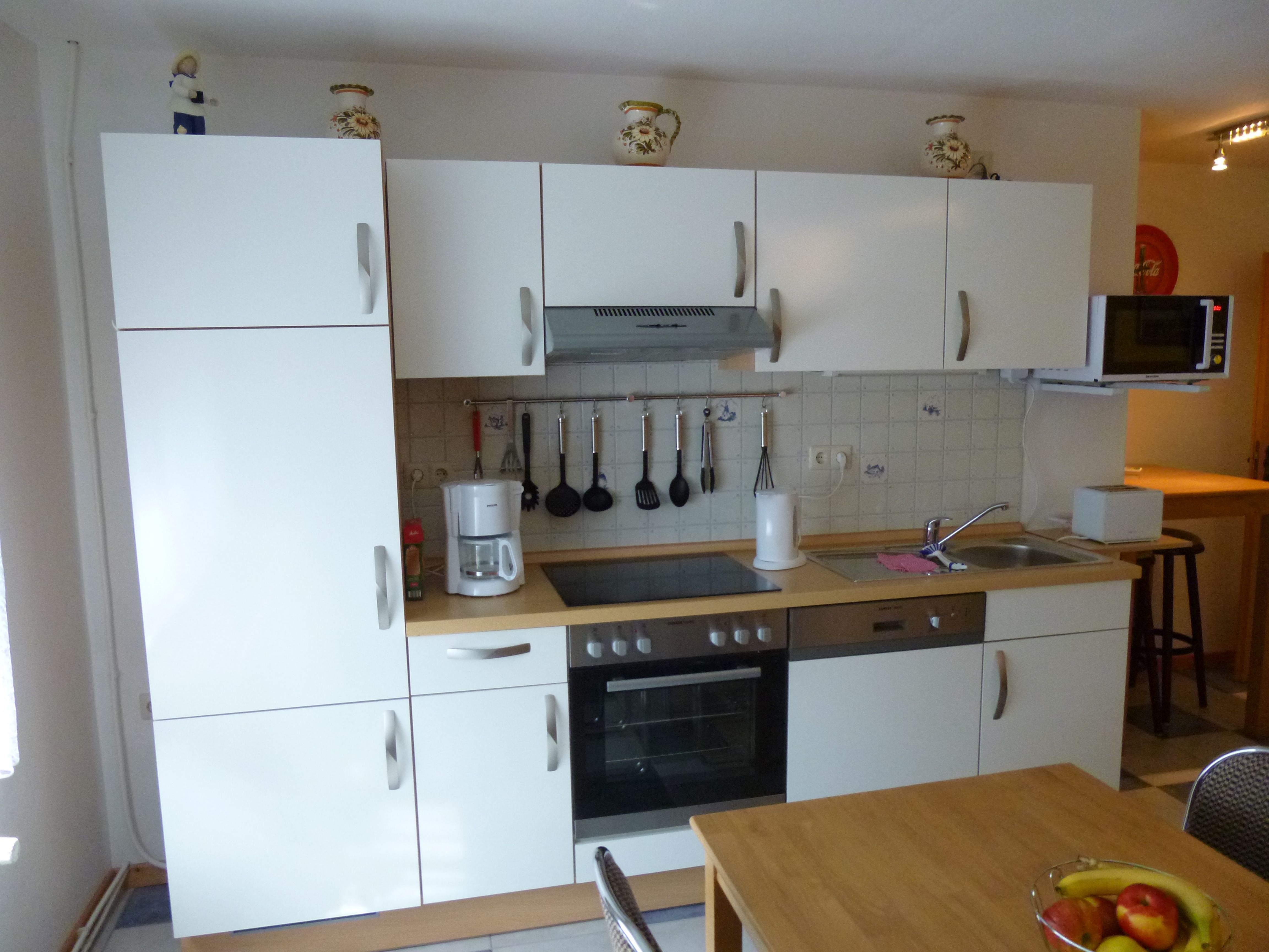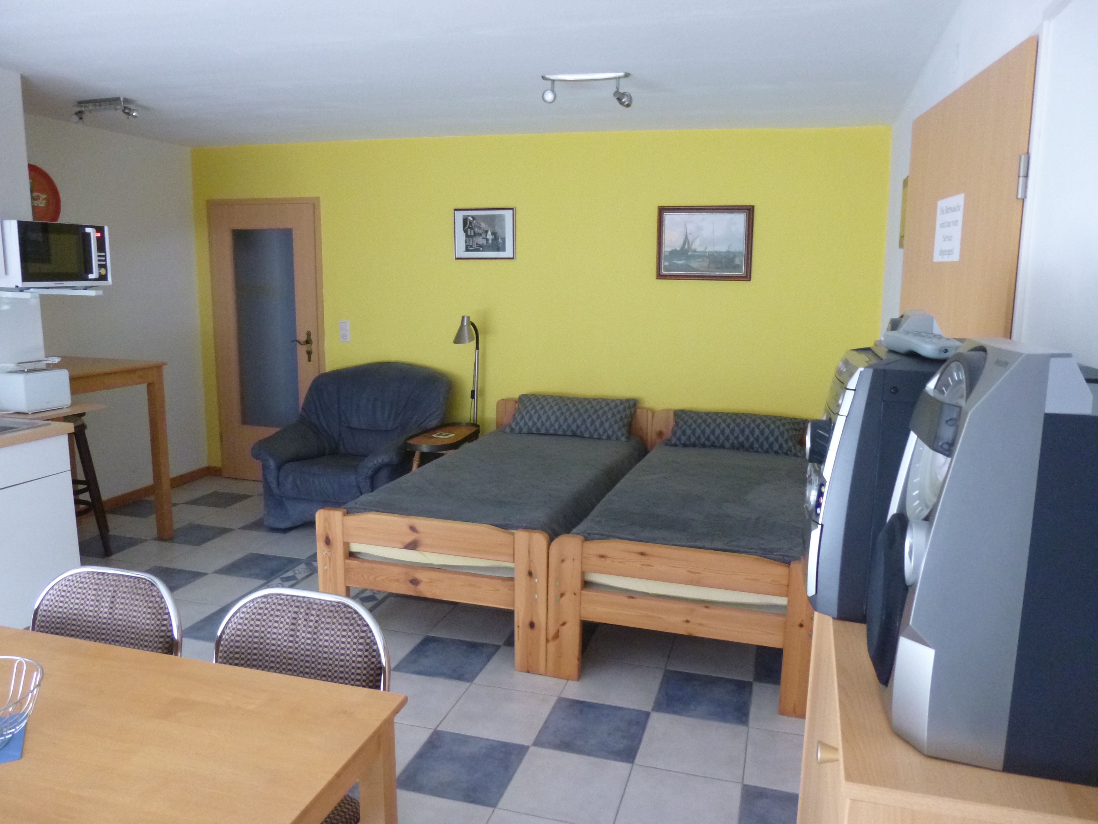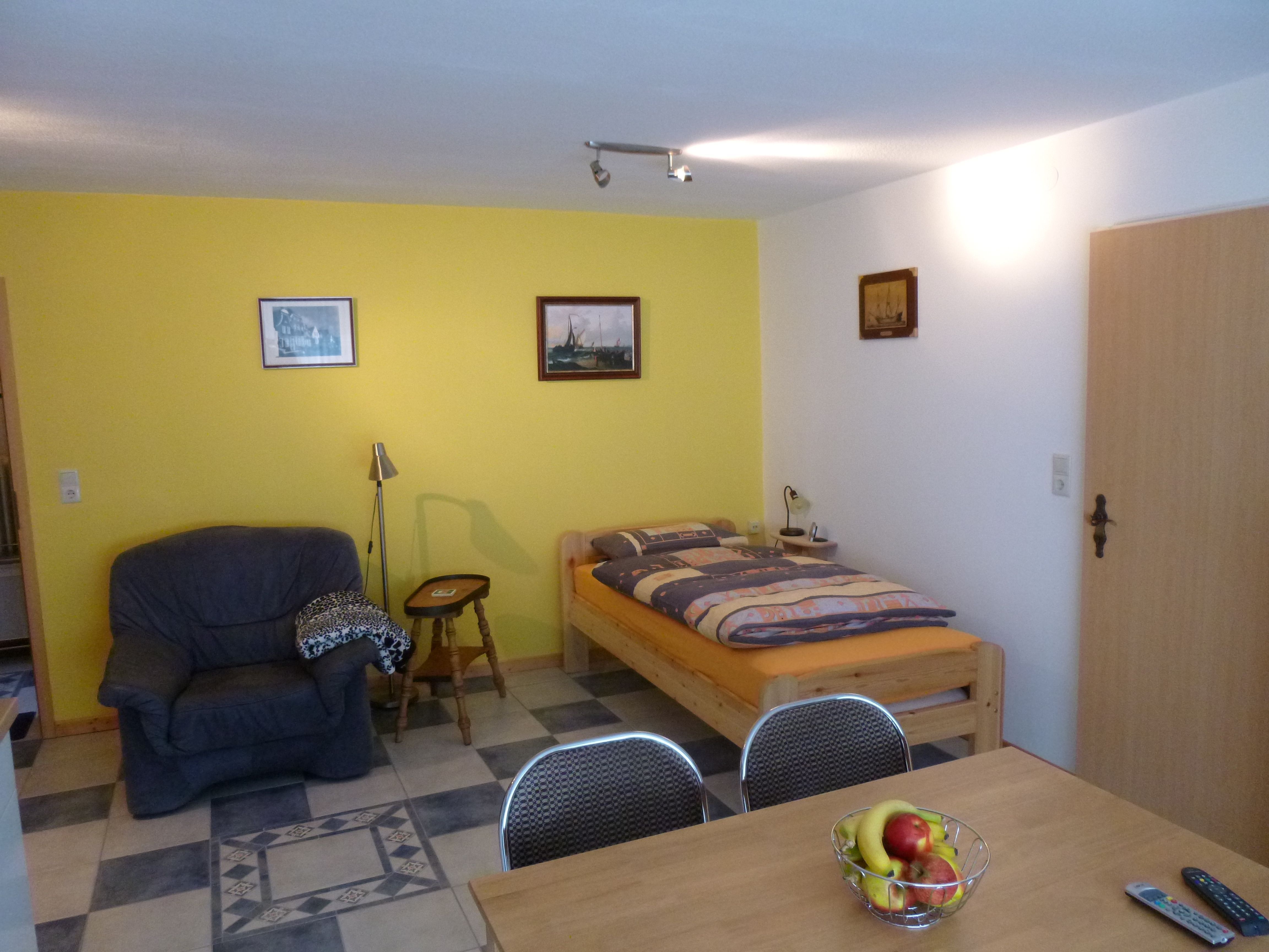 Die ca. 50 qm große Ferienwohnung verfügt über 1 Schlafzimmer und eine Wohnküche, sowie ein Badezimmer mit Dusche, WC, Waschmaschine und Trockner. In der Küche befindet sich ein Geschirrspüler, ein Herd mit Backofen, sowie eine Kaffeemaschine, Wasserkocher, Mikrowelle und eine Essecke. Im Wohnbereich befinden sich zwei zusätzliche Betten. Im Schlafzimmer, sowie in der Wohnküche steht den Gästen ein Fernseher zur Verfügung.
