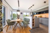 Die Strandvilla Zingst- AP 16 ist ein exklusives Penthouse mit 115 m², ideal für bis zu 4 Personen. Die moderne Unterkunft umfasst zwei stilvoll gestaltete Schlafzimmer und einen offenen Wohn- und Essbereich, der direkt mit einer voll ausgestatteten Küche verbunden ist. Hier stehen unter anderem ein Induktionsherd, Geschirrspüler und Kühlschrank zur Verfügung. Zwei Badezimmer mit offenen Duschen bieten zusätzlichen Komfort. Ein besonderes Highlight ist die private Sauna, die zur alleinigen Nutzung bereitsteht. Die Ausstattung umfasst auch eine eigene Waschmaschine und hochwertige Möbel.