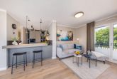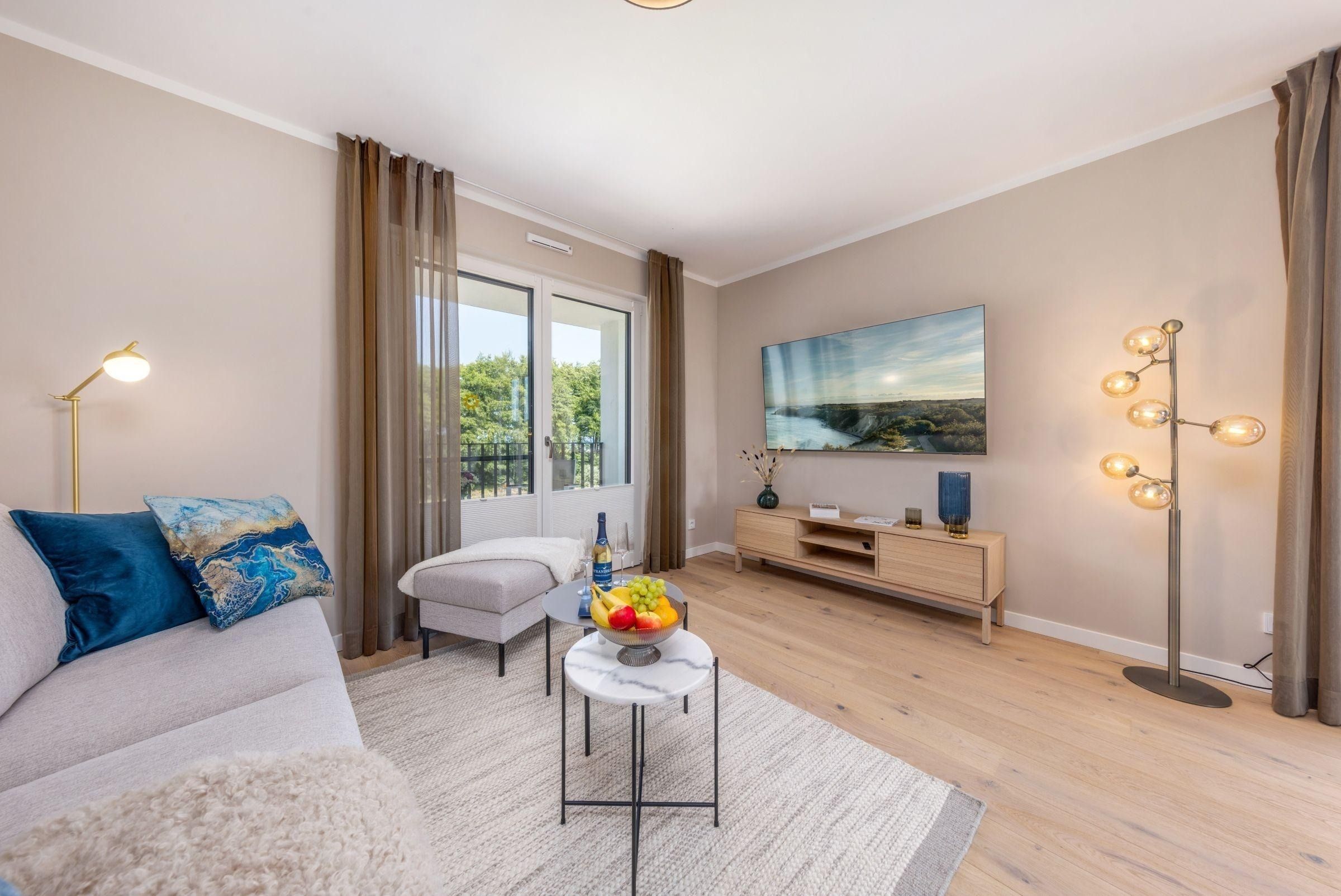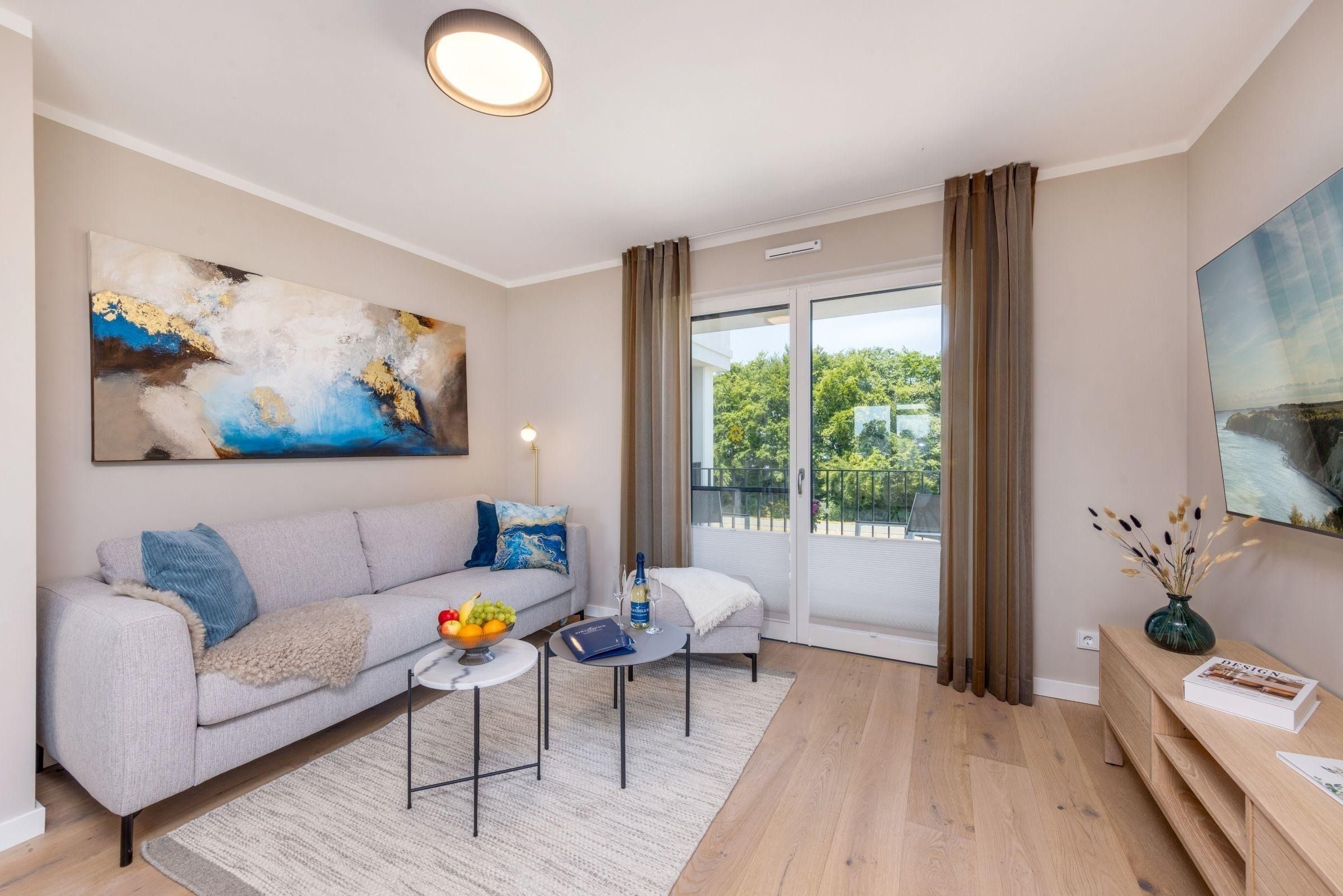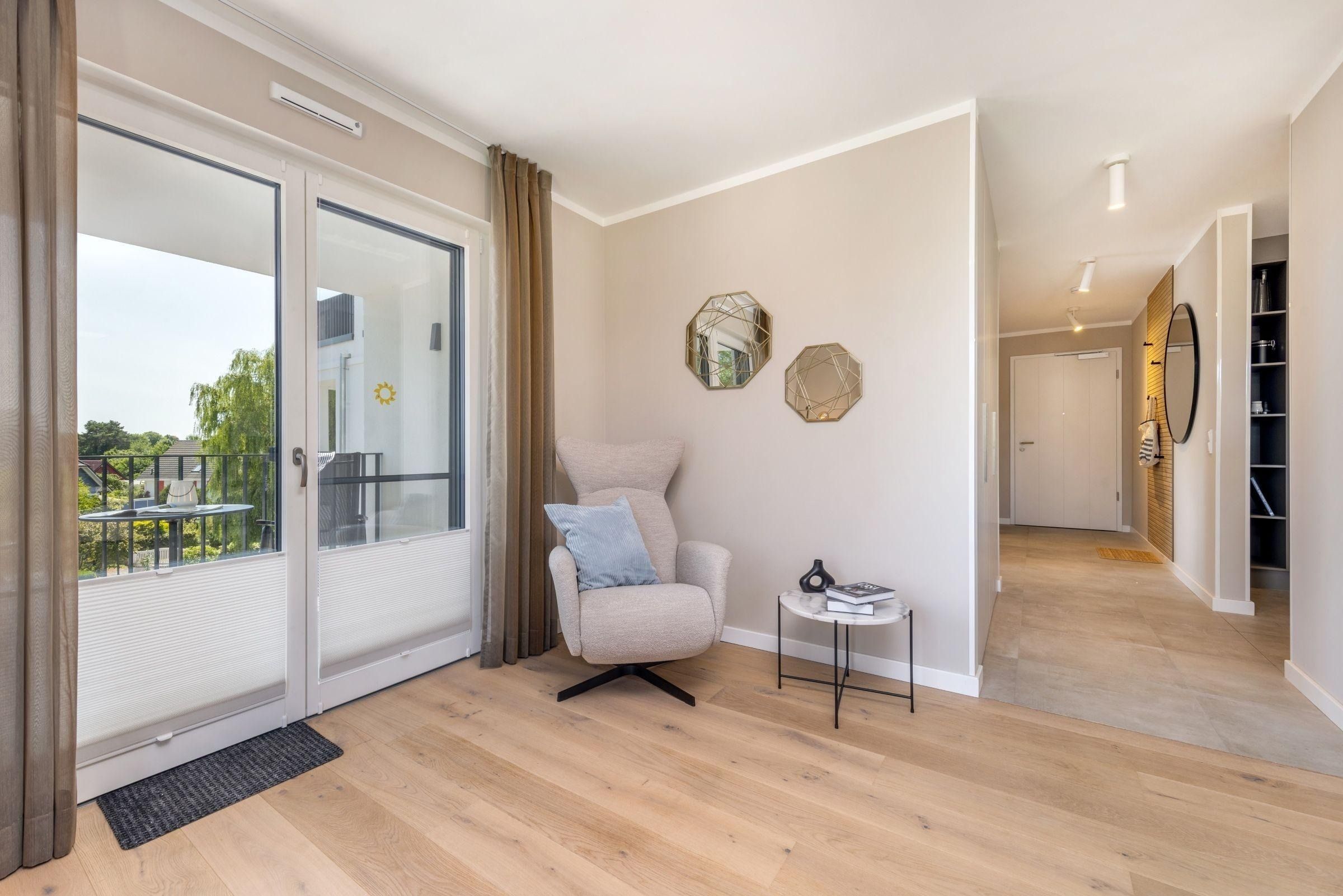Das Apartment 14 der Strandvilla Zingst ist eine moderne und barrierefreie Unterkunft mit 65 Quadratmetern, ideal für 2 Personen. Es umfasst ein Schlafzimmer und ein gemütliches Wohnzimmer mit einem Schlafsofa sowie einem offenen Wohn- und Essbereich. Die voll ausgestattete Küche bietet sämtliche Annehmlichkeiten, darunter einen Induktionsherd, eine Spülmaschine und eine Kaffeemaschine. Das gepflegte Badezimmer verfügt über eine bodengleiche Dusche, einen Kosmetikspiegel, einen Haartrockner und eine Sauna zur Eigennutzung. Ein Kleiderschrank sowie ein Einbauschrank im Flur sorgen für ausreichend Stauraum. Für zusätzlichen Komfort stehen ein überdachter Balkon, ein Wäscheständer sowie ein Bügelbrett und Bügeleisen zur Verfügung. Ein Stellplatz in der Tiefgarage sowie ein Fahrradabstellraum mit Lademöglichkeiten für E-Bikes ergänzen die Ausstattung.