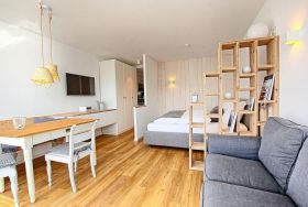 Sie verfügt über rund 35 m² und wurde im Jahre 2018 komplett neu ausgestattet. Das Zimmer mit traumhaftem Blick. Ruhe und Entspannung. Aktiv mit hauseigenem Bootssteg und Surfunterstand. Sie müssen entscheiden - in jedem Fall aber ist dies der perfekte Ort für Ihre Auszeit in Heiligenhafen. Vom Flur haben sie einen direkten Zugang zum hell und freundlich in weiß gestalteten Badezimmer und in den Küchenbereich. Von hier aus öffnet sich der Blick in das große, lichtdurchflutete Wohn-/Schlafzimmer mit Westausrichtung. Der Wohnbereich ist einheitlich mit hellen Designermöbeln gestaltet und von hoher Qualität. Durch die geschickte Raumaufteilung können sie sowohl von der Couch als auch aus dem Bett fernsehen. Ein bequemes Sofa, der Essplatz für bis zu 4 Personen und das gemütliche Bett laden zum Verweilen ein. Für das perfekte Ambiente sorgen zahlreiche Kerzenleuchter und kuschelige Decken. Über die gesamte Länge der Wohnung zieht sich ein überdachter Balkon, der ab dem frühen Nachmittag bis in den Abend von der Sonne beschienen wird. Bei Wind und Regen bietet er ausreichend Schutz, sodass sie auch dann die frische Luft genießen können.