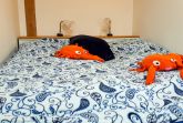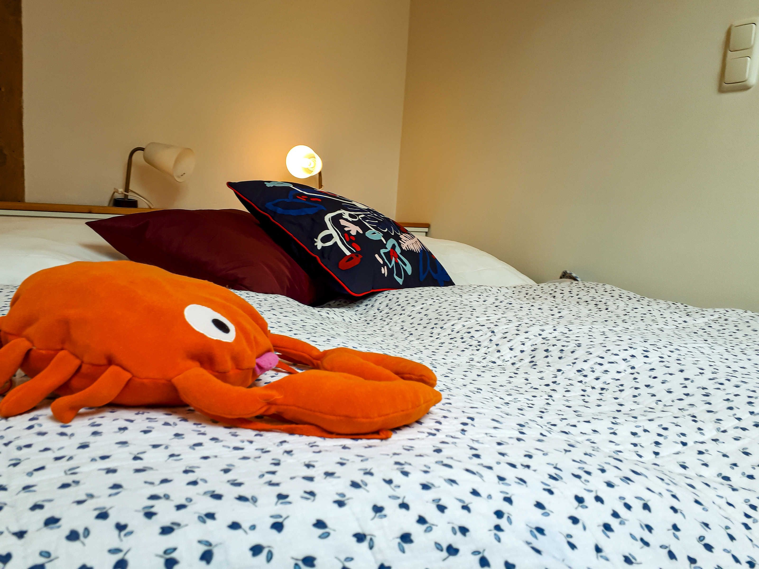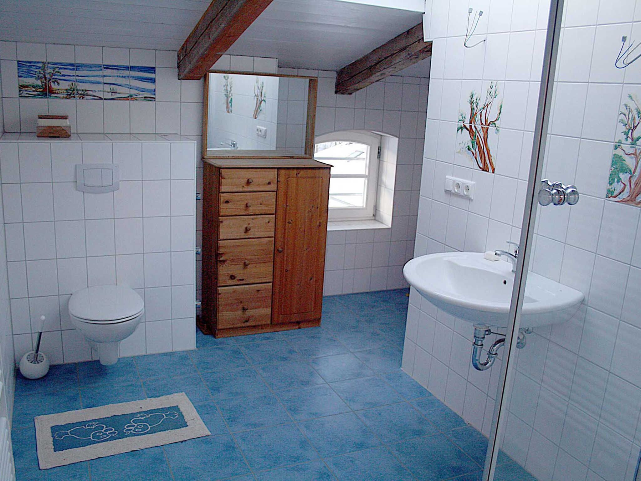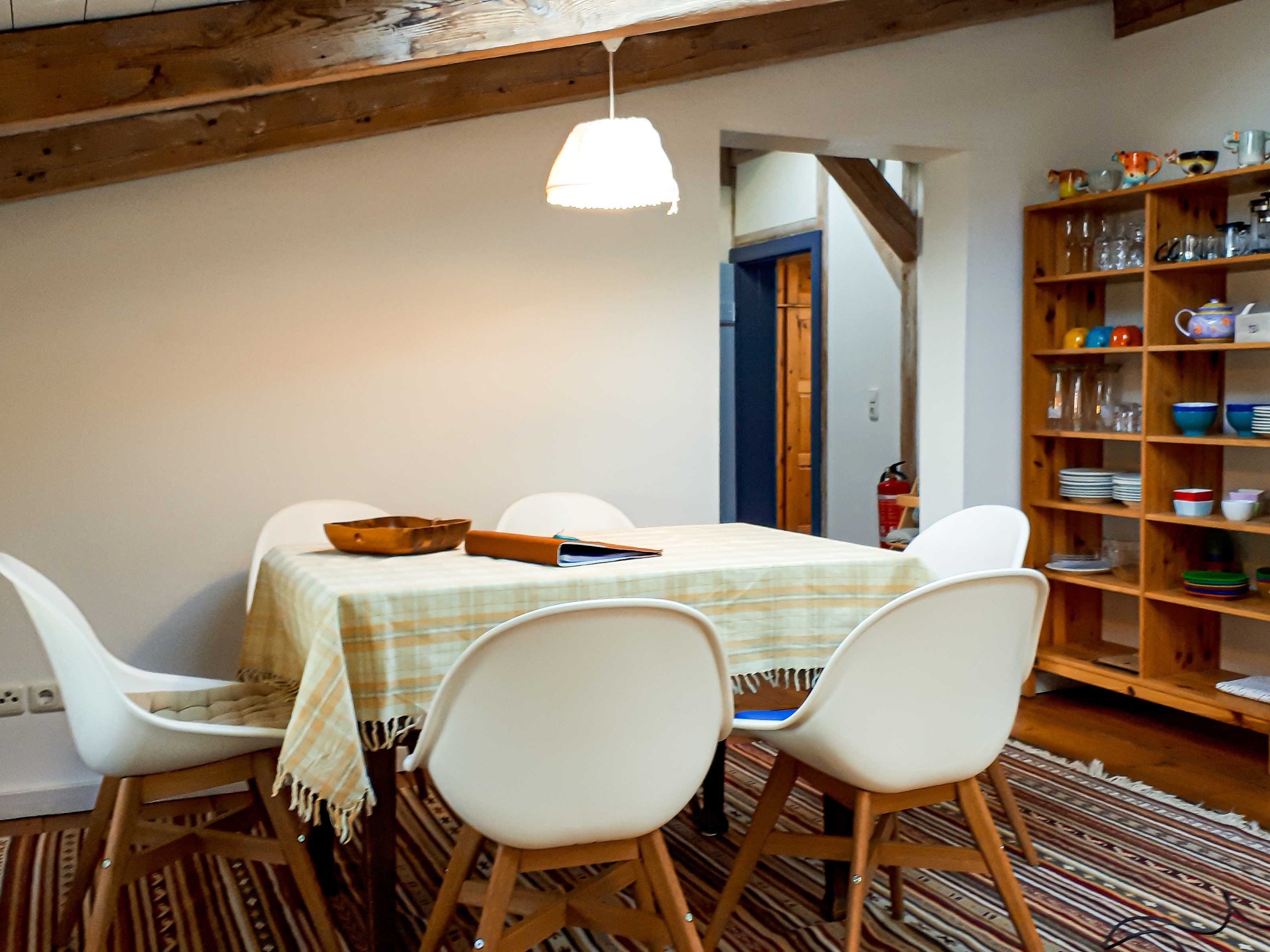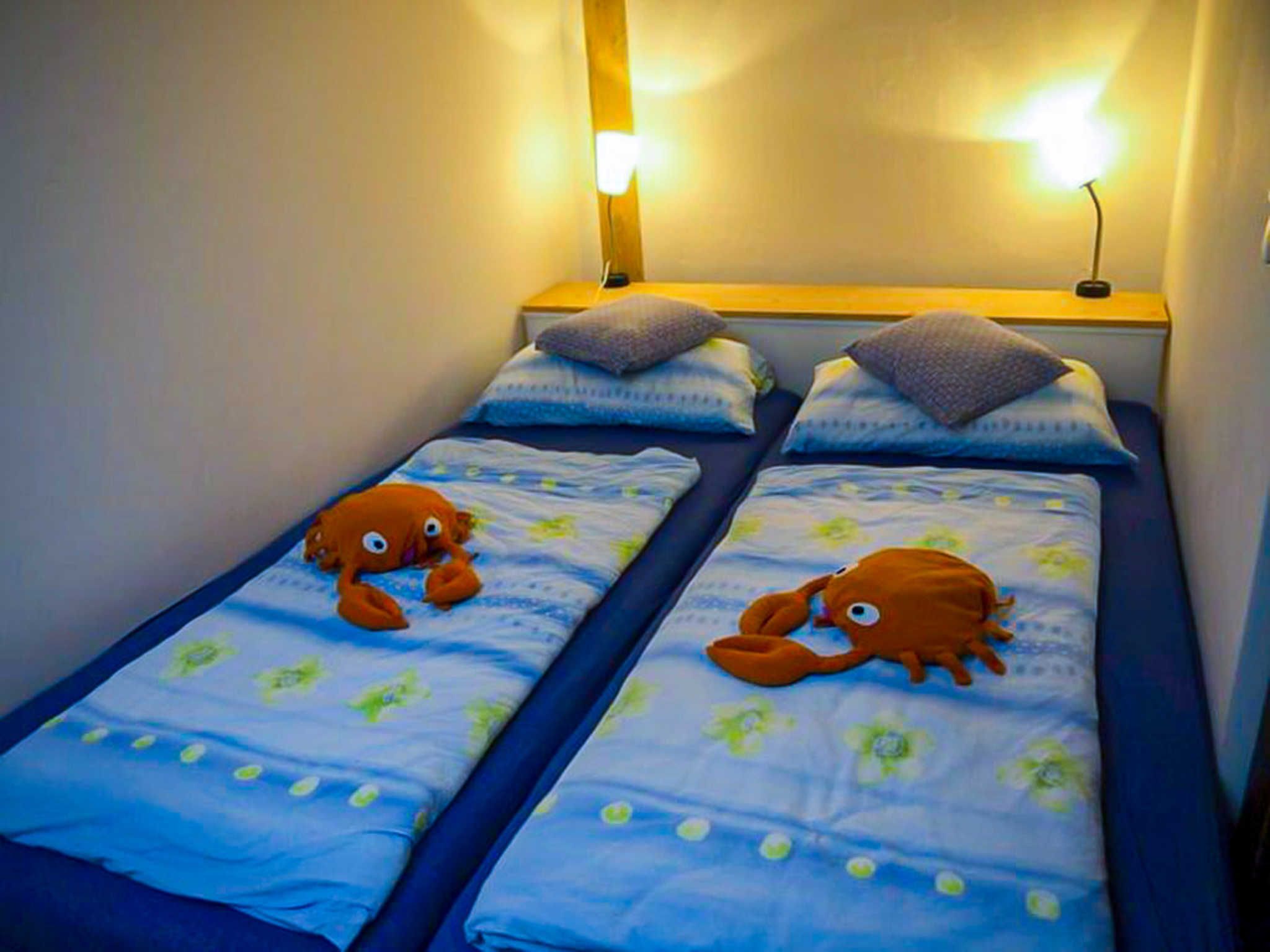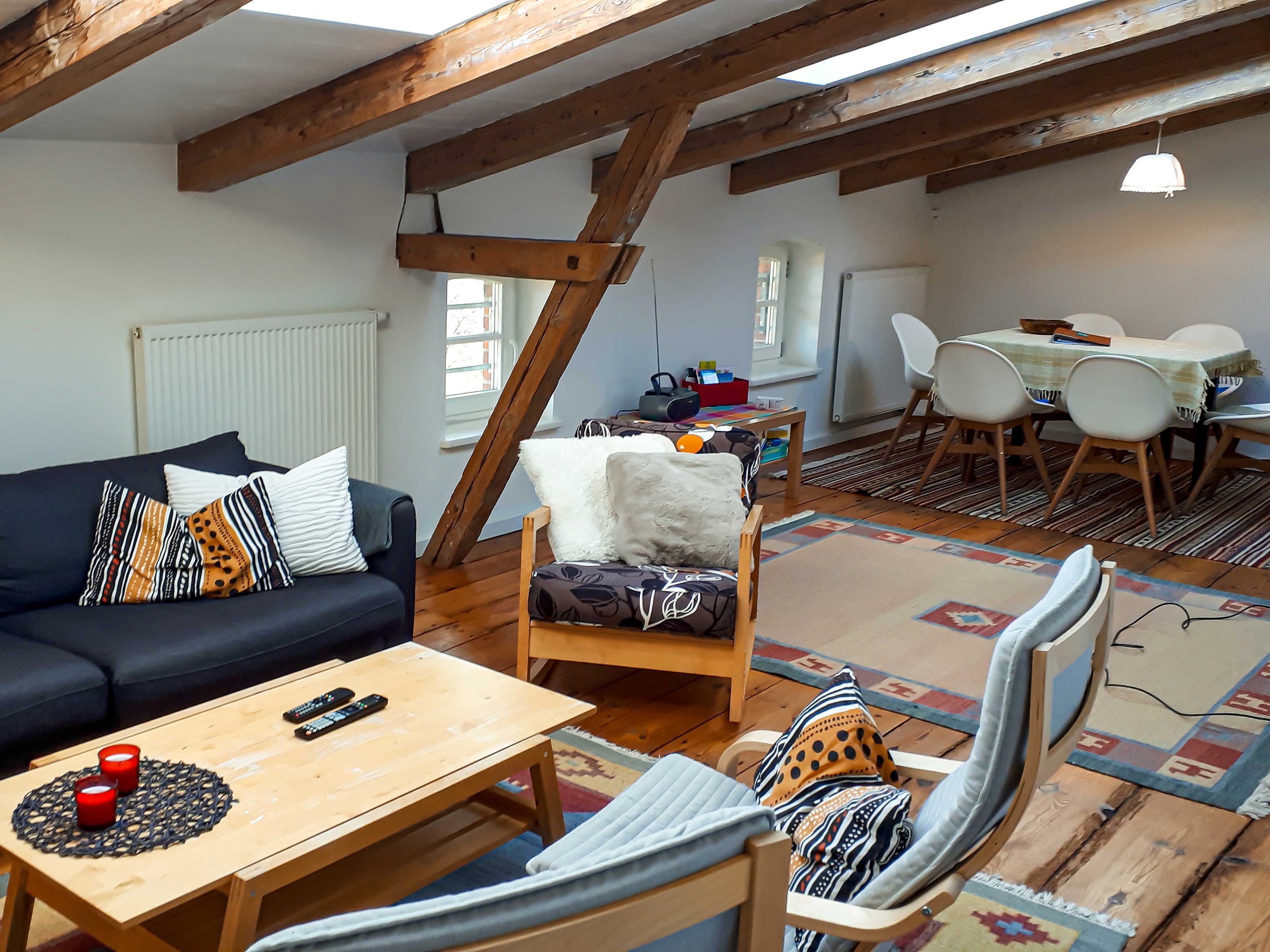 Diese charmante Ferienwohnung im Dachgeschoss verbindet rustikalen Charme mit viel Platz für bis zu 6 Personen. Auf 96 m² erwartet dich eine heimelige Atmosphäre mit Dachschrägen und sichtbaren Holzbalken, die der Wohnung eine ganz besondere Gemütlichkeit verleihen. Das Wohnzimmer mit Sofa, Sesseln und TV lädt zum Entspannen ein. In der separaten Küche kannst du mit Backofen, Herd, Kühlschrank und Spülmaschine problemlos deine Lieblingsgerichte zubereiten. In den drei separaten Schlafzimmern findet jeder seinen perfekten Schlafplatz: Während das Hauptschlafzimmer mit einem Doppelbett (160x200) ausgestattet ist, stehen in den beiden anderen Zimmern jeweils zwei Einzelbetten (90x200) zur Verfügung. Das Badezimmer mit Dusche sorgt für Erfrischung am Morgen und Entspannung am Abend. Die Wohnung ist über eine steile Treppe erreichbar – doch wer einmal oben angekommen ist, wird mit einer besonders gemütlichen Atmosphäre belohnt!