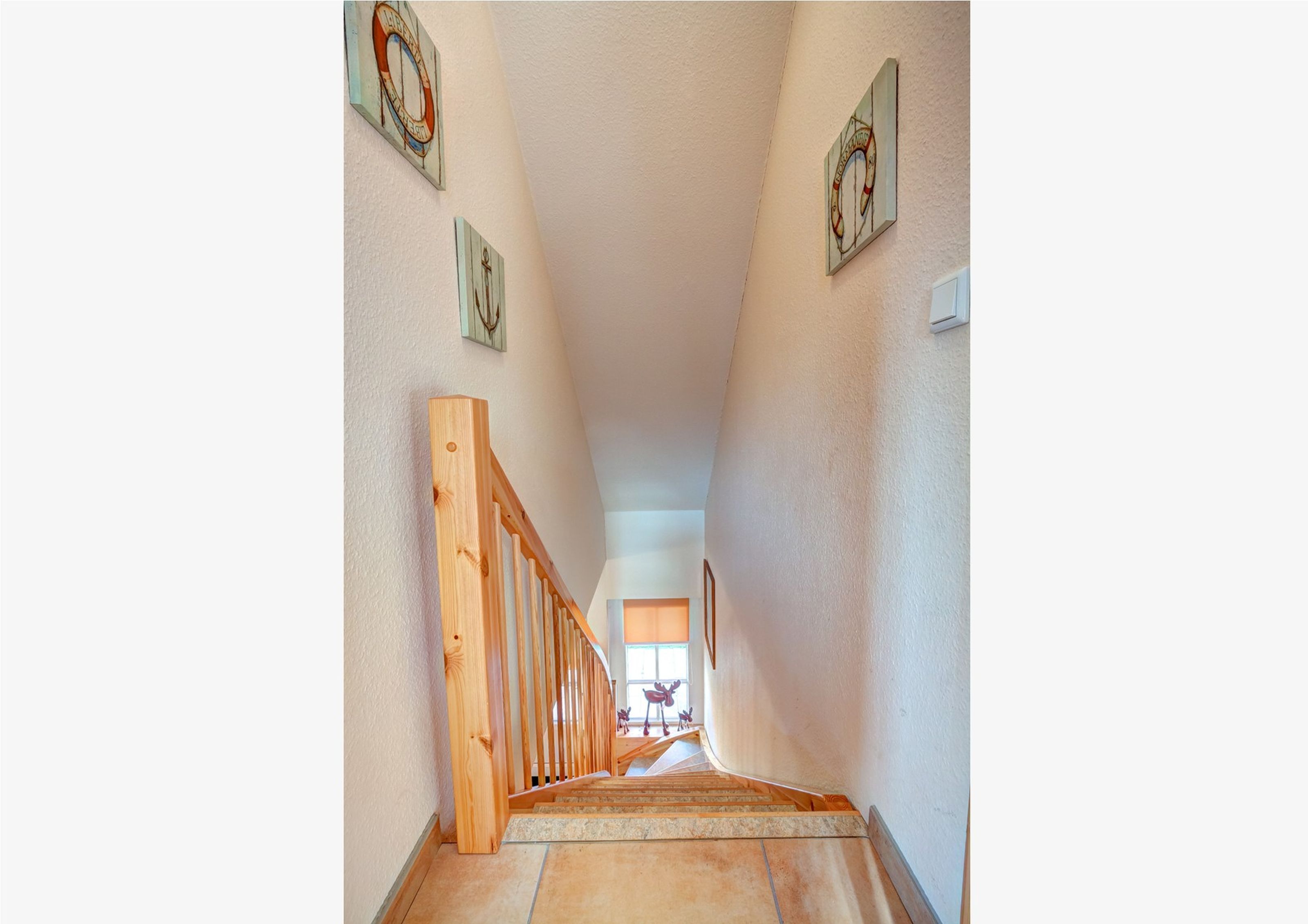 Über die Holztreppe im Flur gelnagen Sie in das Obergeschoss des Hauses.Hier befinden sich zwei weitere Schlafzimmer: ein Kinderzimmer mit zwei Einzelbetten und einem kleinen Schreibtisch, sowie ein Schlafzimmer mit Doppelbett und einer Kommode.