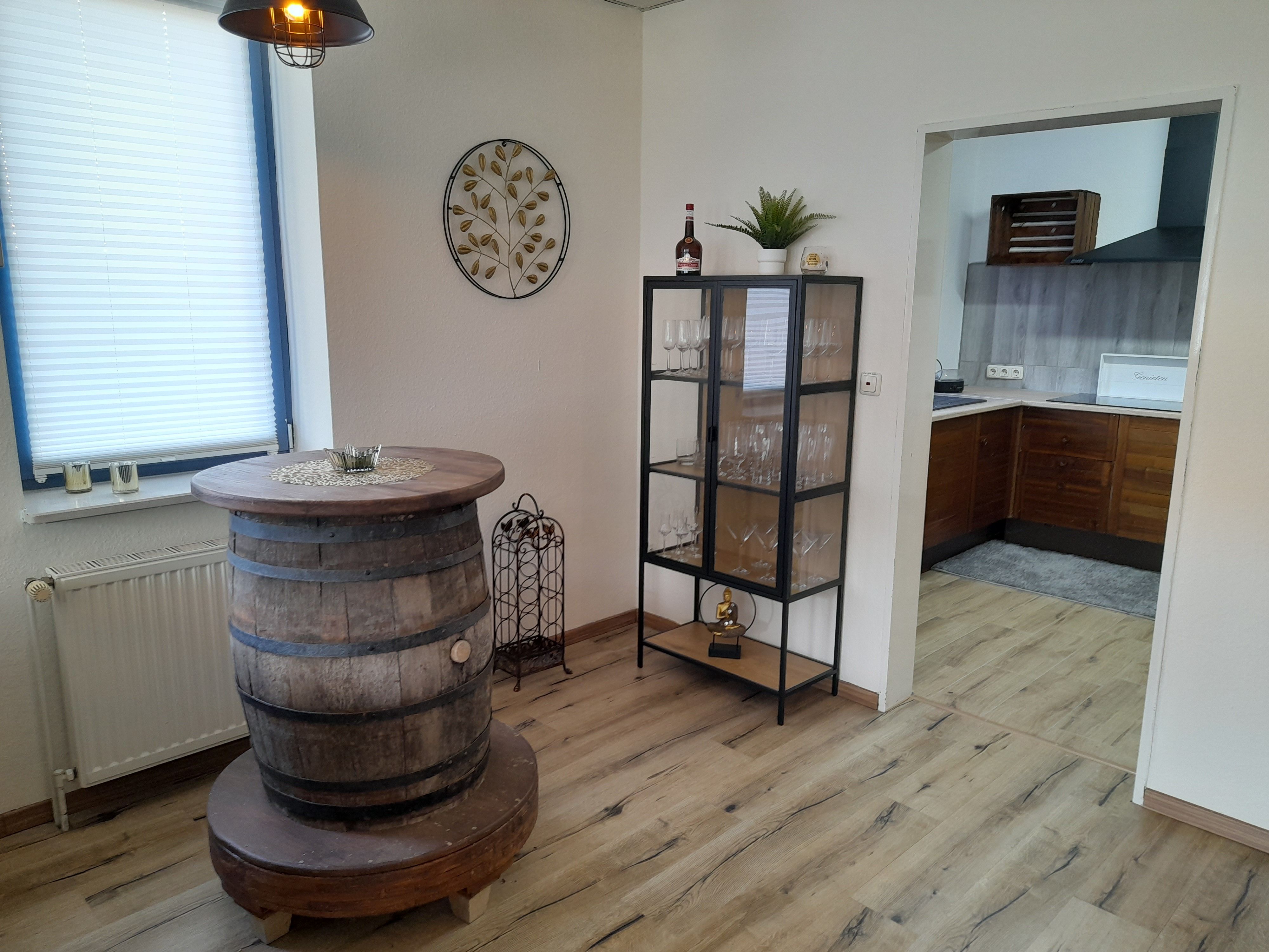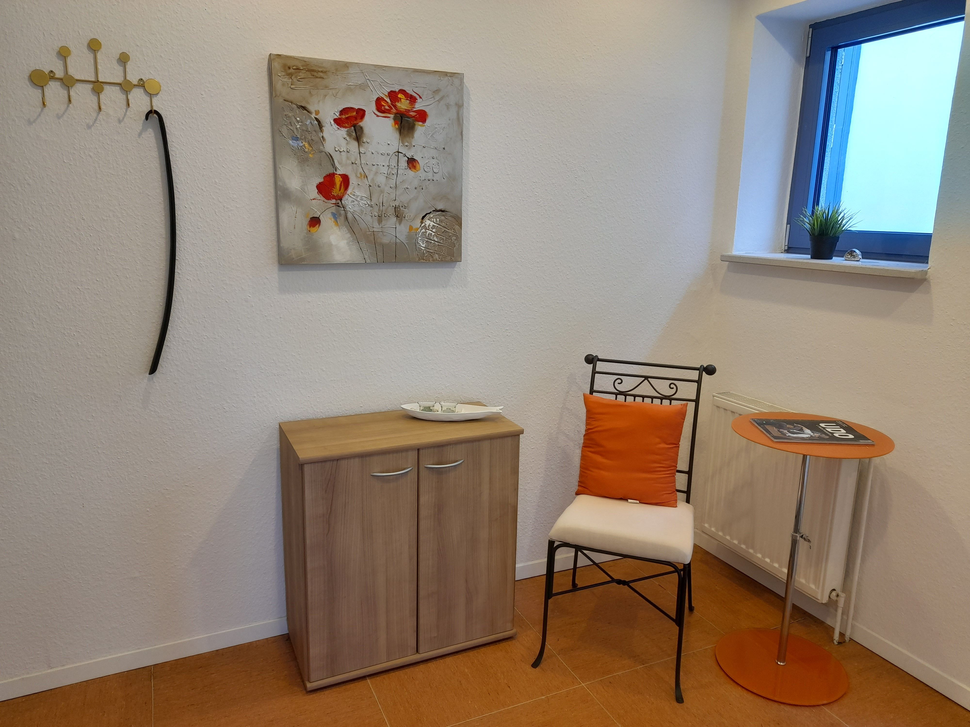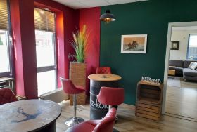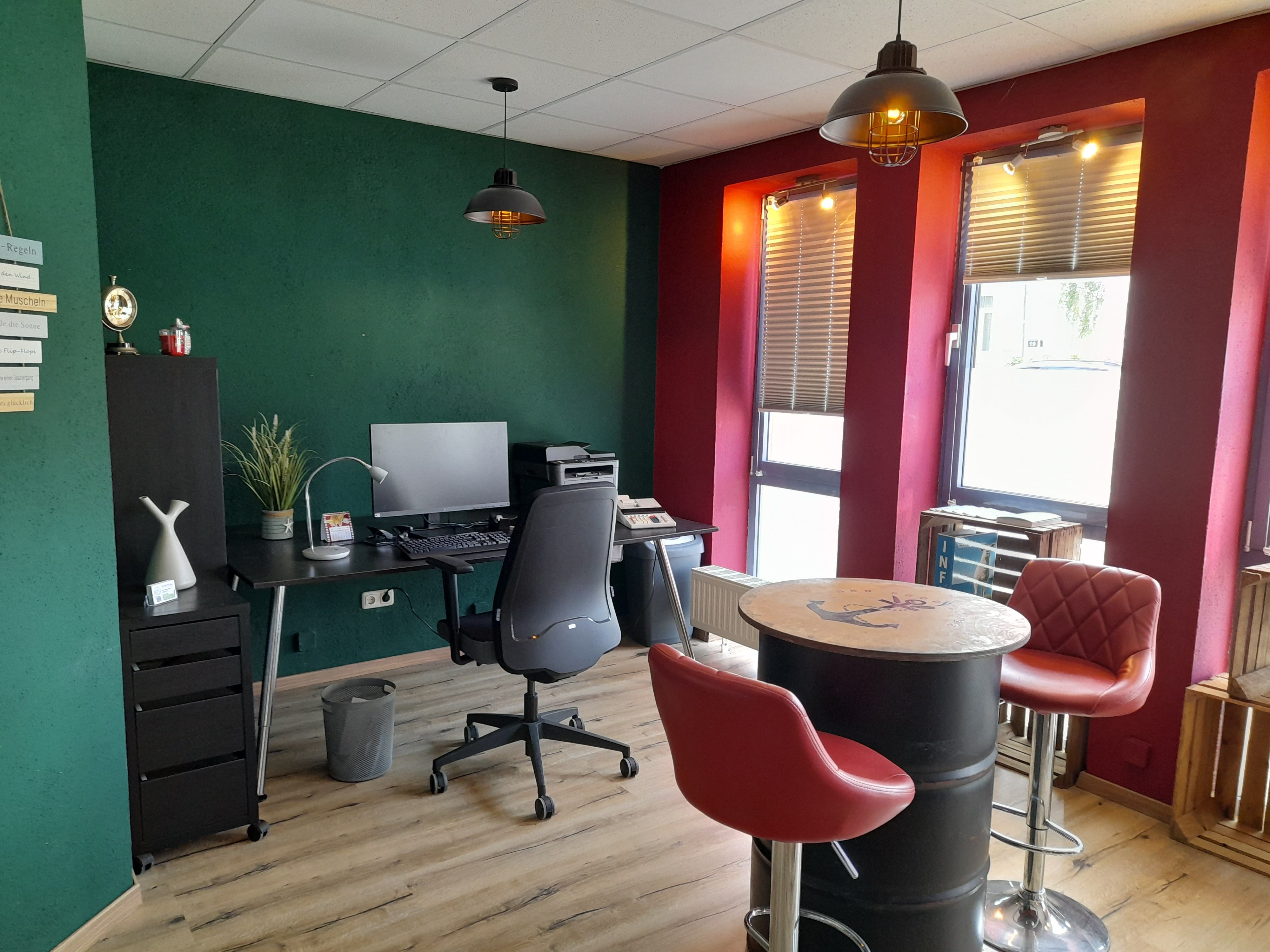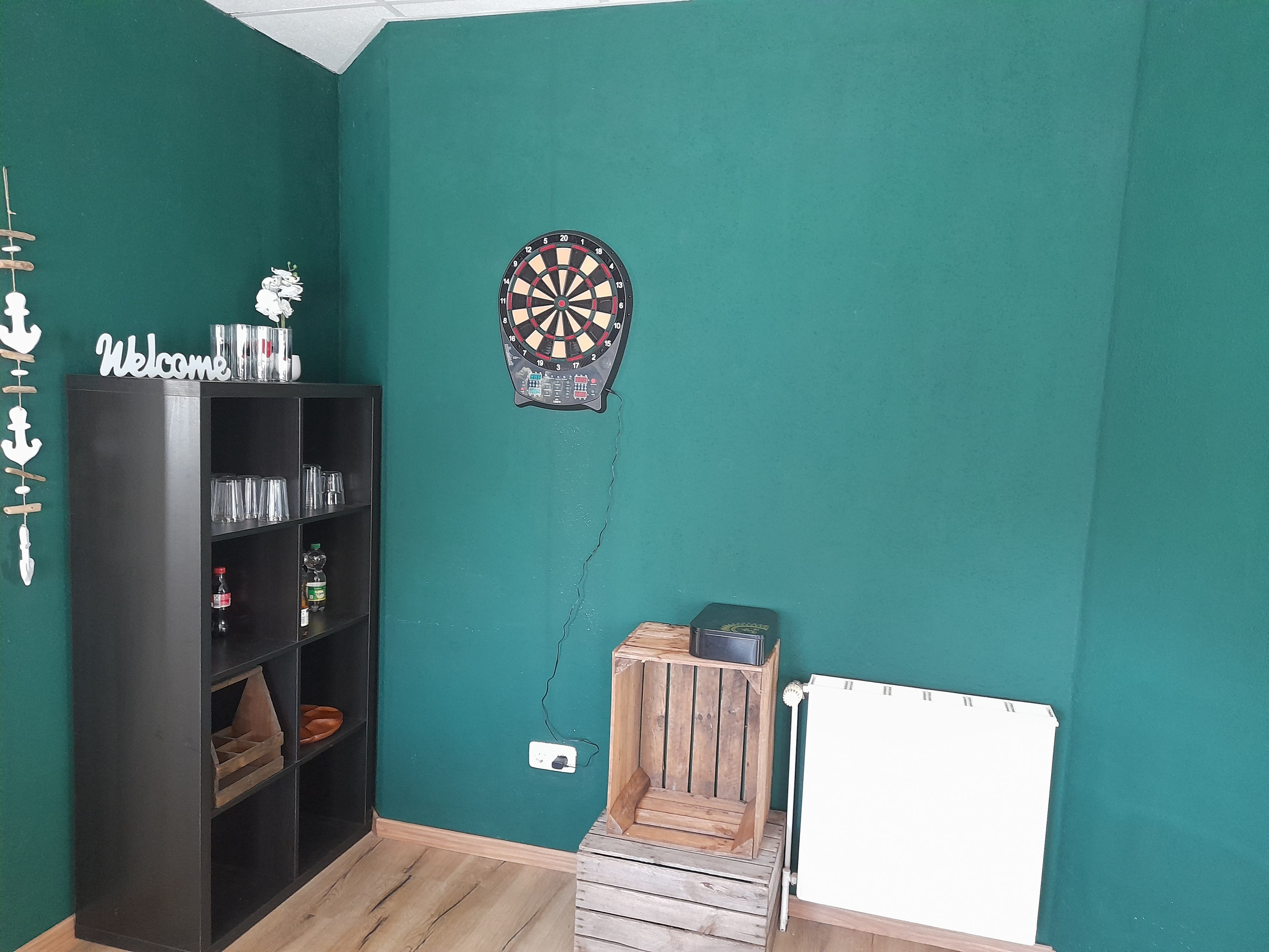 Nach Betreten des Flurbereiches mit Garderobe und kleiner Sitzgelegenheit finden Sie links gelegen den Arbeitsraum mit großem Schreibtisch, PC und Monitor ideal fürs Home-Office. Ein schnelles WLAN steht selbstverständlich bereit. Für entspanntes Networking oder kurze Pausen gibt es Bar-Stehtische und eine elektrische Dartscheibe.