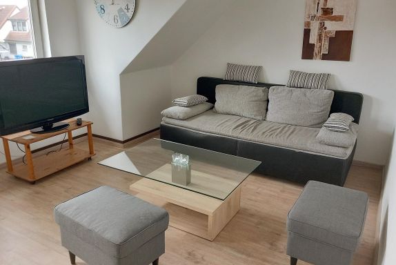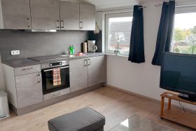 Die Ferienwohnung im 1. Obergeschoss verfügt über 2 Schlafzimmer mit insgesamt 4 Betten, ein Wohnzimmer mit voll ausgestatteter Küchenzeile und ein Bad mit Dusche, Waschbecken und Toilette. Große Terrasse zur Gemeinschaftsnutzung.