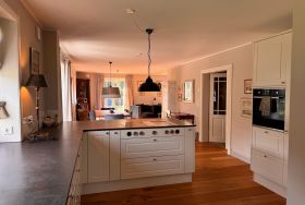Die Küche mit anschließendem Ess-und Wohnbereich lädt zum gemeinsamen kochen ein. An kälteren Tagen wärmt sie der Kaminofen in den hellen wohnlichen Räumen.