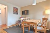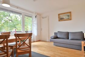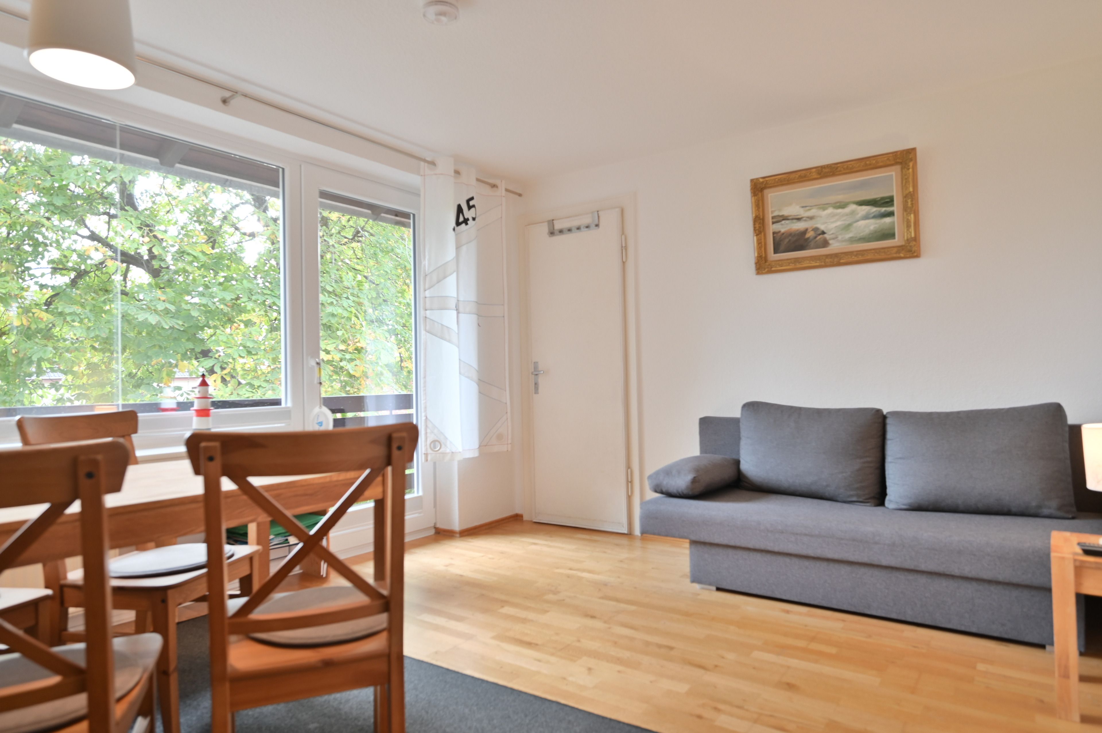 In herrlich ruhiger Kurparklage befindet sich diese kleine Ferienwohnung im 1. OG einer kleinen familiären Appartementanlage, mit nur fünf weiteren Wohnungen, die zum Teil ausschließlich von den Eigentümern genutzt werden. Die Ferienwohnung verfügt über zwei Zimmer und bietet bis zu vier Schlafplätze (Schlafzimmer mit zwei Einzelbetten, Wohnzimmer mit Schlafcouch). Im Wohnzimmer ist Echtholz-Eichenparkett verlegt, im Schlazimmer gleichfalls Eichenparkett und in Flur und Küche befinden sich Echtholzdielen. Die kleine separate Küche verfügt über eine Einbauküche mit E-Herd mit Cerankochfeld, Kühl-Gefrierschrank, Mikrowelle, Kaffeemaschine, Wasserkocher etc. Im Wohnzimmer gibt es einen Flachbild-Sat-Fernseher. Das Duschbad ist im Jahr 2019 grundlegend modernisiert worden inklusive neuer Fliesen und Fußbodenheizung.