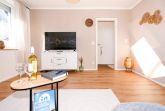 Im Wohnzimmer erwartet Sie eine bequeme Schlafcouch mit einer Liegefläche von ca. 140 cm x 200 cm, perfekt für eine erholsame Nacht. Ein kleiner Esstisch bietet Platz für bis zu vier Personen, ideal für gemeinsame Mahlzeiten.