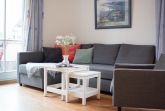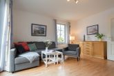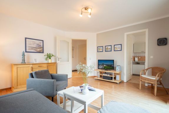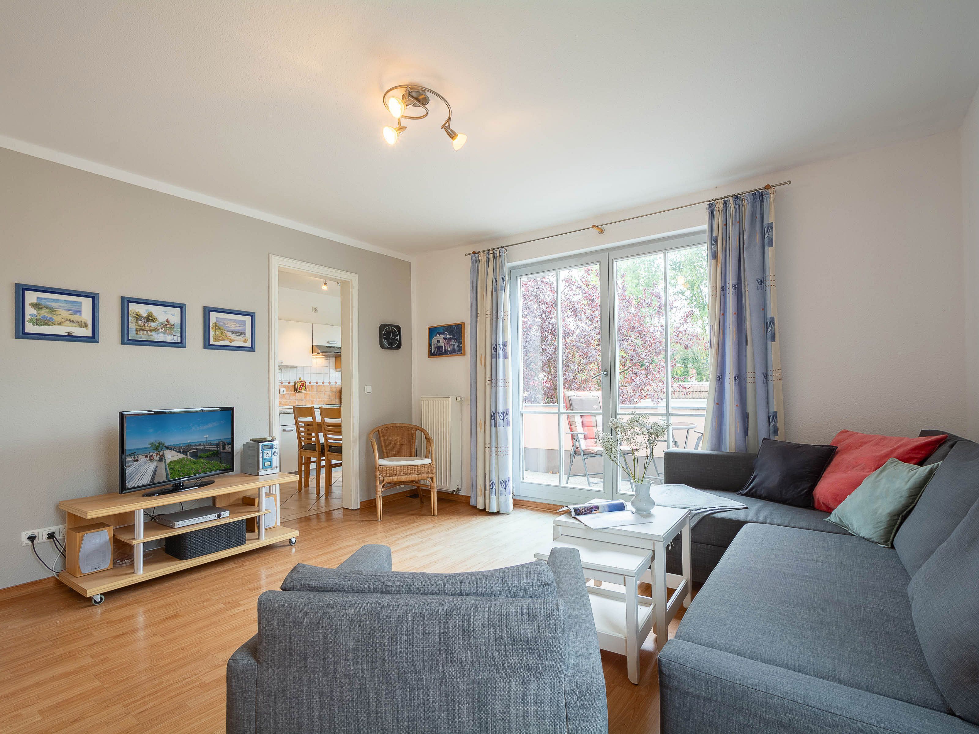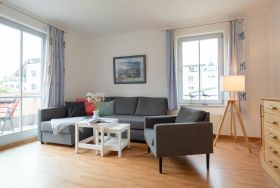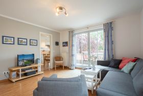 Das helle Wohnzimmer ist mit einer bequemen Schlafcouch, einem Flat-TV und einem DVD-Player ausgestattet. Von hier aus gelangen Sie direkt auf den sonnigen Balkon in Süd-West-Lage. Hier können Sie den Tag bei einem ausgedehnten Frühstück beginnen oder abends mit einem Glas Wein den Sonnenuntergang genießen. Der möblierte Balkon bietet einen ruhigen Platz im Freien, um frische Ostseeluft zu tanken und die Urlaubsstunden entspannt ausklingen zu lassen.