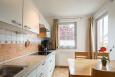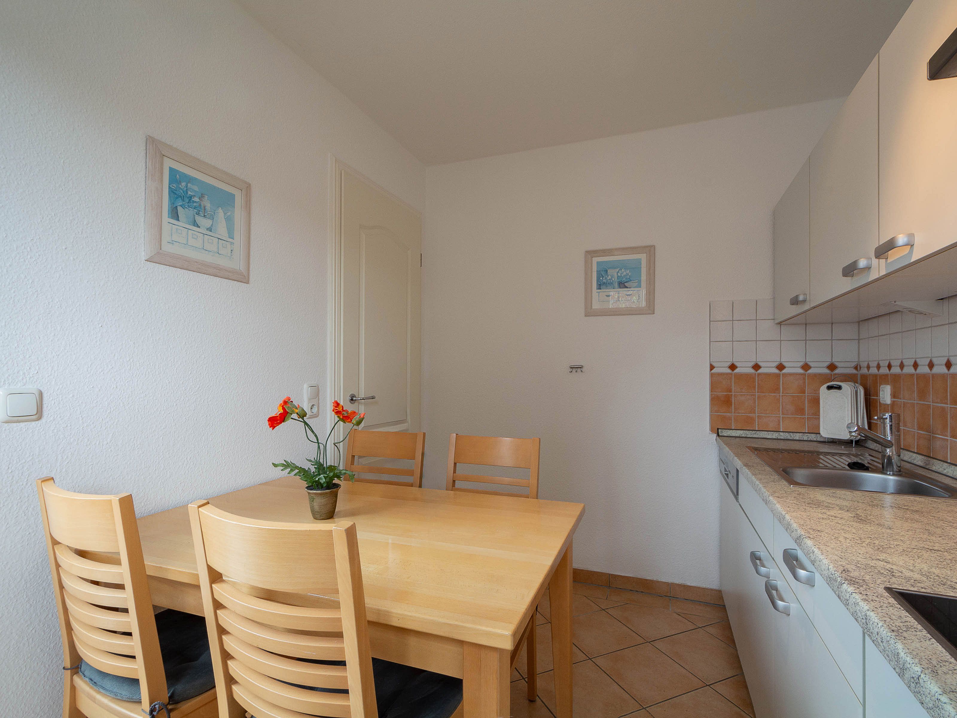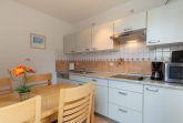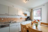 Die separate Küche verfügt über einen Geschirrspüler, ein Cerankochfeld mit vier Kochzonen, eine Mikrowelle sowie einen Kühlschrank mit Gefrierfach. Kaffeemaschine, Wasserkocher und Toaster stehen ebenfalls bereit. In der Küche befindet sich auch der Esstisch, an dem sich gemeinsame Mahlzeiten in gemütlicher Atmosphäre genießen lassen.