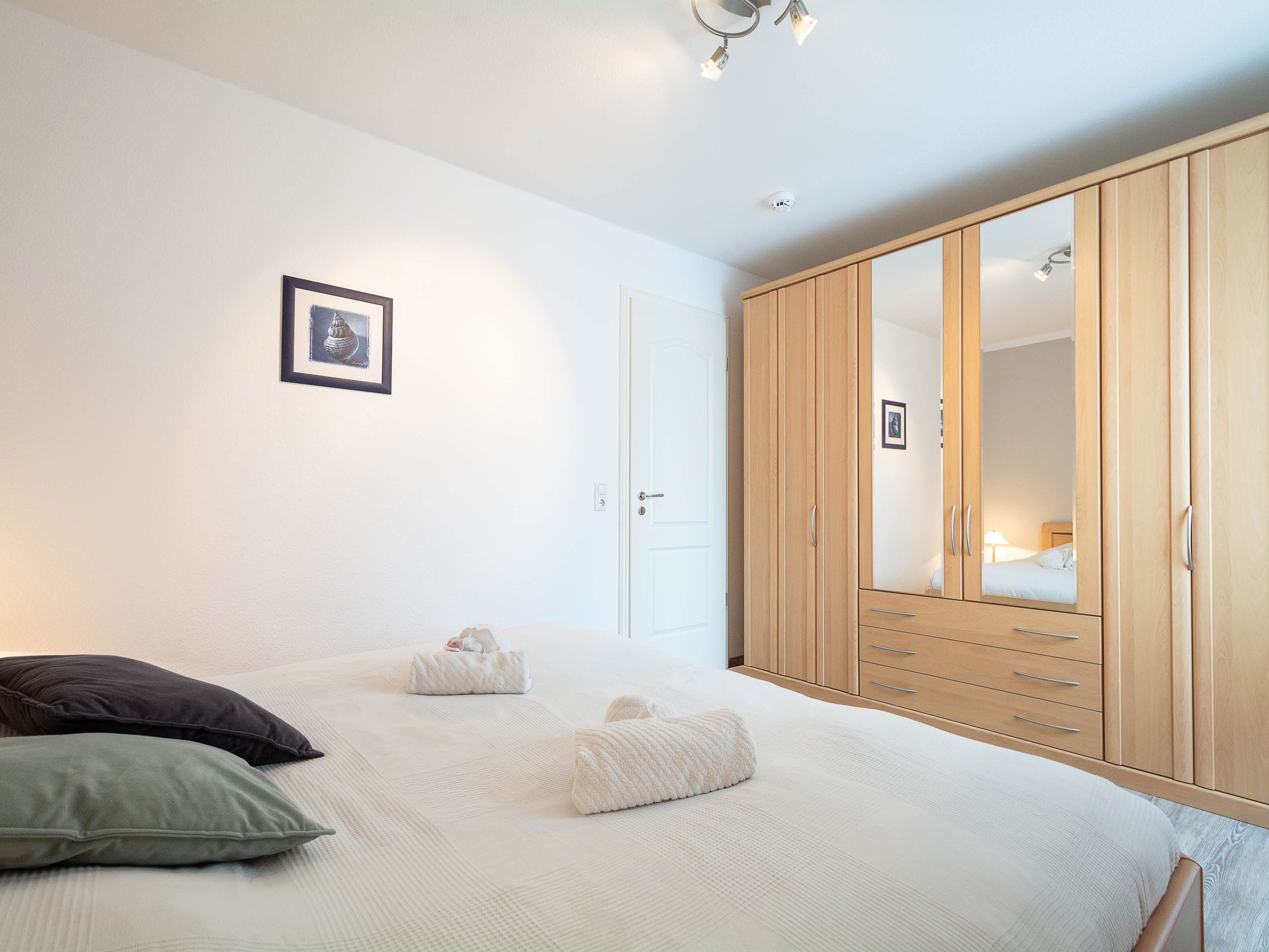 Das Schlafzimmer ist mit einem komfortablen Doppelbett eingerichtet und bietet durch den großen Kleiderschrank mit Ganzkörperspiegel ausreichend Stauraum. Das Badezimmer ist mit einer Badewanne mit Duschvorrichtung, Waschbecken, WC, Handtuchheizkörper und Fön ausgestattet und sorgt sowohl für entspannte Wannenbäder als auch für eine schnelle Dusche.