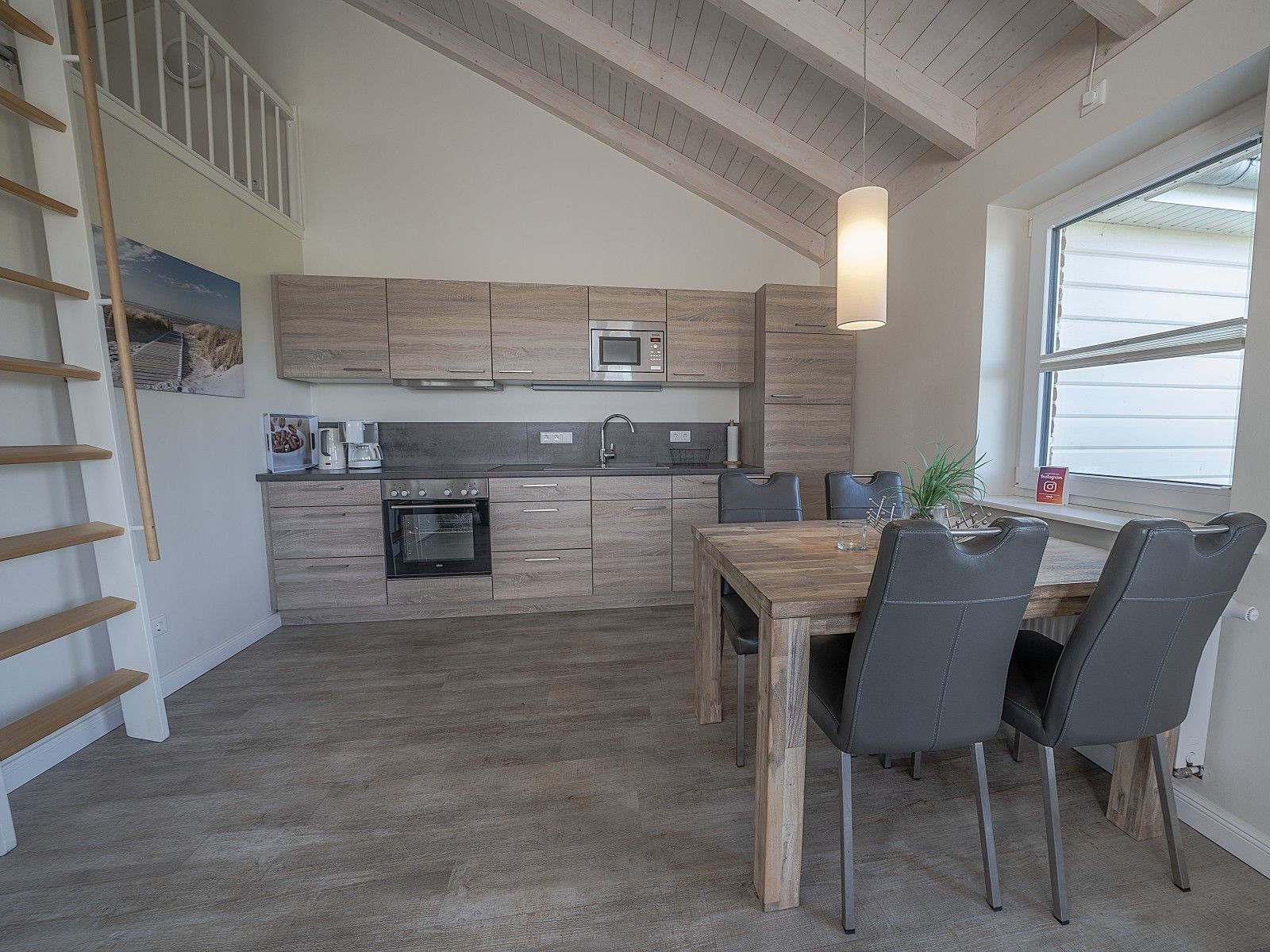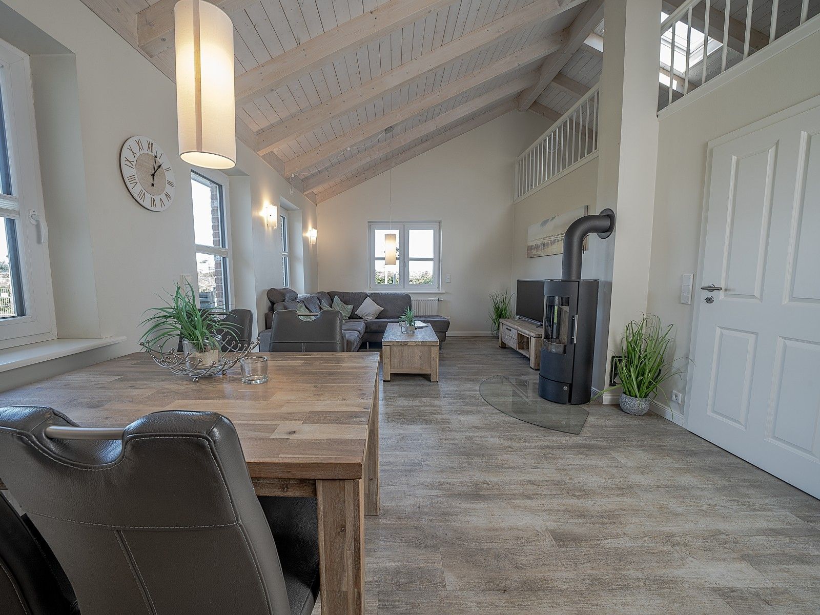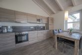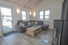 Der lichtdurchflutete Wohn- und Essbereich kombiniert eine voll ausgestattete Küchenzeile, einen Essplatz und eine gemütliche Sofaecke mit Kaminofen. Das Schlafzimmer ist mit einem komfortablen Doppelbett eingerichtet, und im Badezimmer sorgt die Fußbodenheizung für angenehme Wärme.
