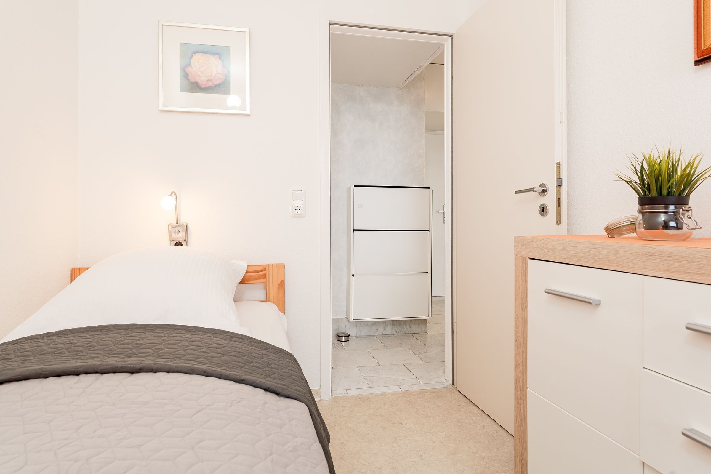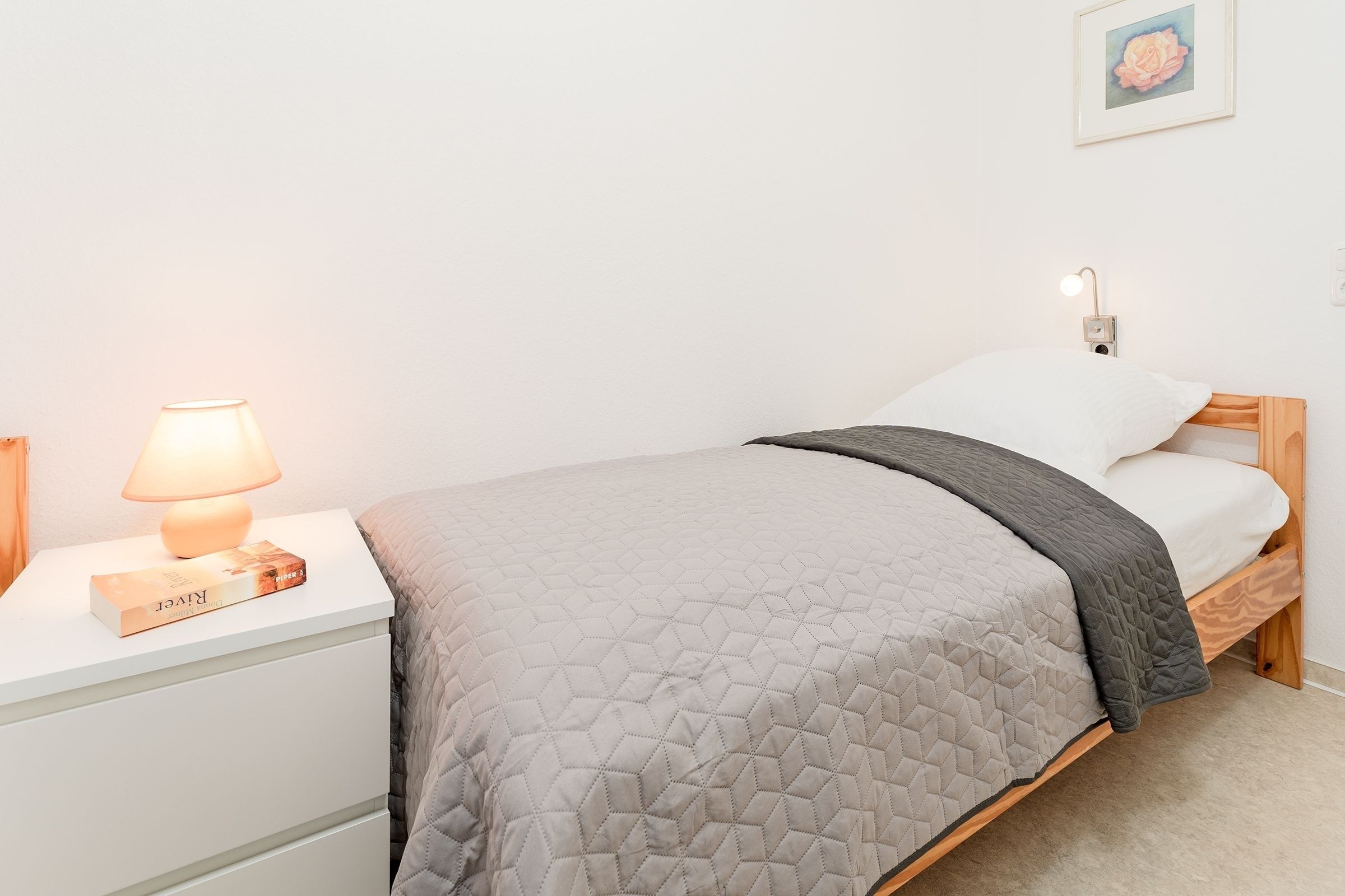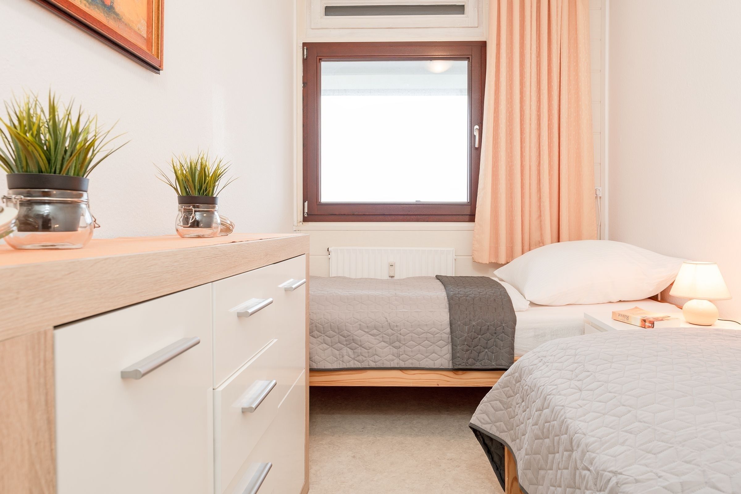 Schlafzimmer: 2 Einzelbetten (2x 90x190 cm), Kommode, Verdunkelung (Gardinen)