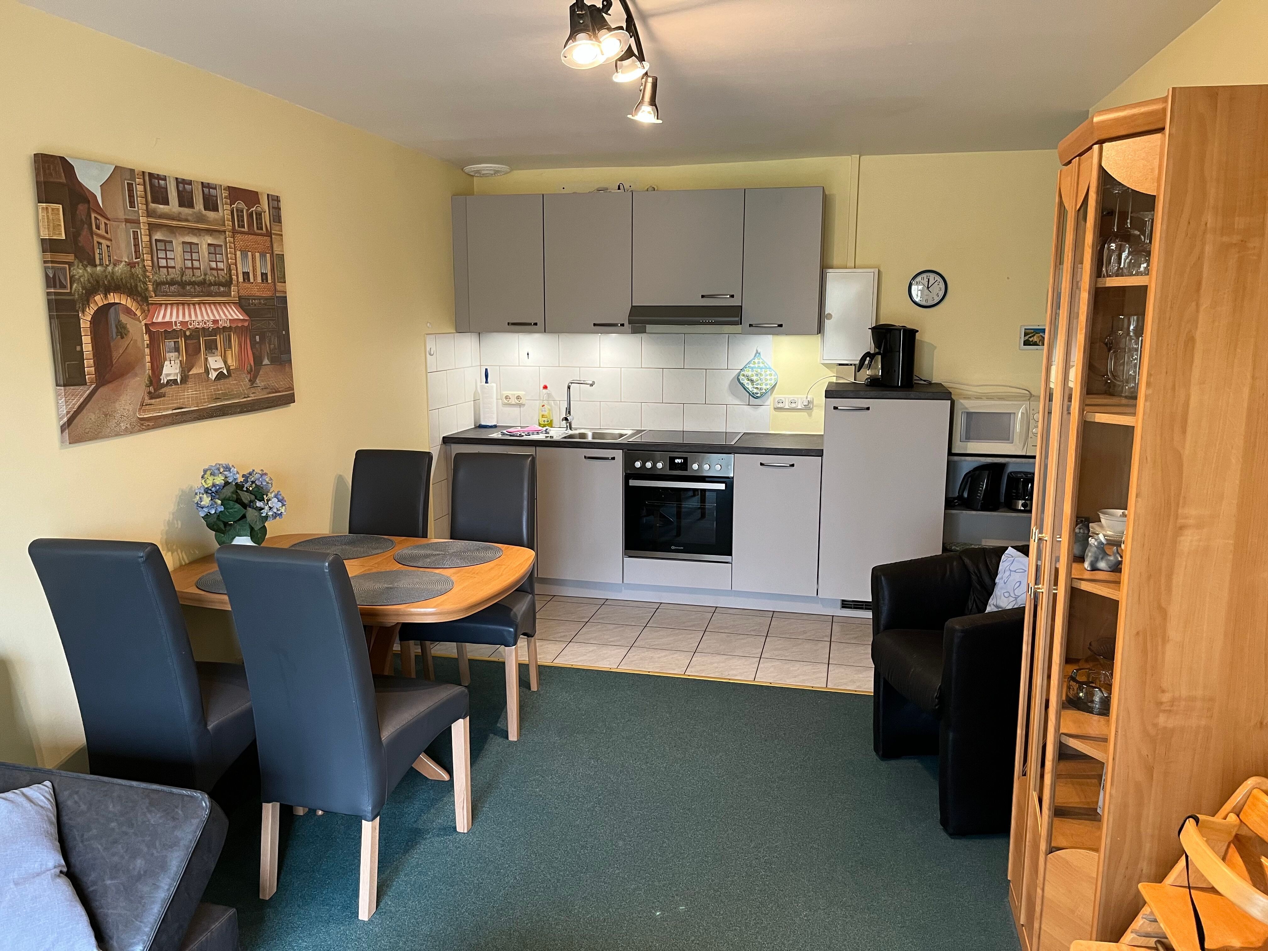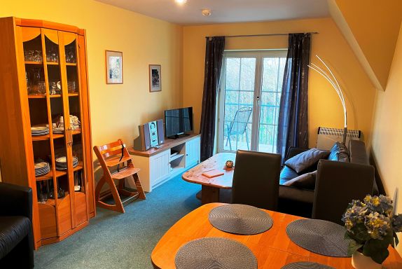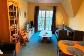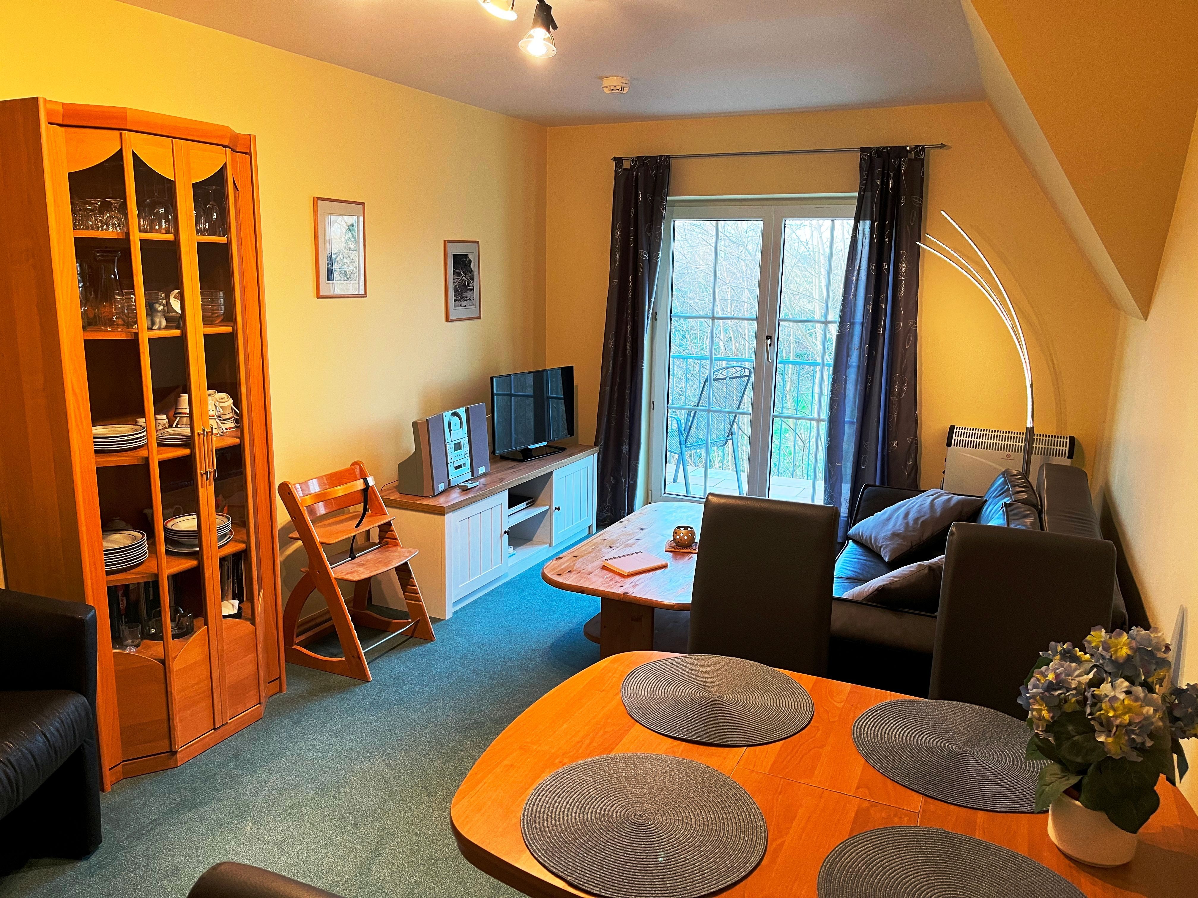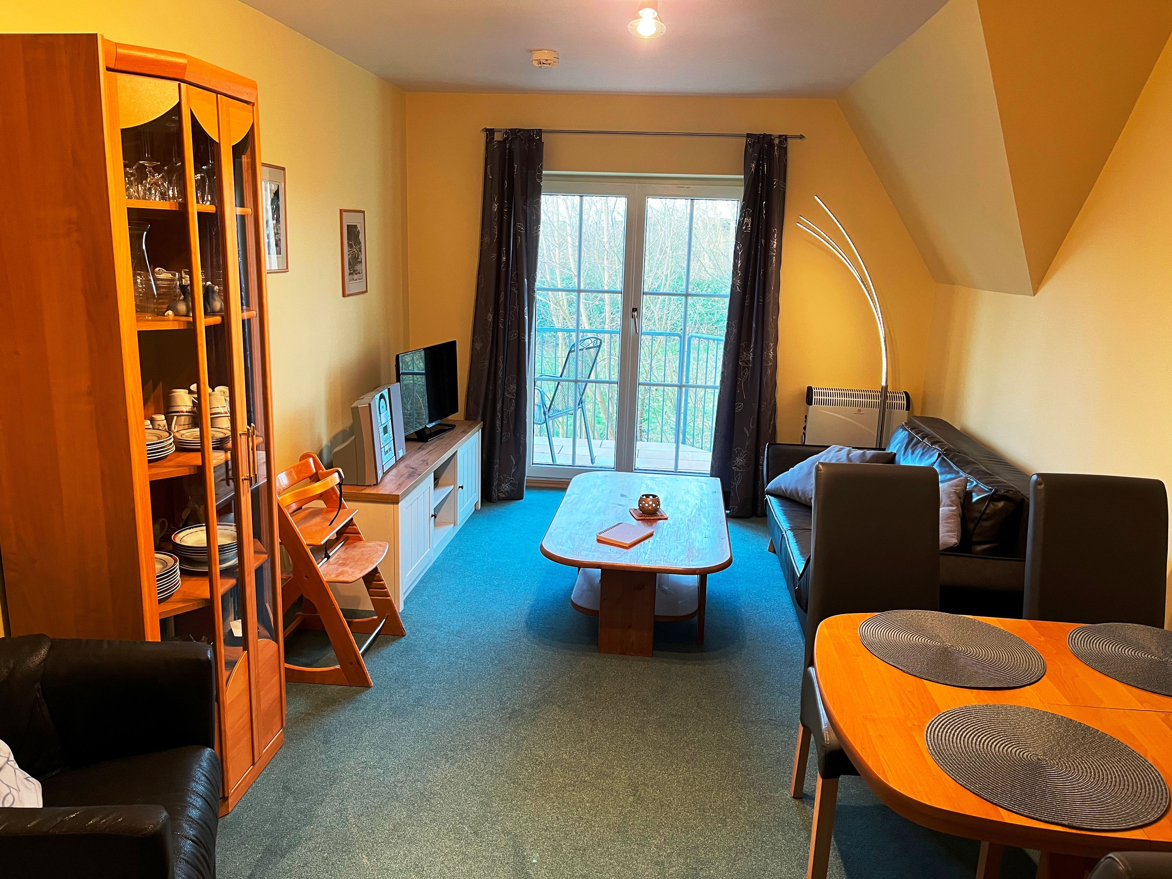 Die Ferienwohnung verfügt über ein Schlafzimmer mit Doppelbett und ein Wohnzimmer mit Schlafsofa für max. zwei Personen. Der große Balkon ist sowohl über das Wohnzimmer als auch das Schlafzimmer begehbar. Darüber hinaus gibt es eine moderne Küchenzeile mit Spülmaschine und einen Essbereich sowie ein Duschbad. WLAN, Bücher und Spiele stehen den Gästen in der Ferienwohnung zur Verfügung. Bettwäsche und Handtücher können gegen eine Gebühr dazu gebucht werden.
