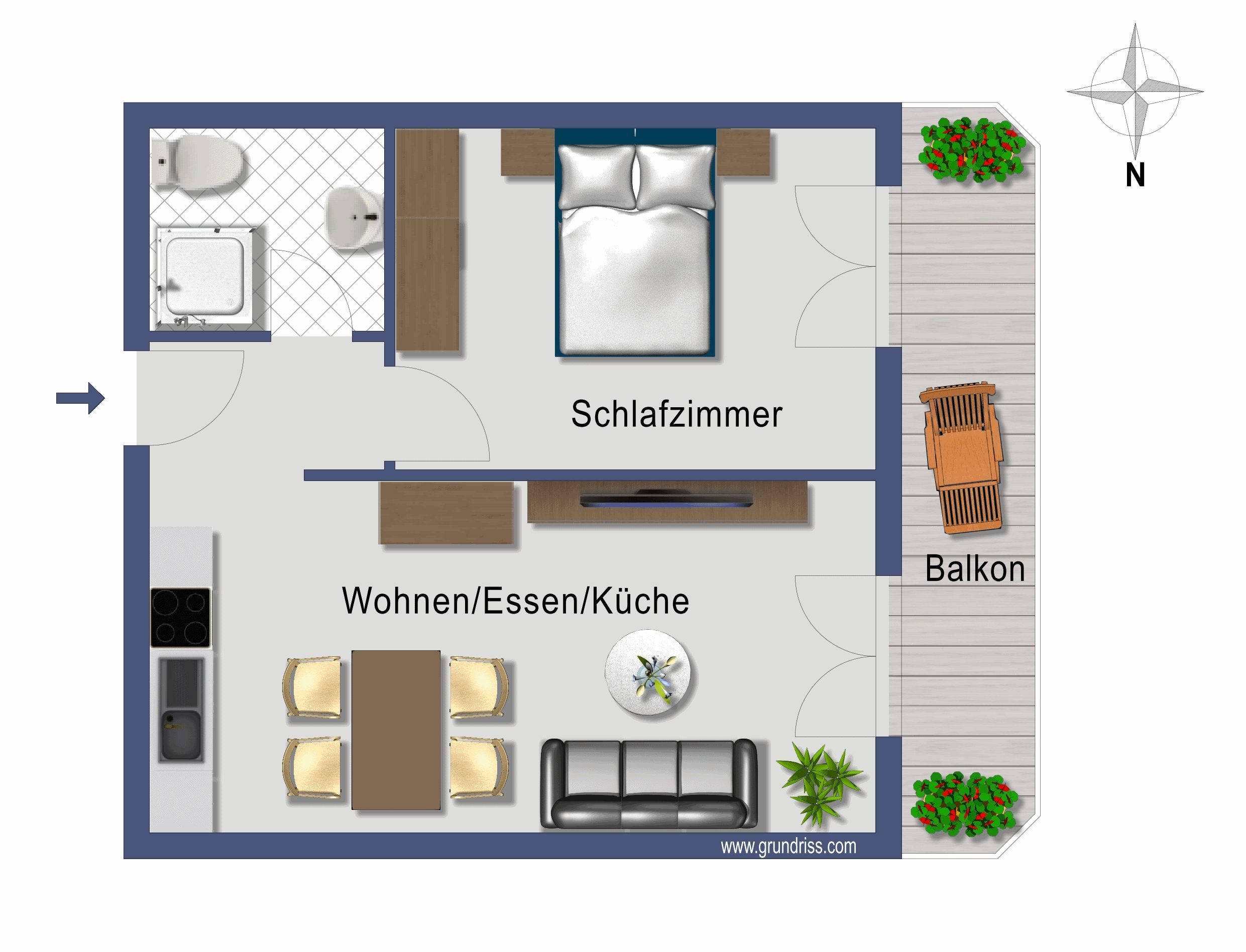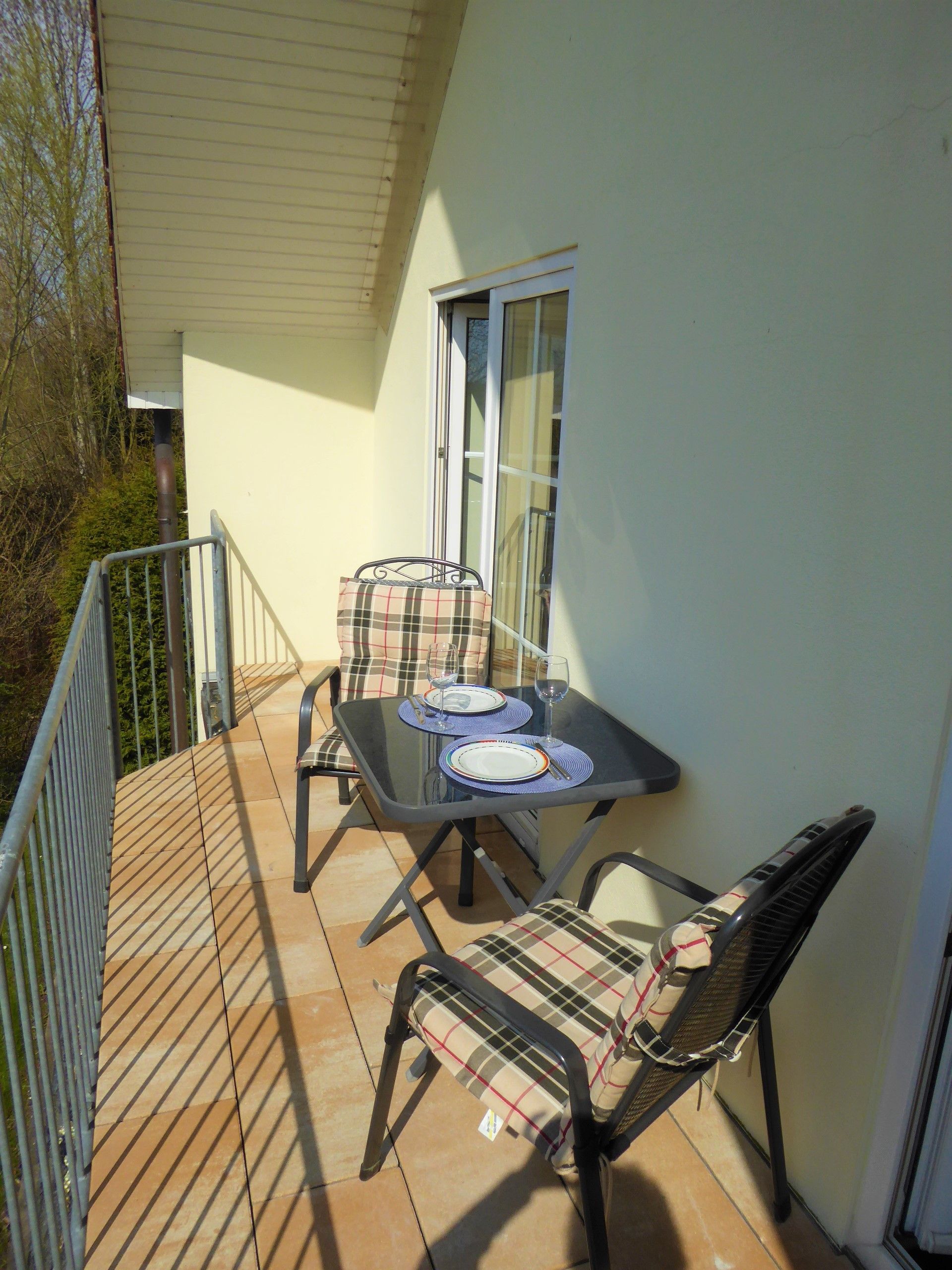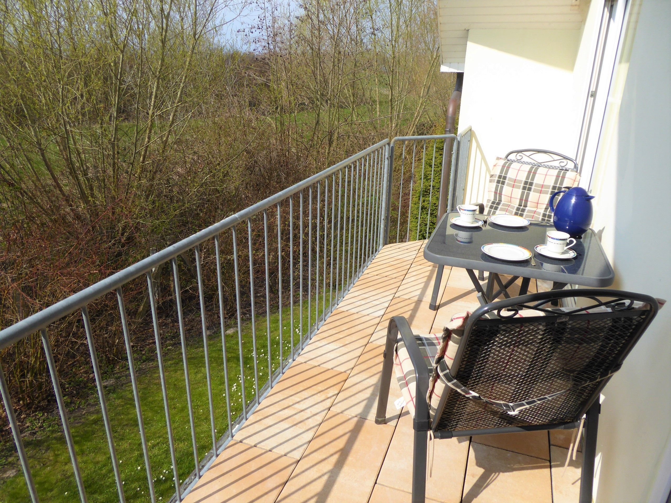 Die Ferienwohnung verfügt über ein Schlafzimmer mit Doppelbett und ein Wohnzimmer mit Schlafsofa für max. zwei Personen. Der große Balkon ist sowohl über das Wohnzimmer als auch das Schlafzimmer begehbar. Darüber hinaus gibt es eine moderne Küchenzeile mit Spülmaschine und einen Essbereich sowie ein Duschbad. WLAN, Bücher und Spiele stehen den Gästen in der Ferienwohnung zur Verfügung. Bettwäsche und Handtücher können gegen eine Gebühr dazu gebucht werden.