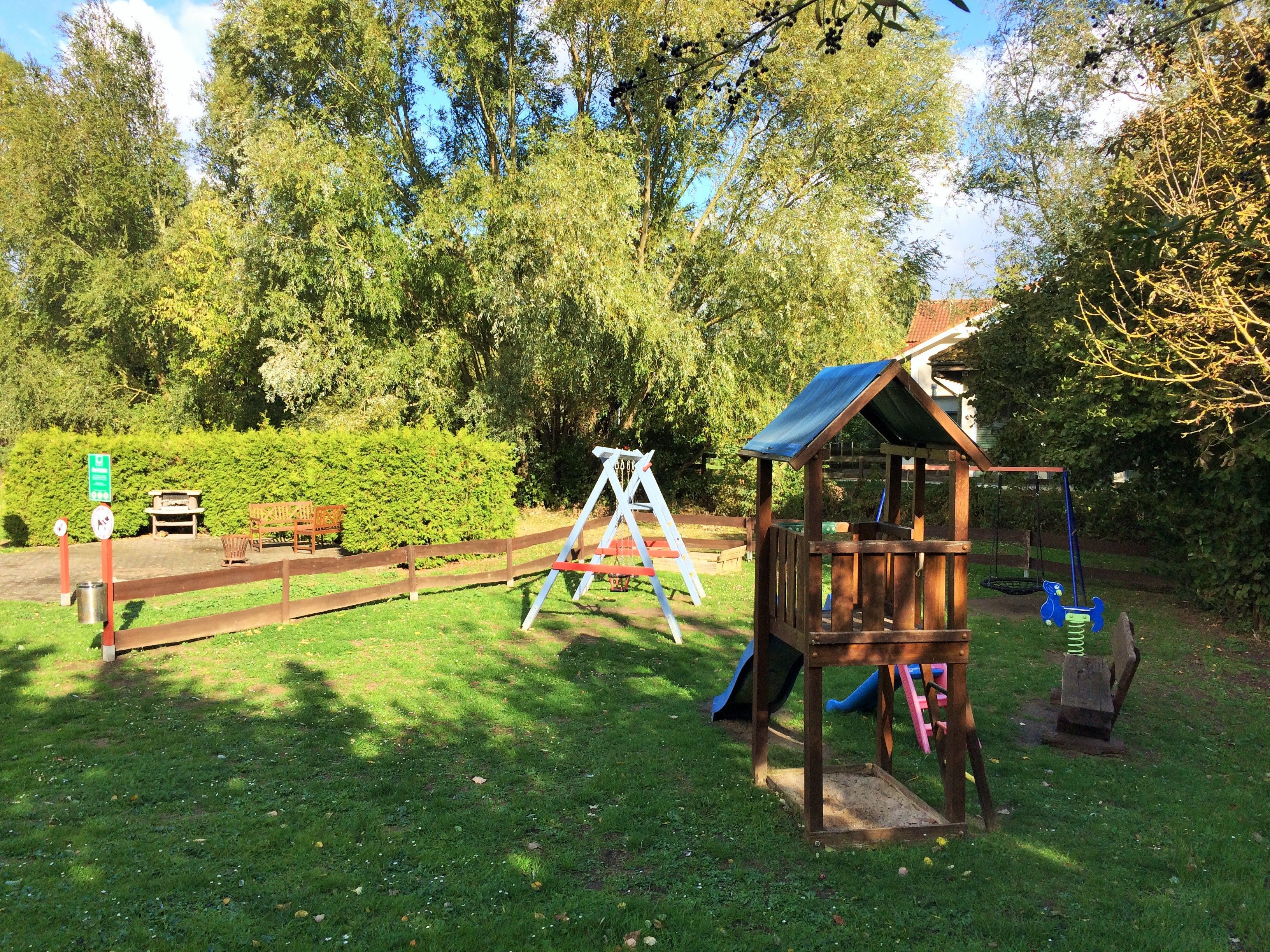 Auf der Außenanlage gibt es einen Grillplatz, eine Liegewiese, eine Boule-Bahn und einen Spielplatz. Fahrräder können in einem abschließbaren Nebengebäude oder in Fahrradständern draußen untergebracht werden.