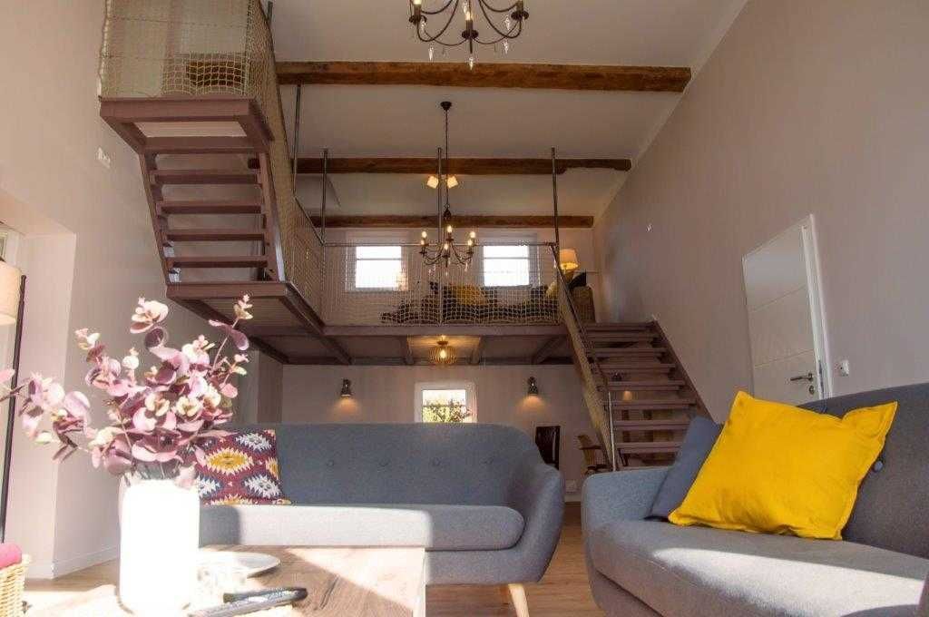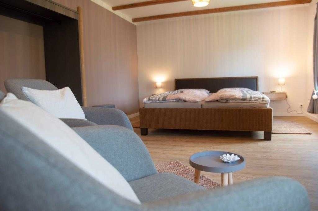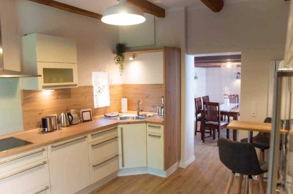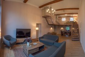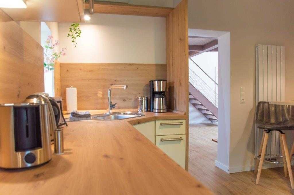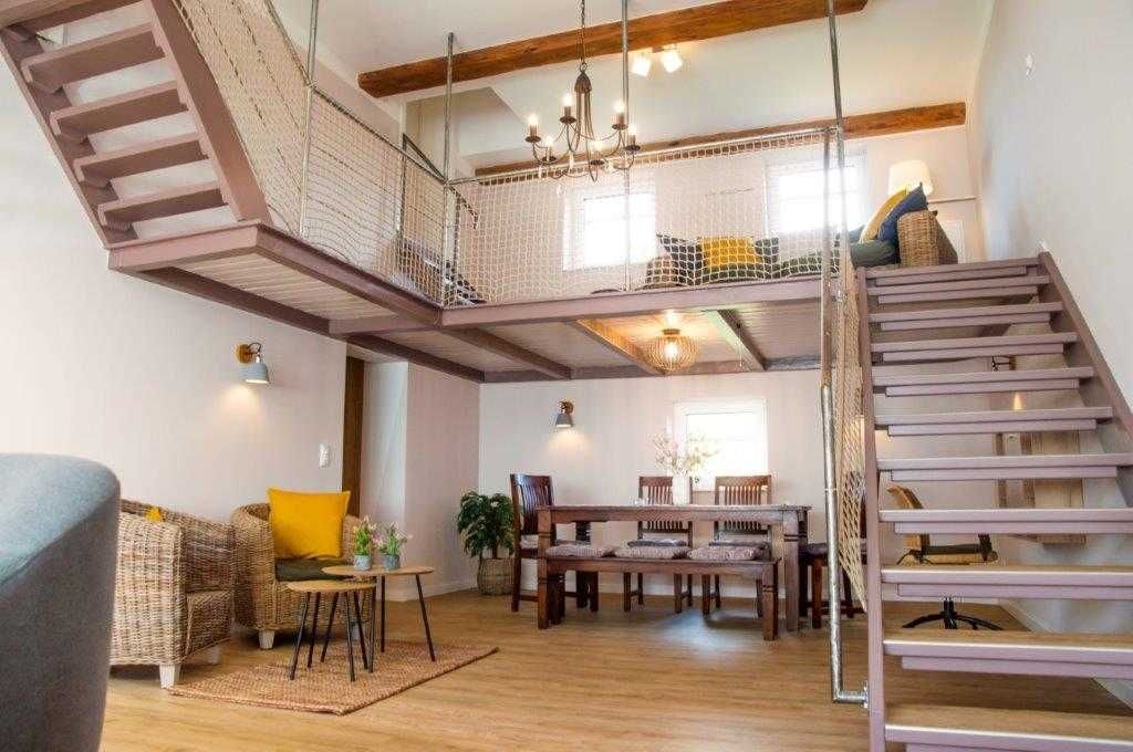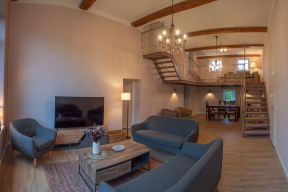 Die Wohnung wurde in einem alten landwirtschaftlichen Gebäude errichtet. Hierbei wurden die ursprünglichen Wohnräume für Landarbeiter und die Scheunendurchfahrt für die Heuernte vergangener Tage vereint und so eine Wohnung in mehreren Ebenen und einem zentralem Wohnzimmer mit einer Deckenhöhe von 4 Metern geschaffen.