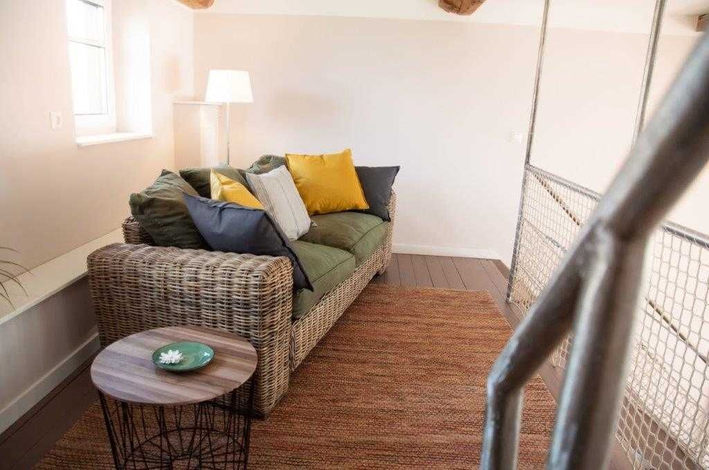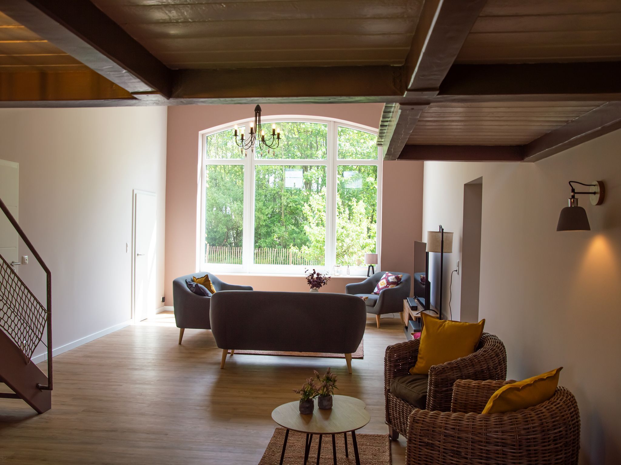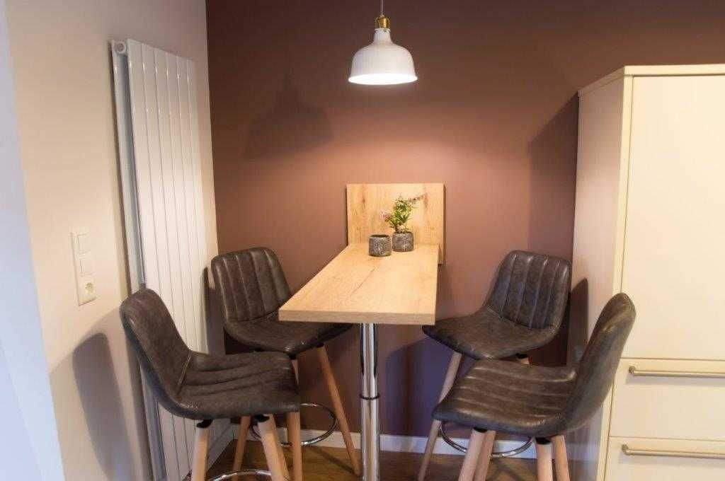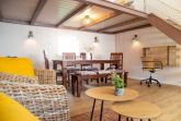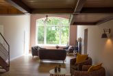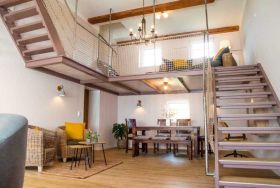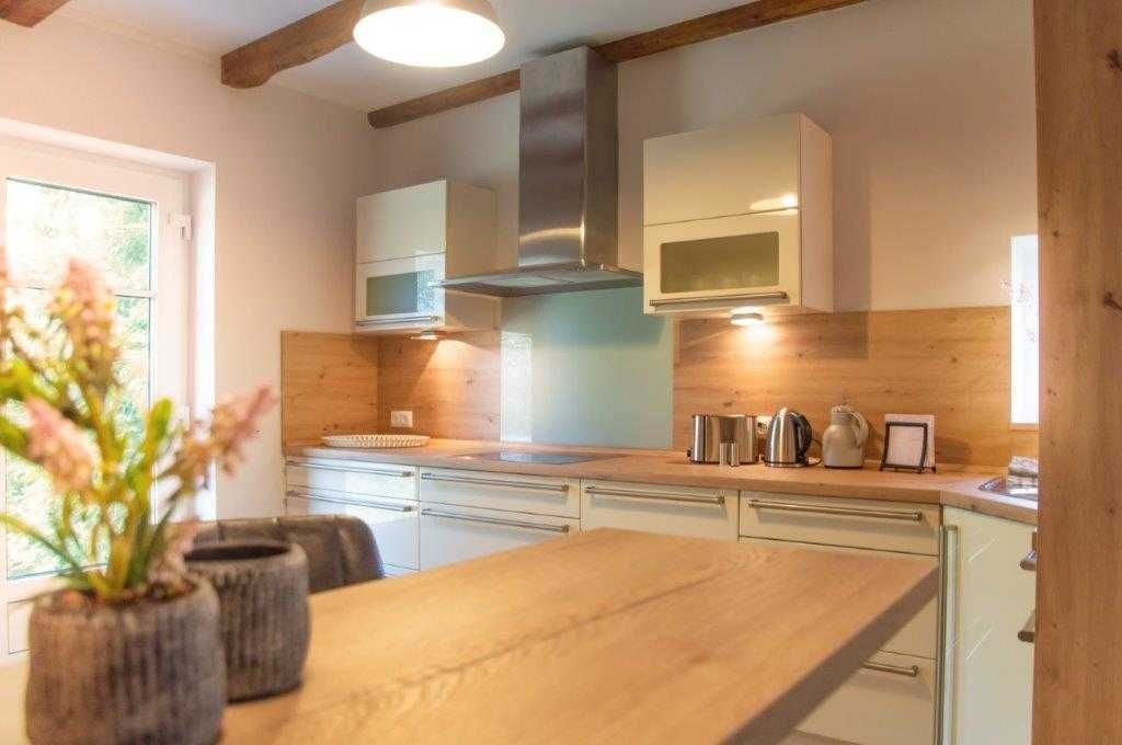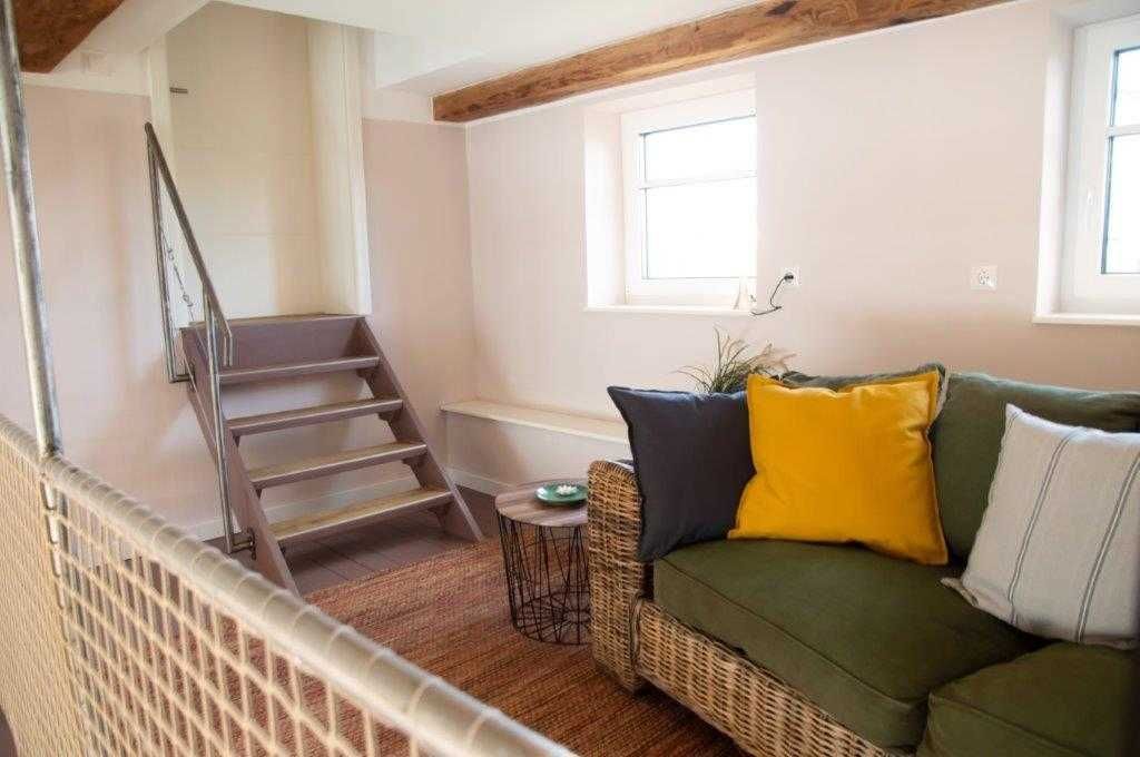 Die Wohnung wurde in einem alten landwirtschaftlichen Gebäude errichtet. Hierbei wurden die ursprünglichen Wohnräume für Landarbeiter und die Scheunendurchfahrt für die Heuernte vergangener Tage vereint und so eine Wohnung in mehreren Ebenen und einem zentralem Wohnzimmer mit einer Deckenhöhe von 4 Metern geschaffen.