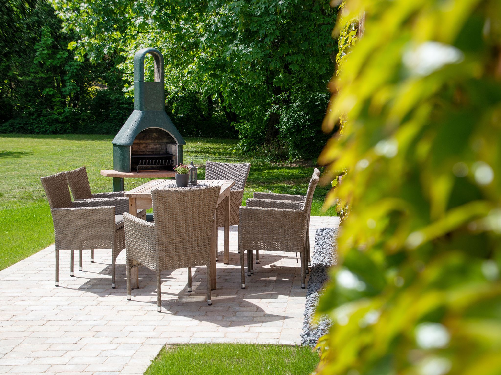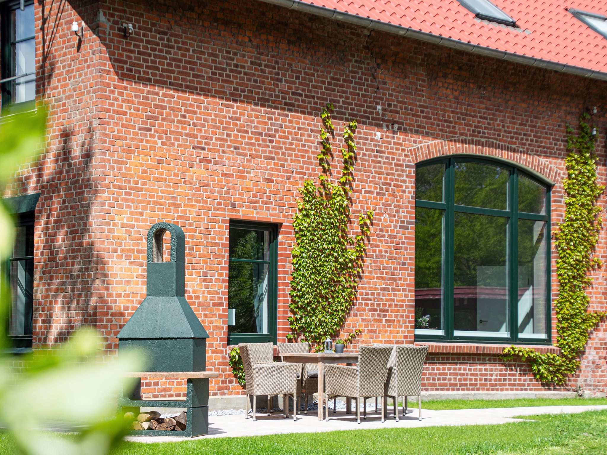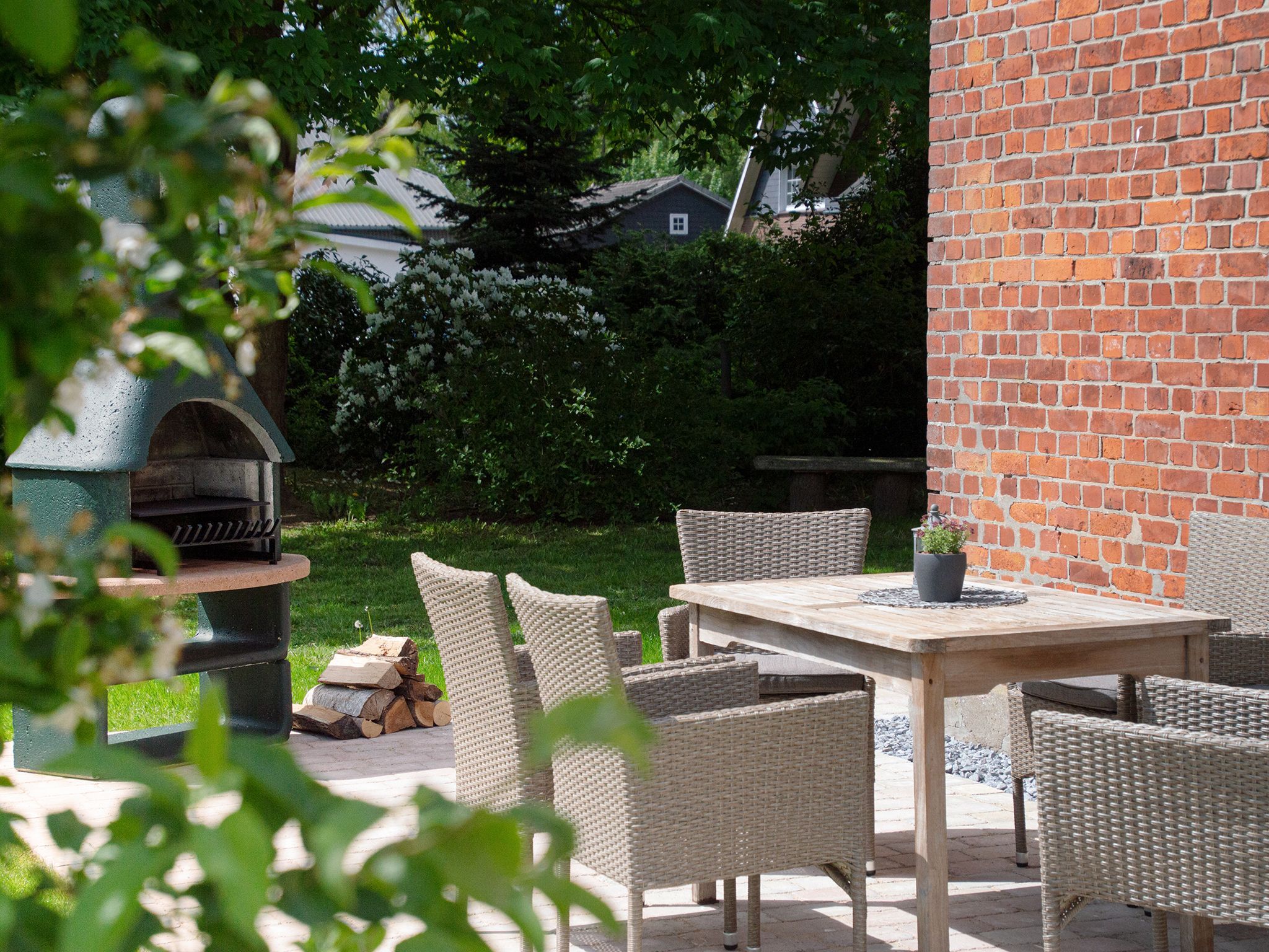 Die Wohnung hat einen eigenen Eingang, zudem eine Frühstücksterrasse mit offenem Kamin, eine ca. 1.400 m2 große Flächenkombination aus Spielrasen, kleinem Waldstück und ca. 150 m2 eingezäunten Wildteich.