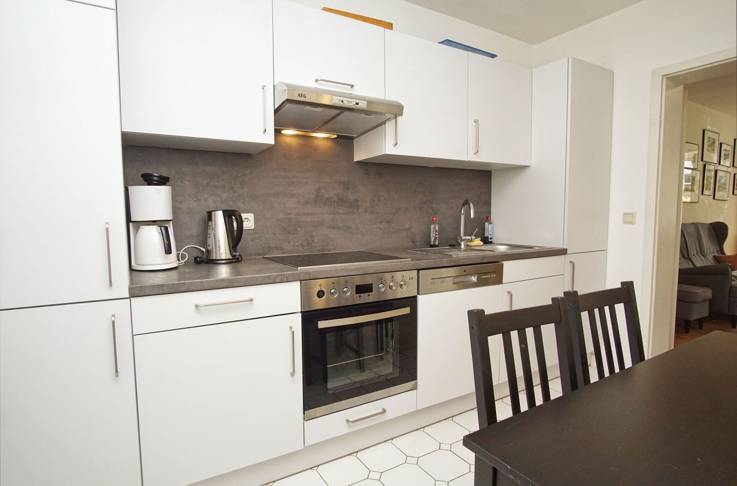KÜCHE // offene Küche mit Esstisch, Ceranfeld, Kühlschrank mit Gefrierfach, Backofen, Toaster, Wasserkocher, Kaffeemaschine, reichlich Besteck, Geschirr und Küchenutensilien ++